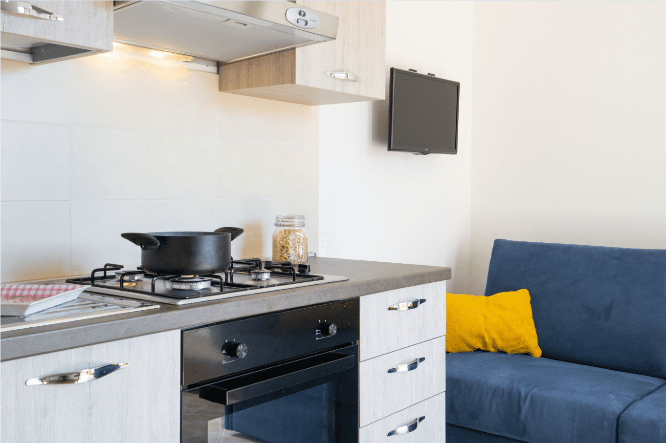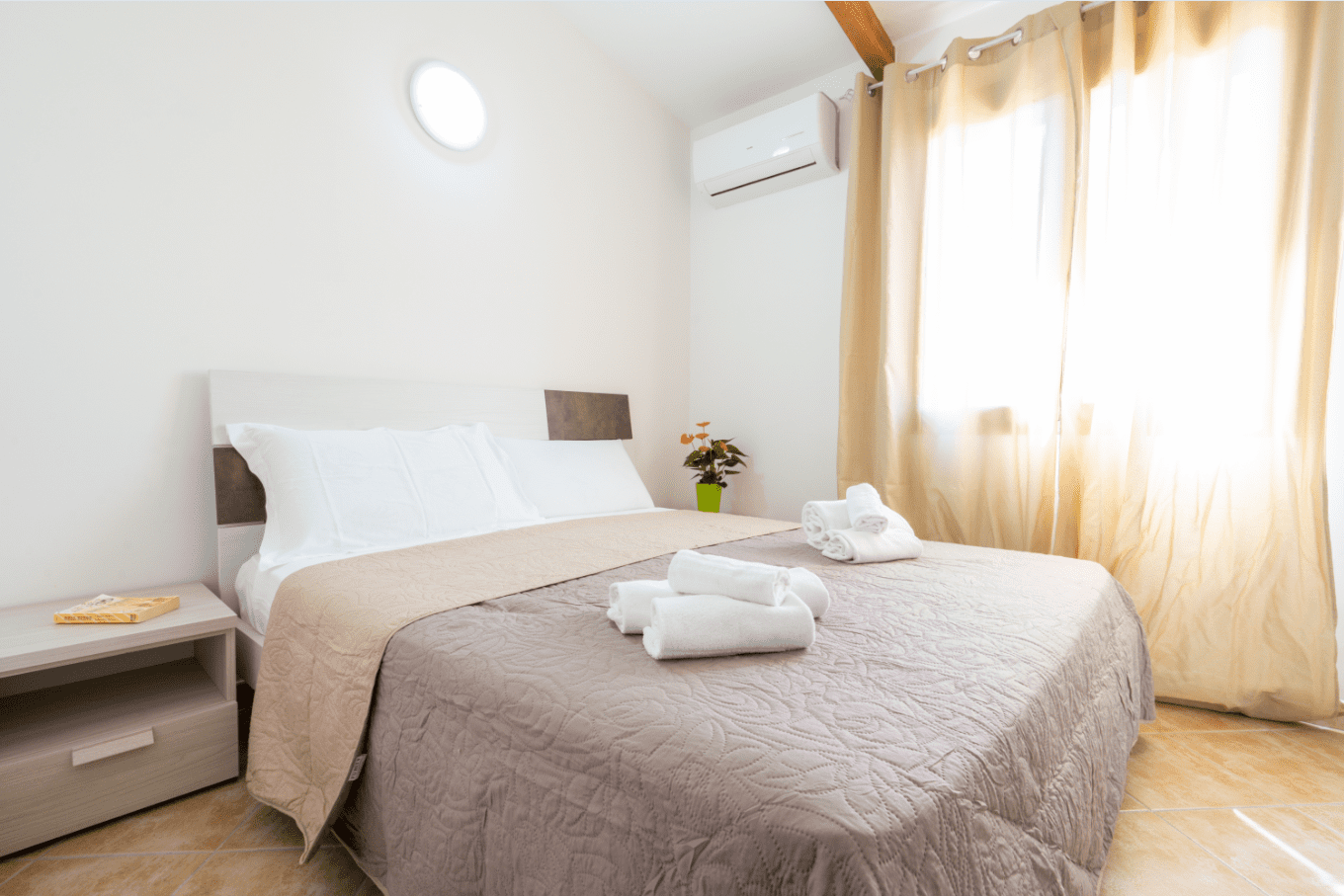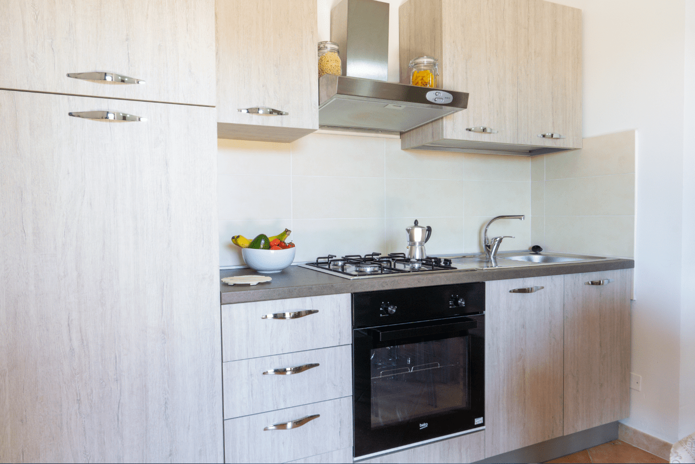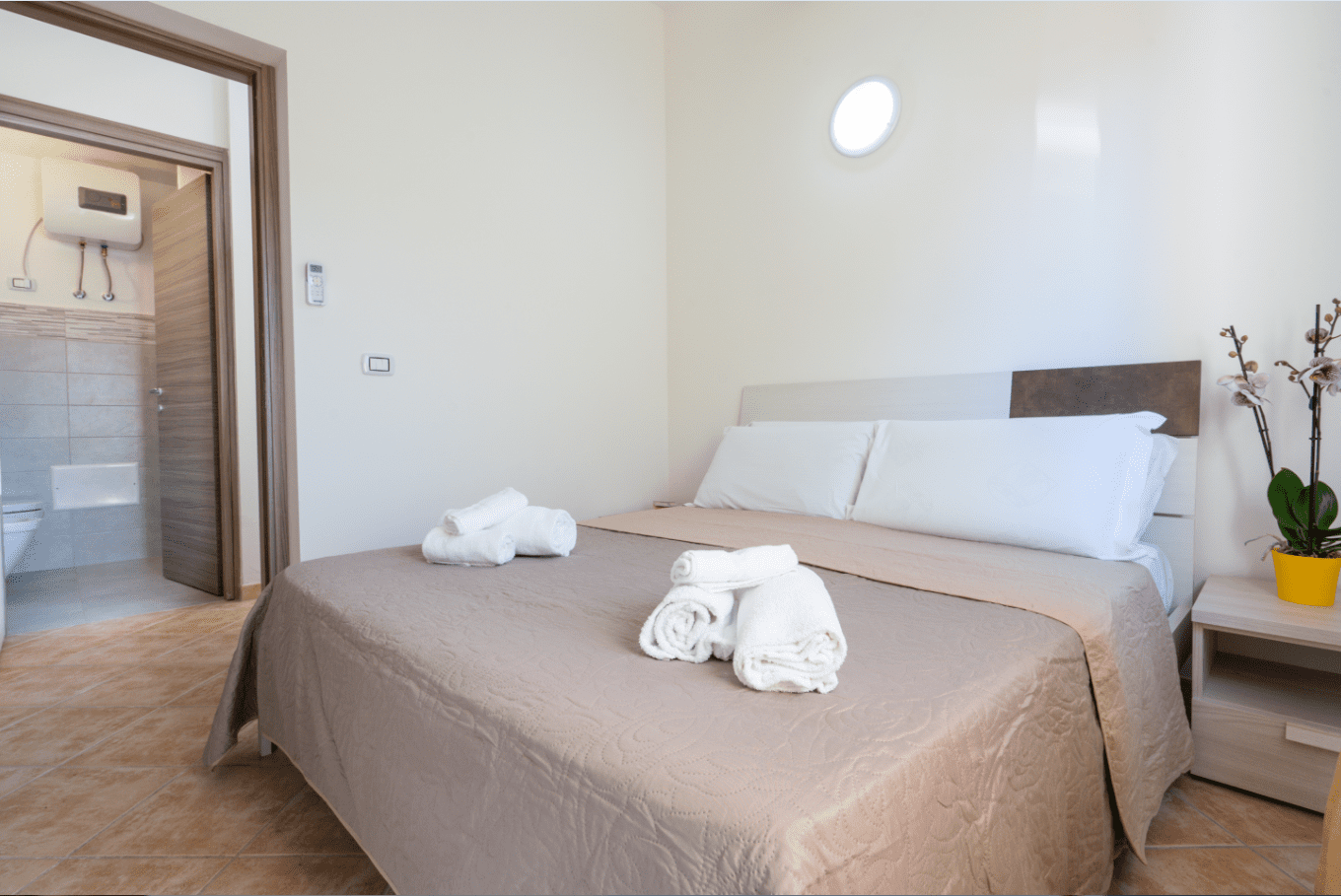 Evocative view, panoramic swimming pool and private outdoor space. Choose this two-room apartment immersed in the Mediterranean scrub. The apartment includes a double bedroom, a bathroom with shower and a living room with sofa bed and kitchenette. This apartment, which can accommodate up to three people, is furnished and equipped to make you enjoy your holiday to the fullest. All accommodations have an outdoor area for exclusive use, relaxation and tranquility are guaranteed. For you, among the extra special attention: bathroom and bed linen set included.