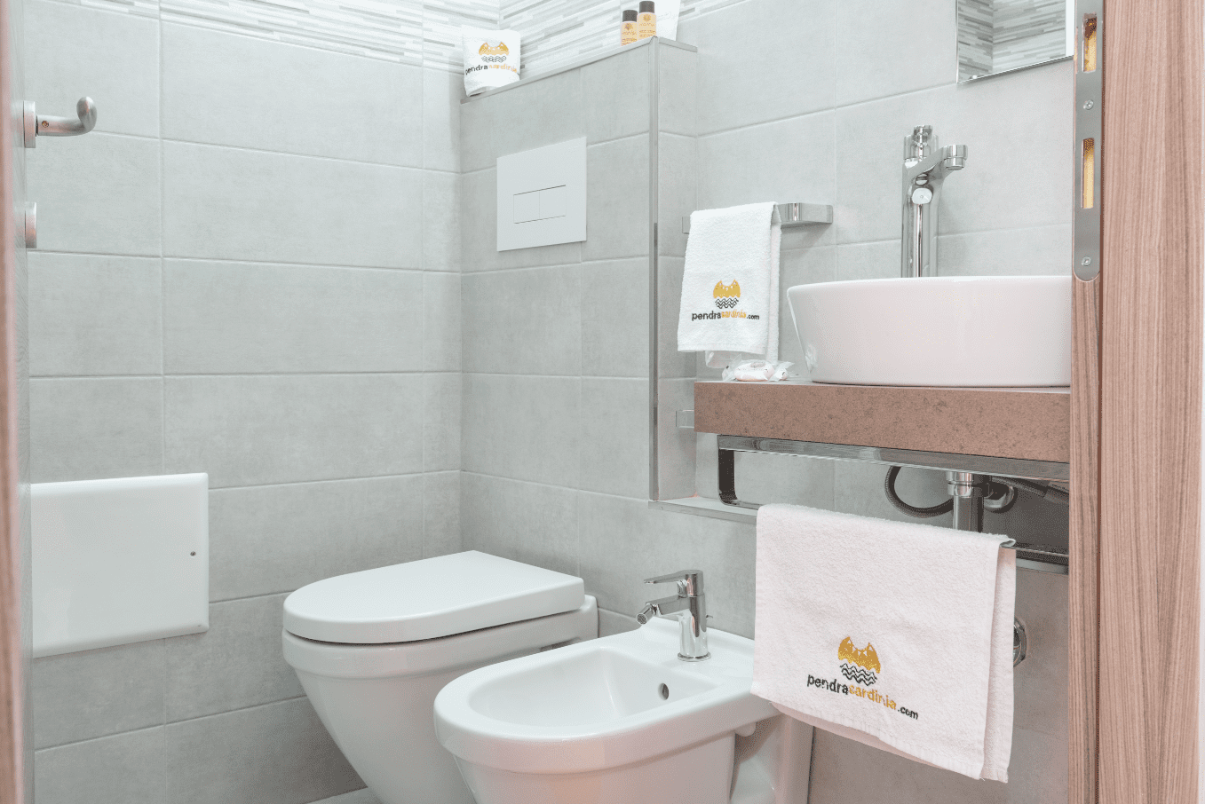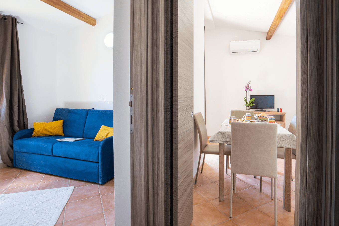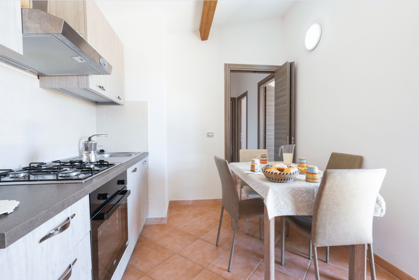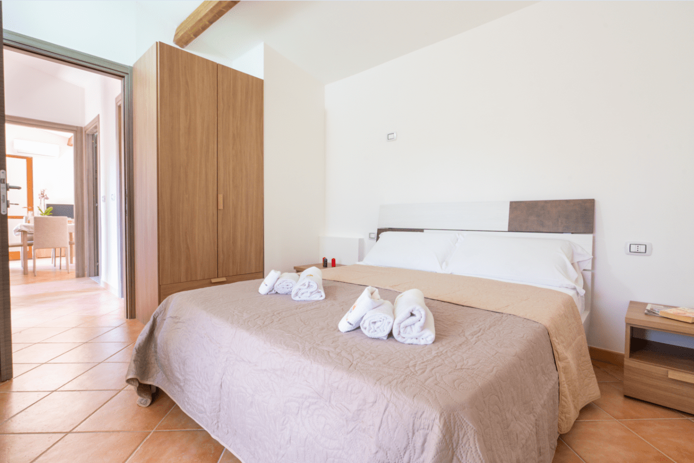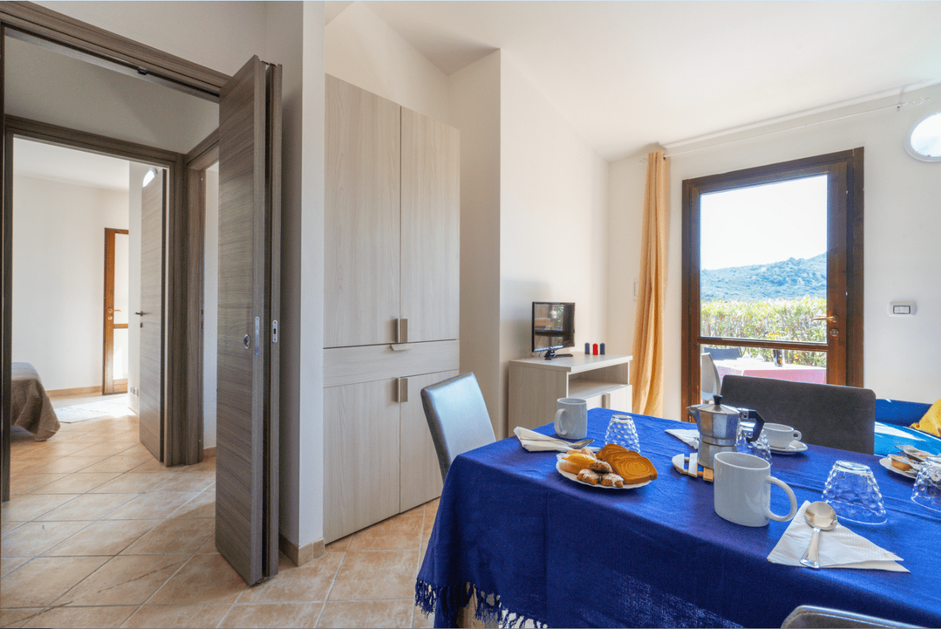 Evocative view, panoramic swimming pool and private outdoor space. Choose this three-room apartment immersed in the Mediterranean scrub. The apartment includes two double bedrooms, two bathrooms with shower and a living room with sofa bed and kitchenette. This apartment, which can accommodate up to six people, is furnished and equipped to make you enjoy your holiday to the fullest. All accommodations have an outdoor area for exclusive use. For you, among the extra special attention: bathroom and bed linen set included.