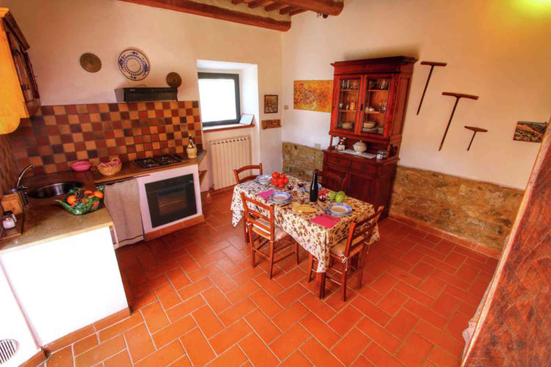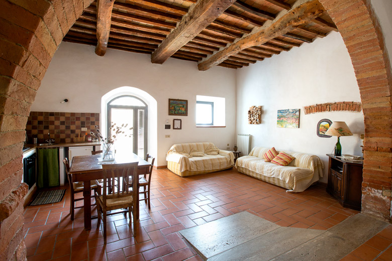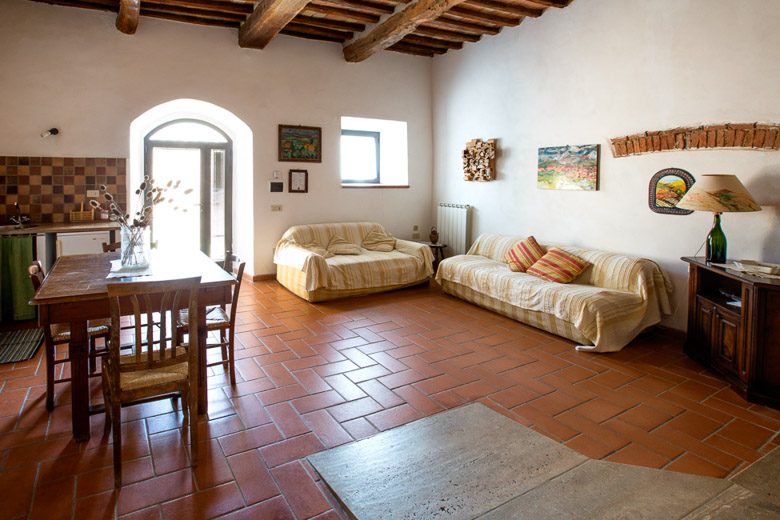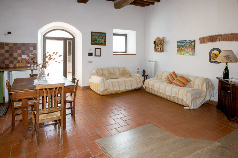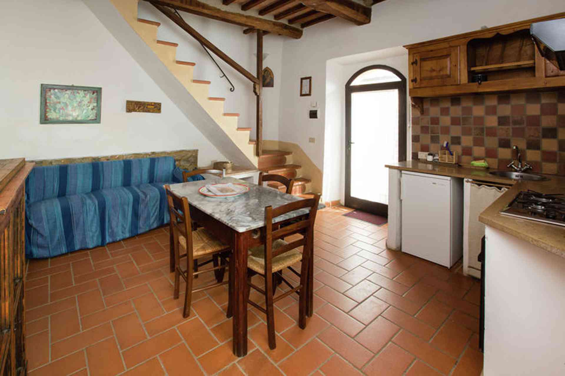 On the ground floor is the living room with kitchenette (with oven and view of Montalcino).