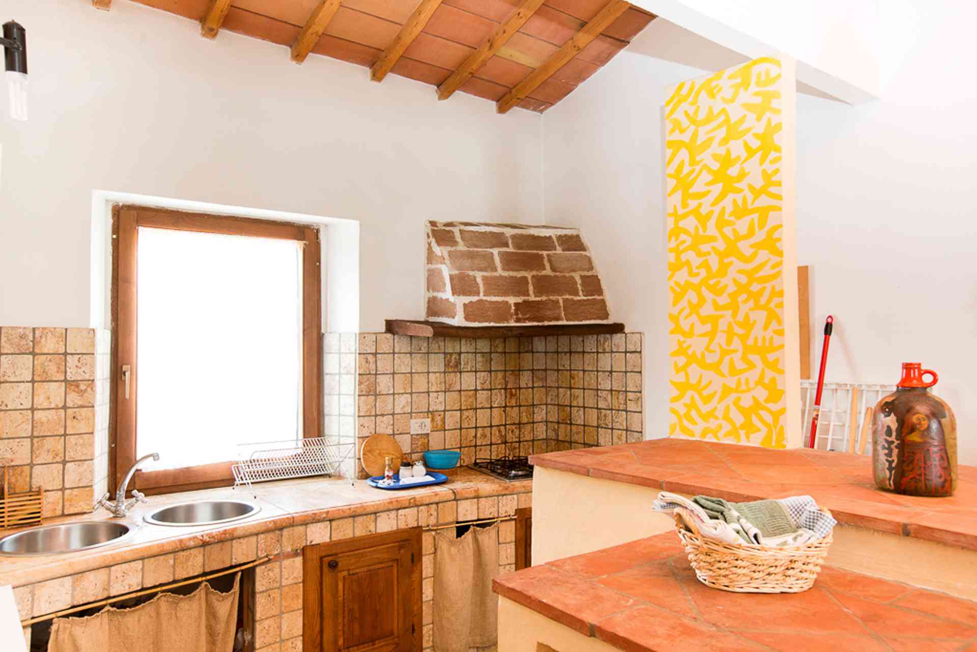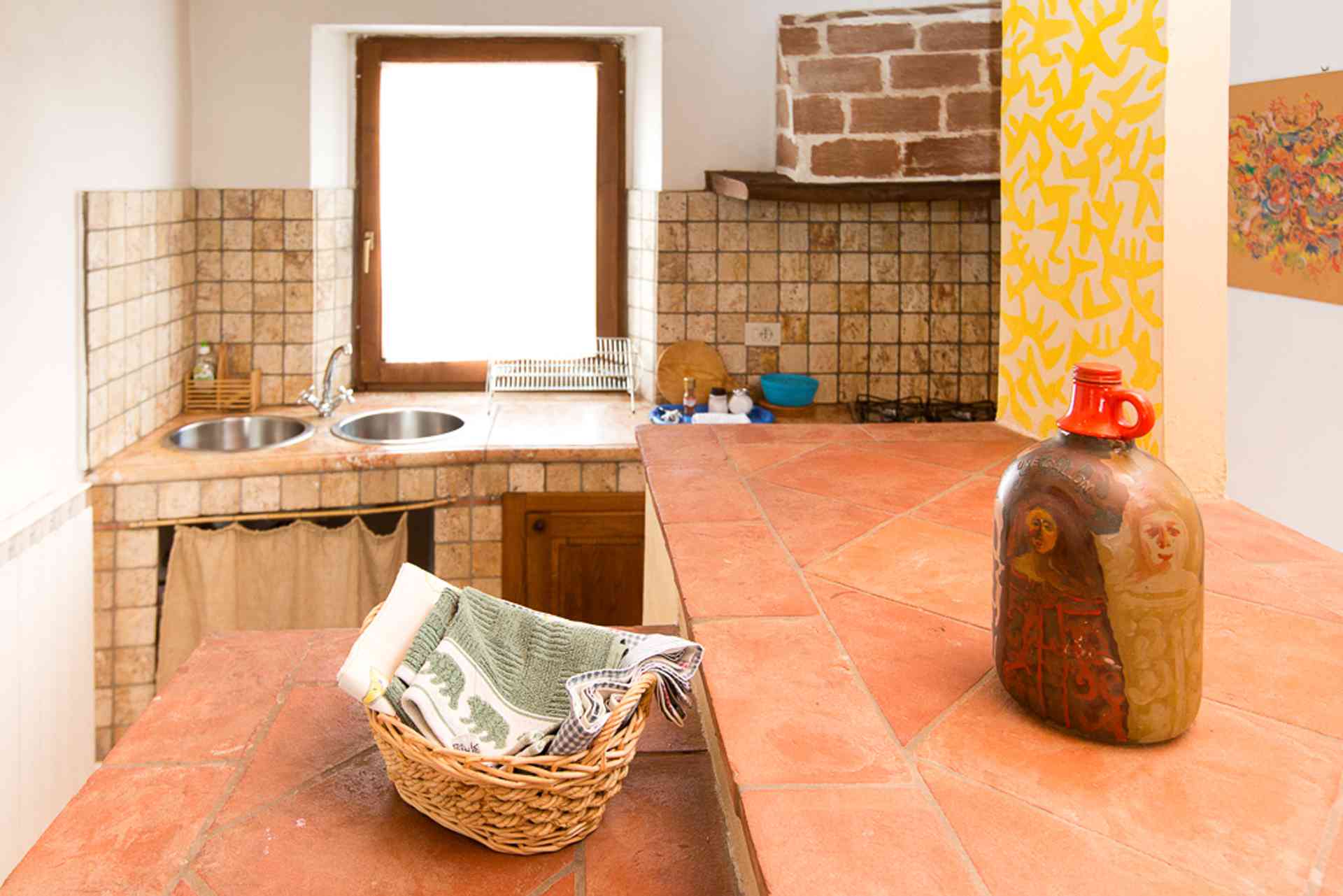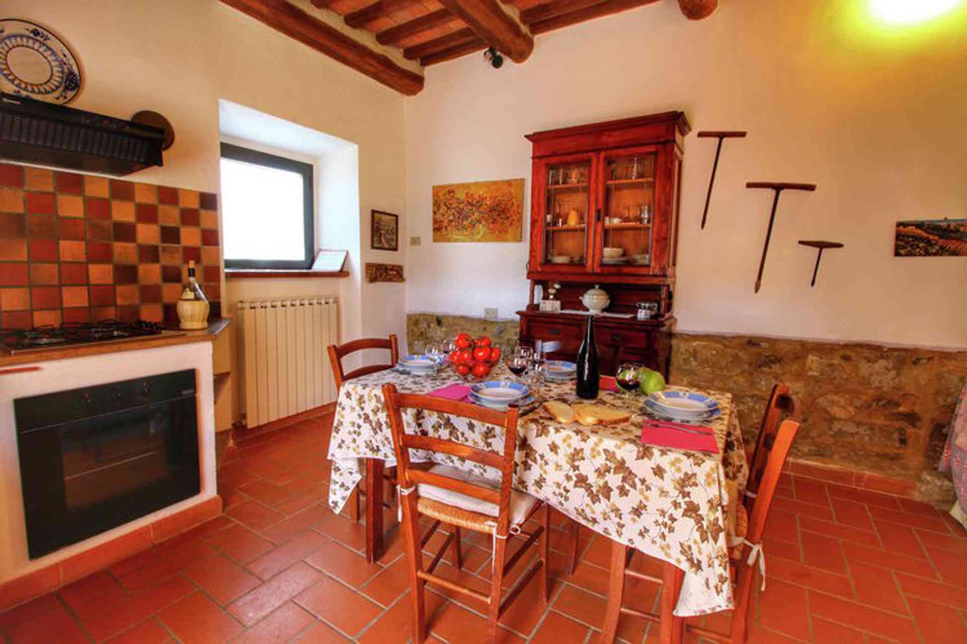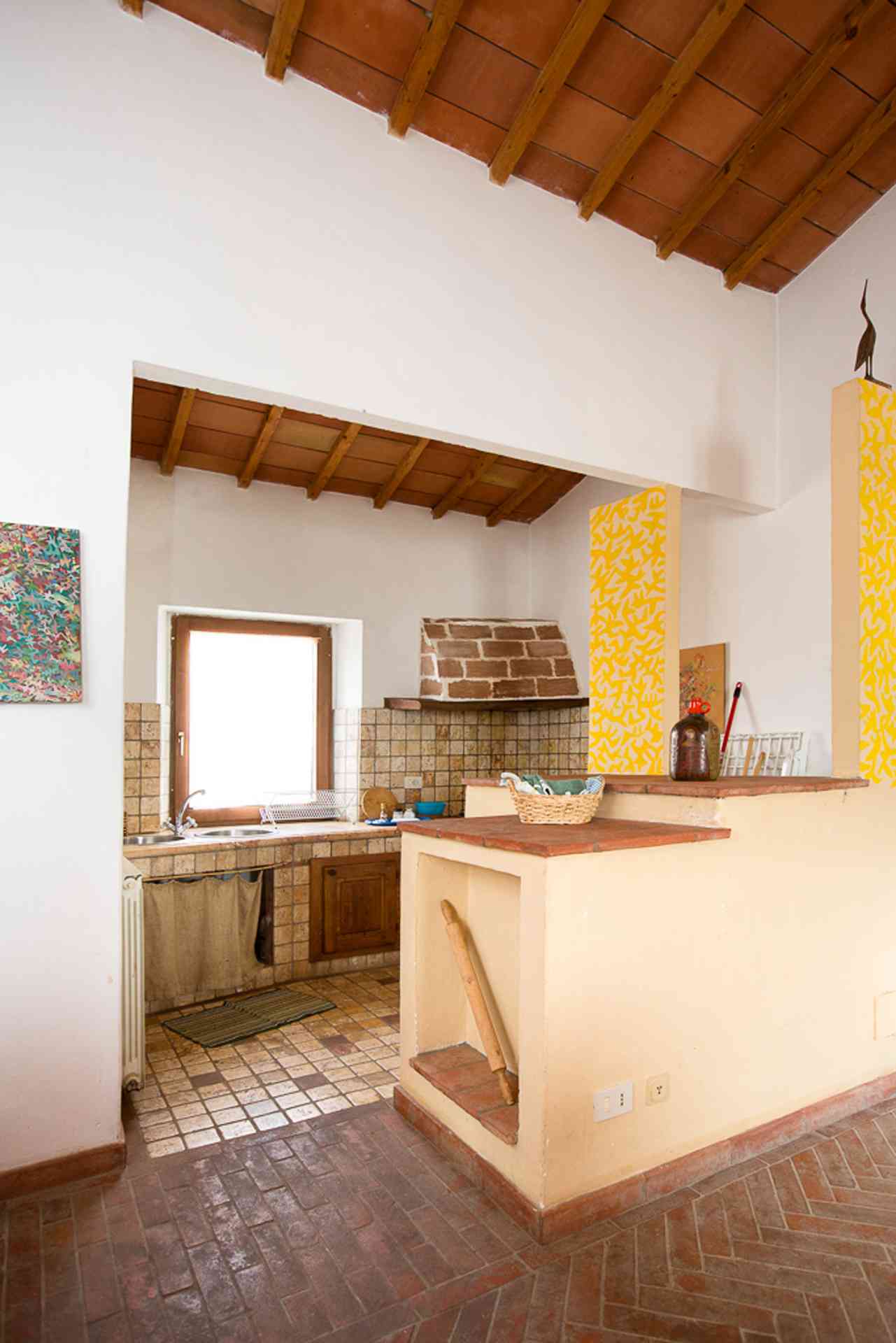 On the ground floor is the living room with kitchenette (with oven and view of Montalcino).