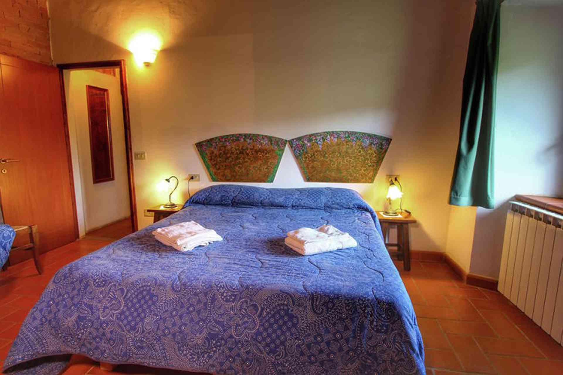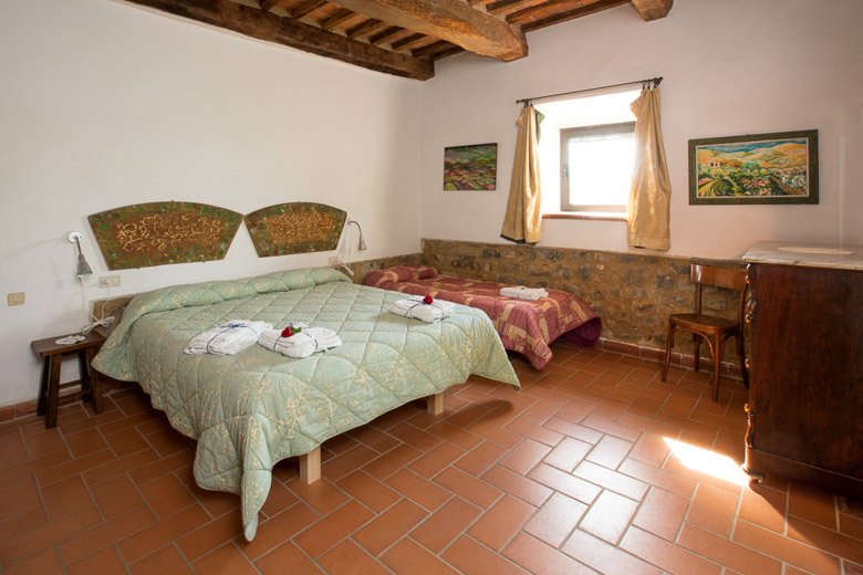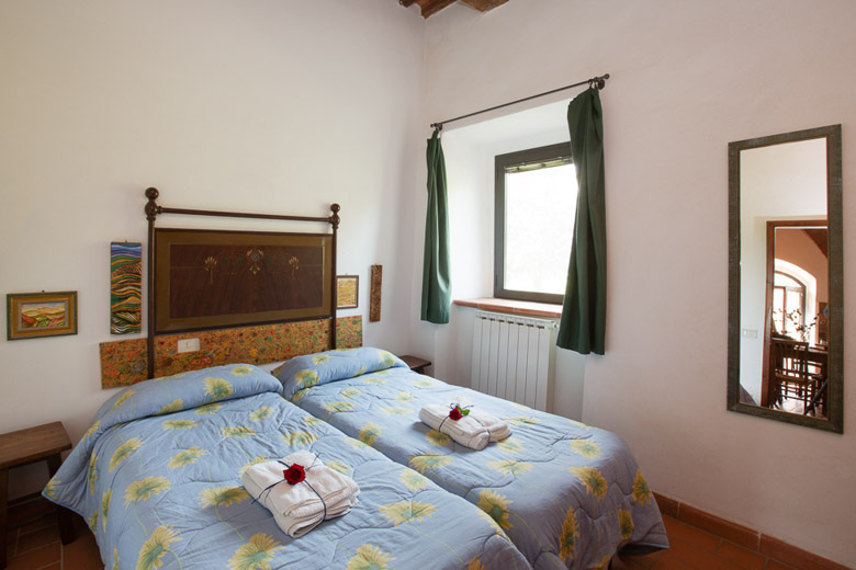A staircase leads to the first floor, which features a full bathroom (with shower) and two bedrooms, from which you can admire beautiful views of Montalcino.