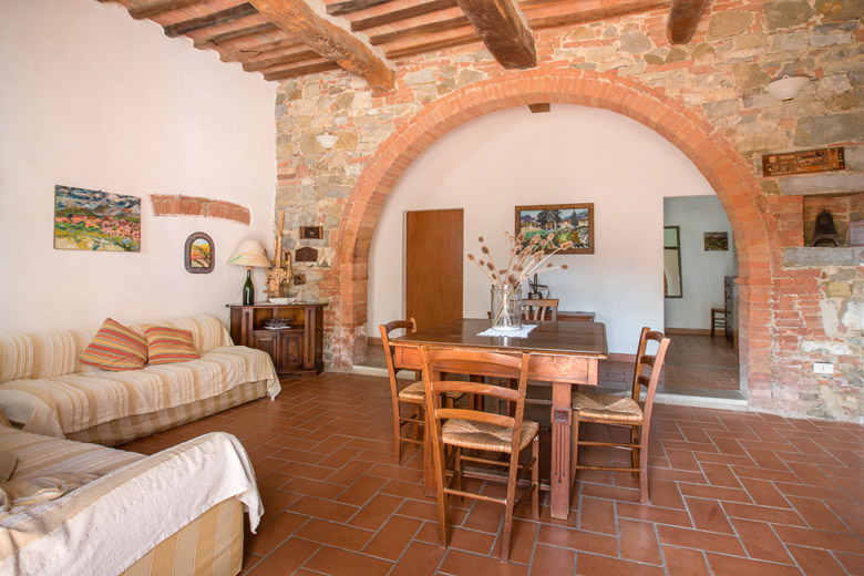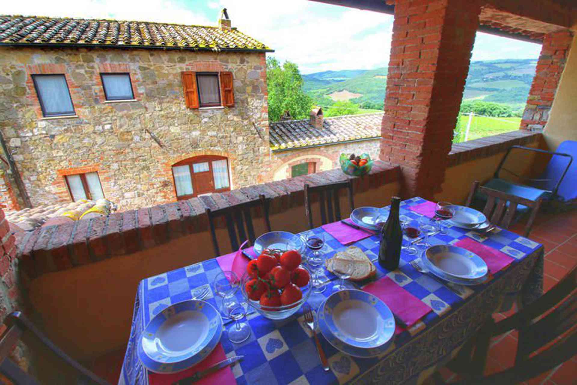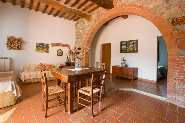 The apartment is located on the first floor with private entrance from the loggia. It consists of a spacious living room with kitchenette and sofa bed. A   few steps up is the sleeping area with two bedrooms, a bathroom (with shower), and an attic bedroom. A   stunning view of Montalcino is visible from the master bedroom. Outdoor area with table situated under the loggia. Bedrooms and kitchen are equipped with window screens.