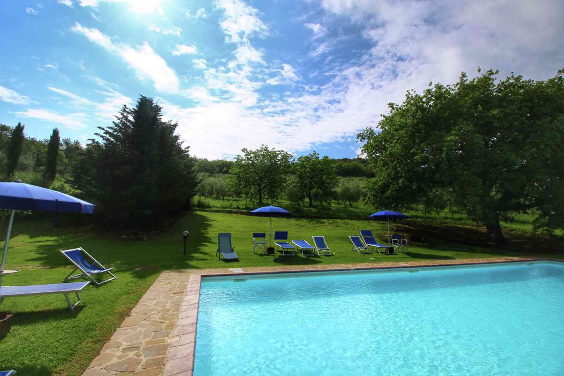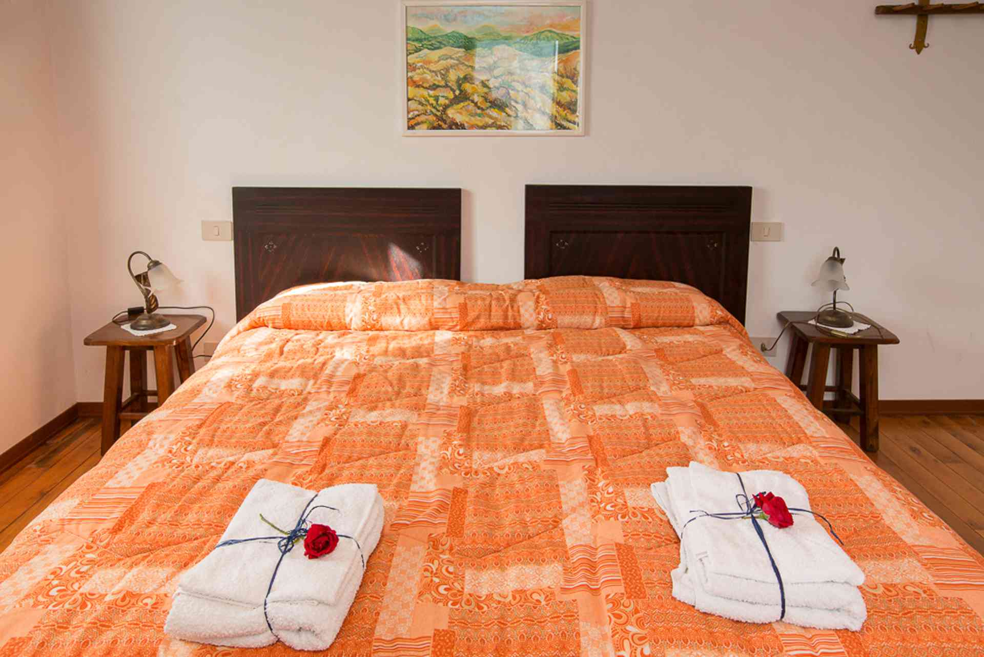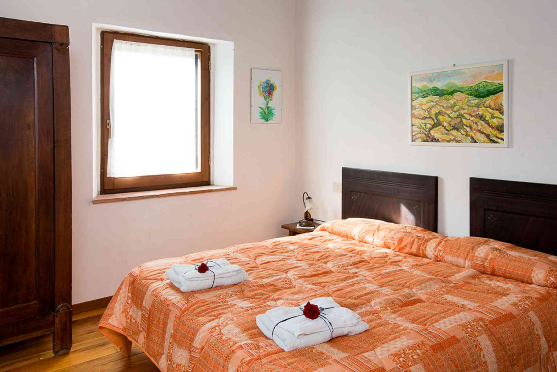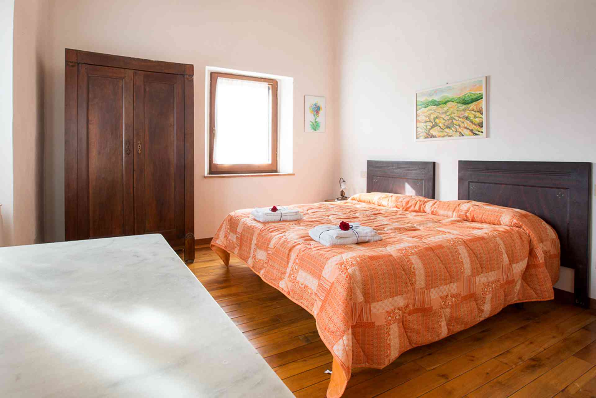 The apartment is located on the first floor with private entrance from the loggia. It consists of a spacious living room with kitchenette (with oven) and a splendid old fireplace with internal seating. Off to one side of the living room is the master bedroom with ensuite bathroom (with shower). On the other side of the living room are two bedrooms, a full bathroom (with shower), and an outdoor area with table under the loggia. All rooms (bedrooms, kitchen, and baths) equipped with window screens.
