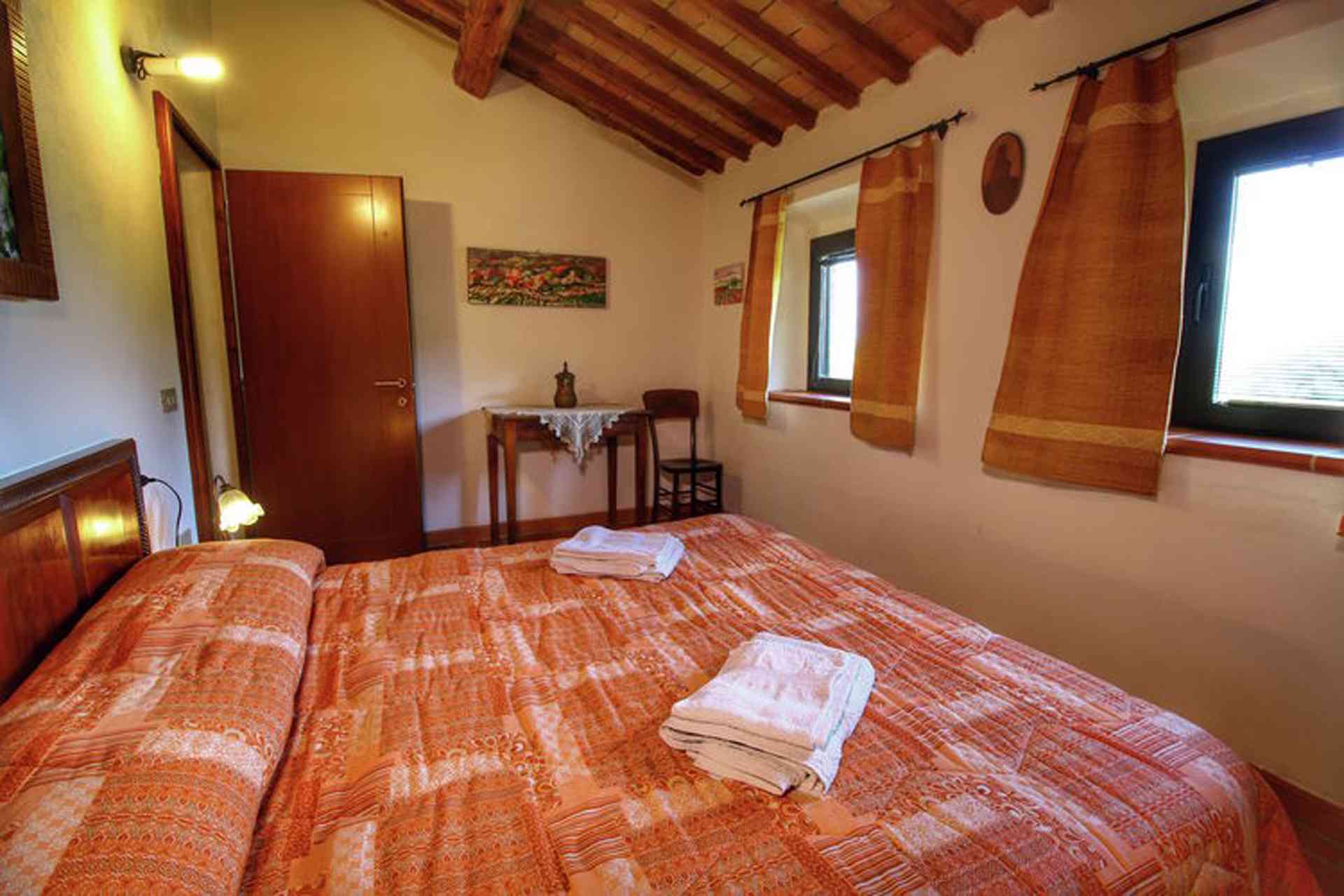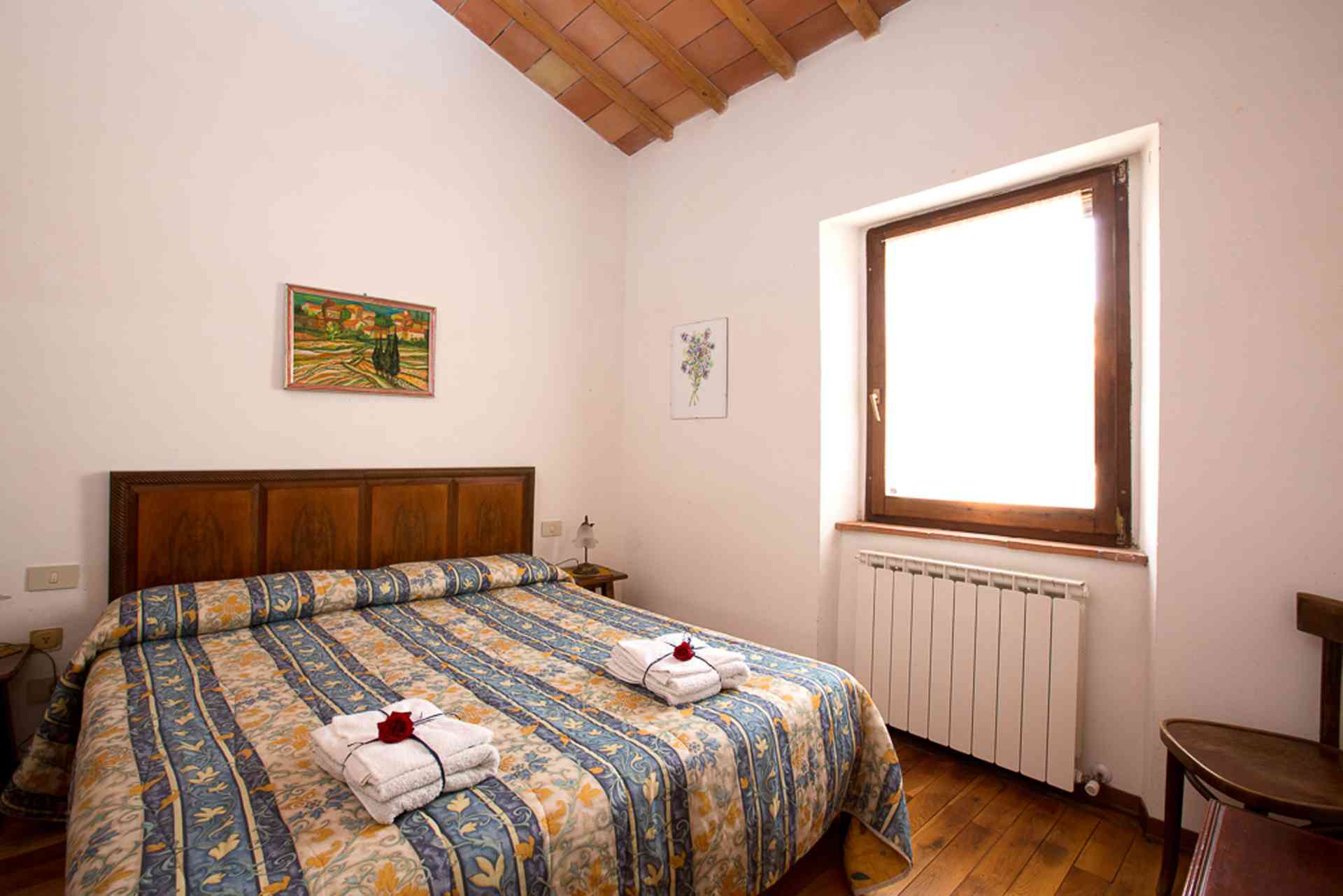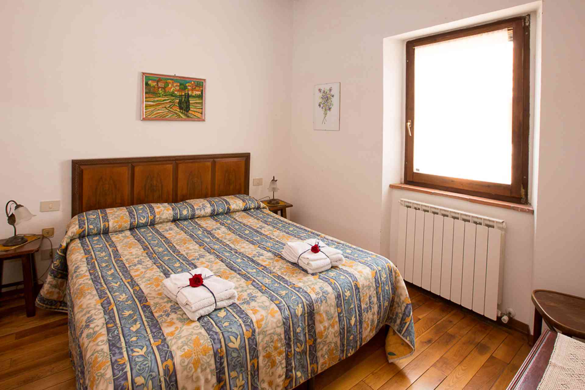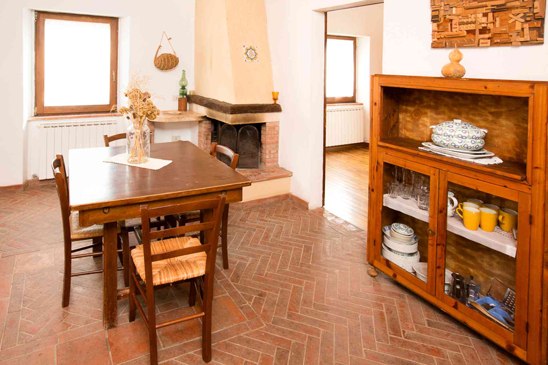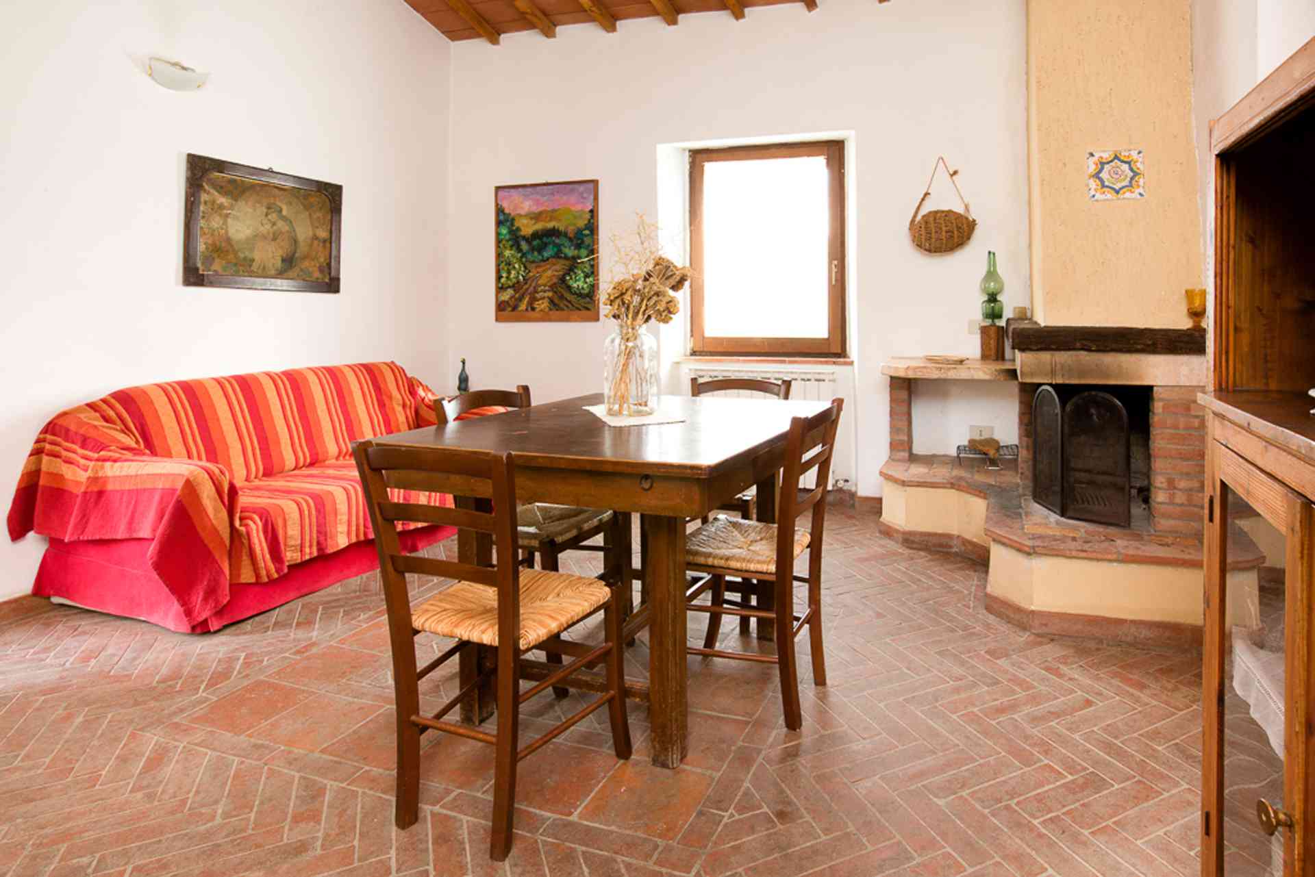 The apartment is located on the first floor with private entrance from an outdoor staircase. It consists ofa spacious living room and kitchenette with marble trim and corner fireplace; two bedrooms, each with hardwood floors, and a  full bathroom (with shower). A   gorgeous view of Montalcino is visible from the master bedroom. Outdoor space with table and canopy. All rooms (bedrooms, kitchen, and bath) equipped with window screens.
