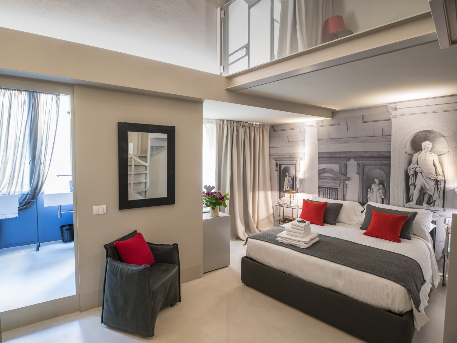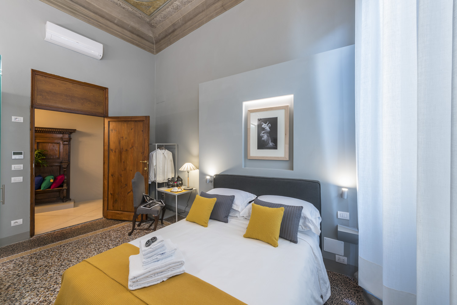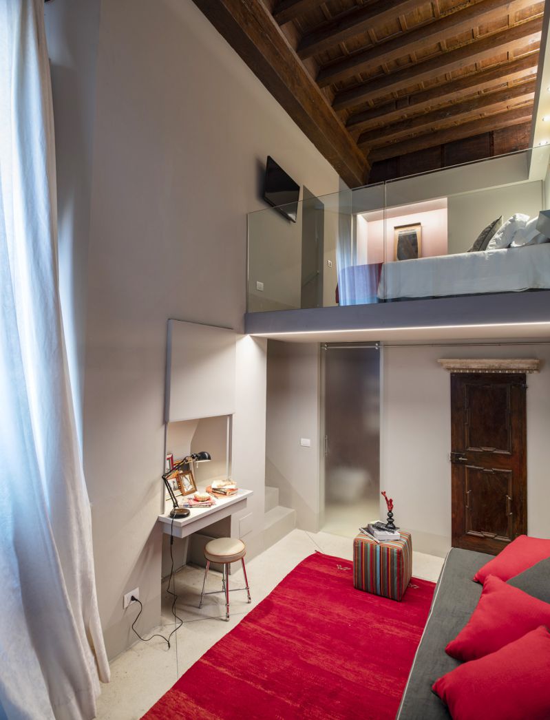 Make your dreams come true and reserve now a stunning double room in Florence, with a view onPalazzo Pitti. You are in the heart of the city, in the most authentic neighborhood, Oltrarno and Santo Spirito, the coolest district in the world, according to the Lonely Planet’s guide. The wide space of the double room is described by the superb meeting of the modern design with the details of the past, defining a new sensual style, ideal for each arts’ lover