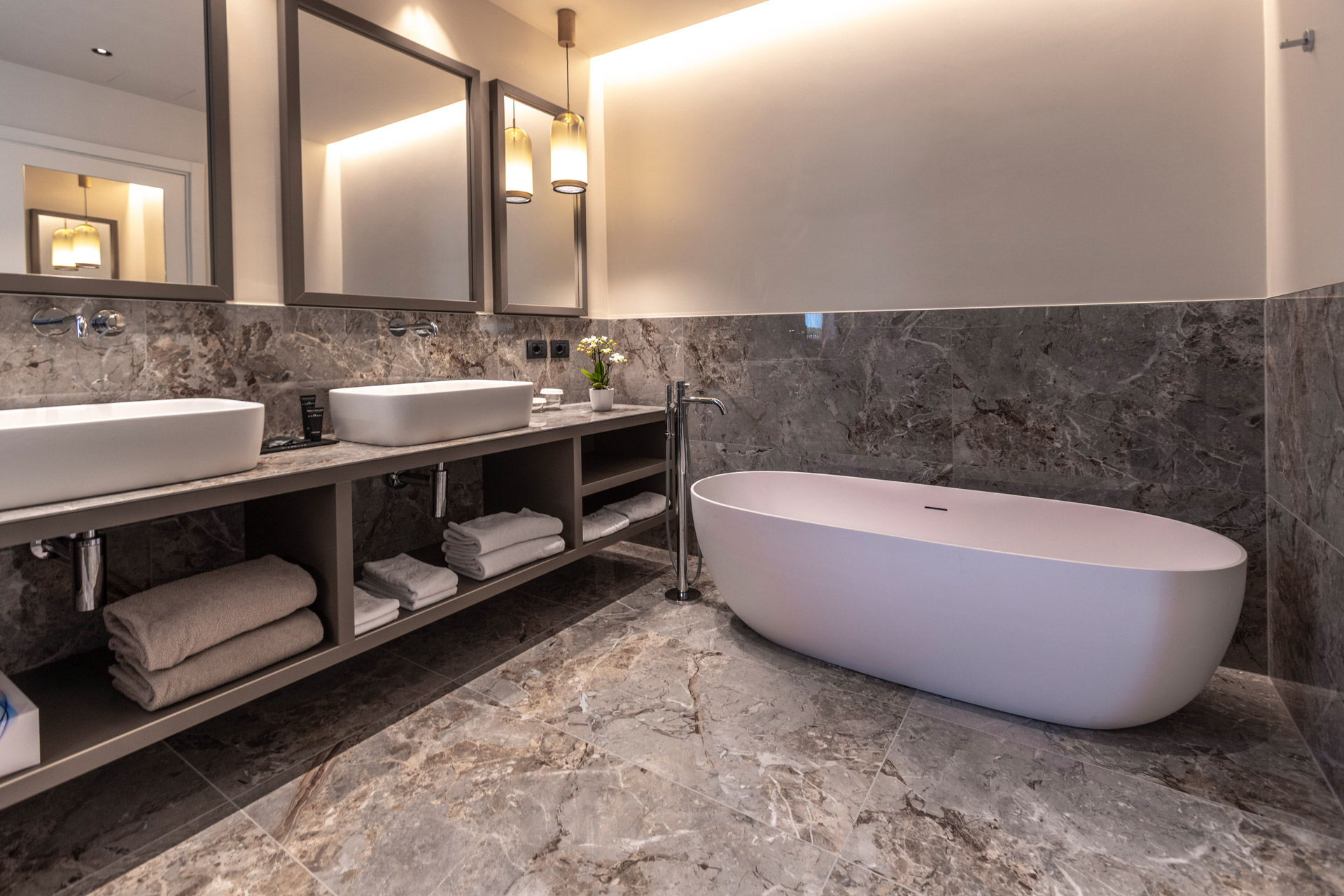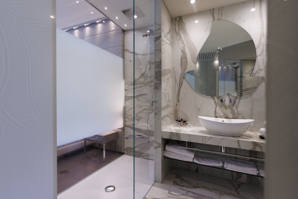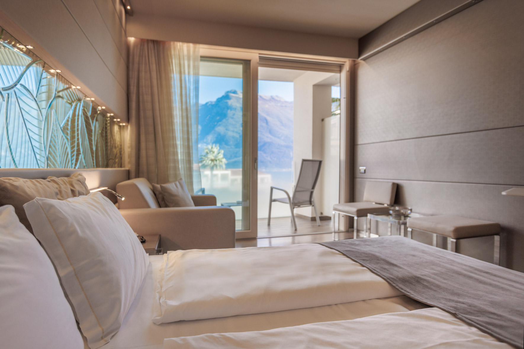 Discover the comfortable Prestige Partial Lake View rooms, immersed in a timeless palette of bright and enveloping colors that convey a sophisticated tranquility and absolute relaxation. Each room has a balcony with a partial lake view offering a unique visual experience. The possibility of adding a third bed, upon request, makes them ideal for families and groups of friends. The bathroom is a design masterpiece, featuring a spacious glass shower cabin that enhances the sense of well-being. Soft bathrobes and slippers are available for your personal comfort, while a direct-dial phone, minibar, and tea and coffee maker add a touch of practicality to your stay. You will also find a hairdryer, a makeup mirror, and a full line of bathroom products. To ensure an impeccable experience and respect the well-being of all guests, all our rooms are non-smoking.