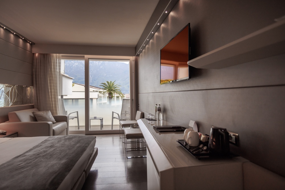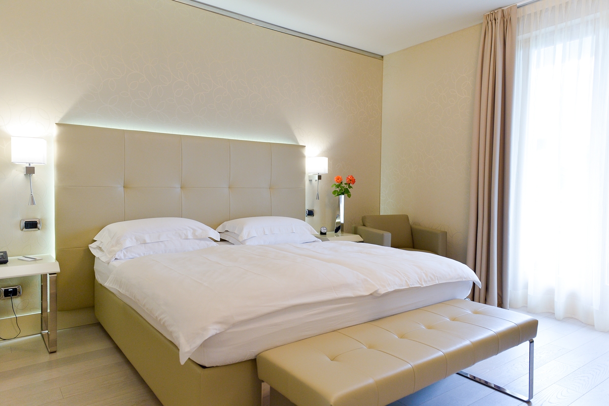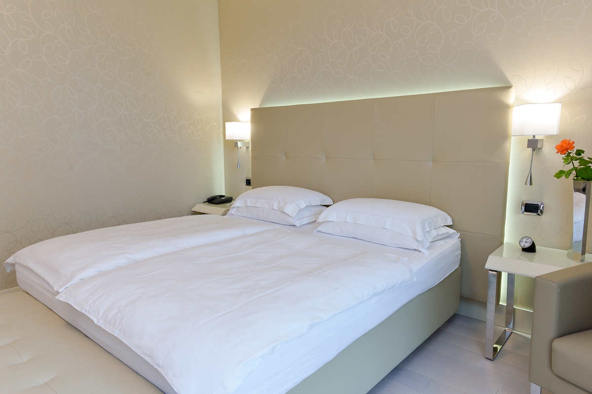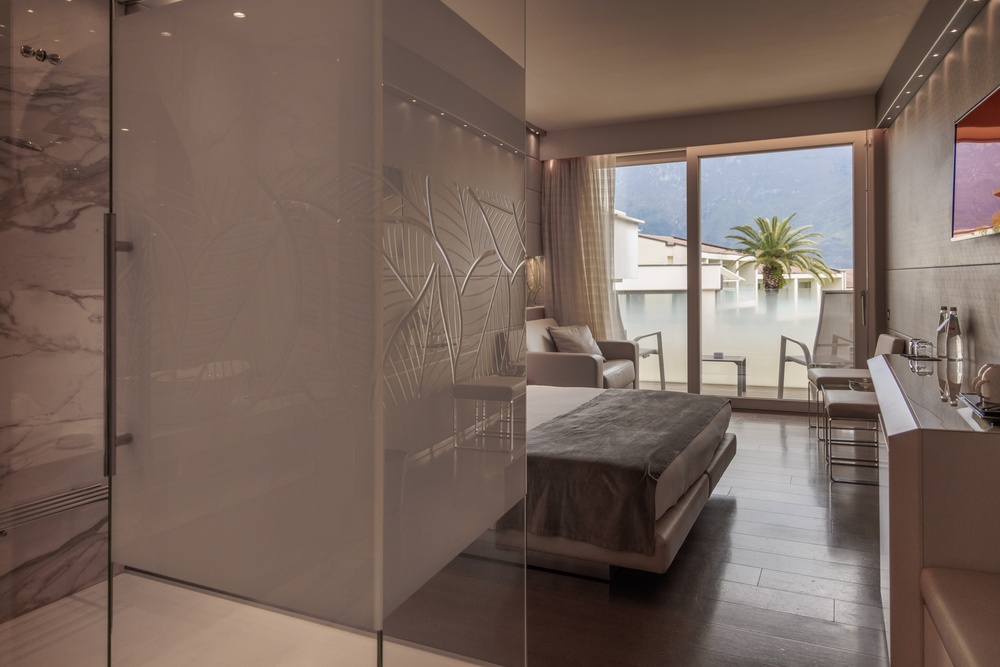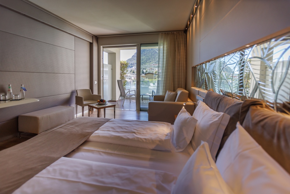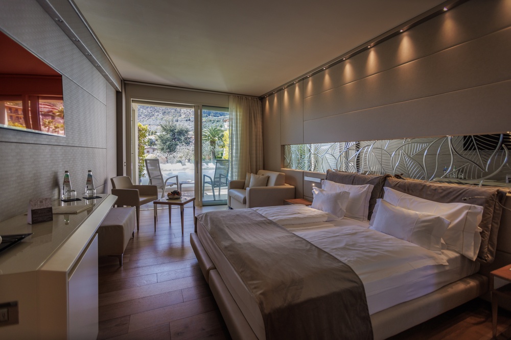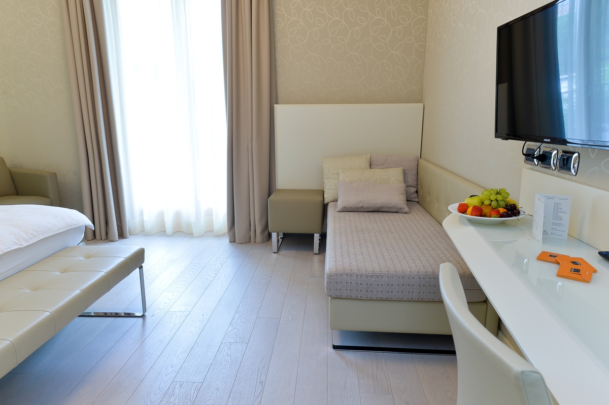 Discover the comfortable Prestige Partial Lake View rooms, immersed in a timeless palette of bright and enveloping colors that convey a sophisticated tranquility and absolute relaxation. Each room is equipped with a balcony with a partial lake view offering a unique visual experience. The possibility of adding a third bed, upon request, makes them ideal for families and groups of friends. The bathroom is a design masterpiece, featuring a spacious glass shower cabin that enhances the sense of well-being. Soft bathrobes and slippers are available for your personal comfort, while a direct-dial phone, minibar, and tea and coffee maker add a touch of convenience to your stay. You will also find a hairdryer, a makeup mirror, and a full line of bathroom amenities. To ensure an impeccable experience and respect the well-being of all guests, all our rooms are non-smoking.