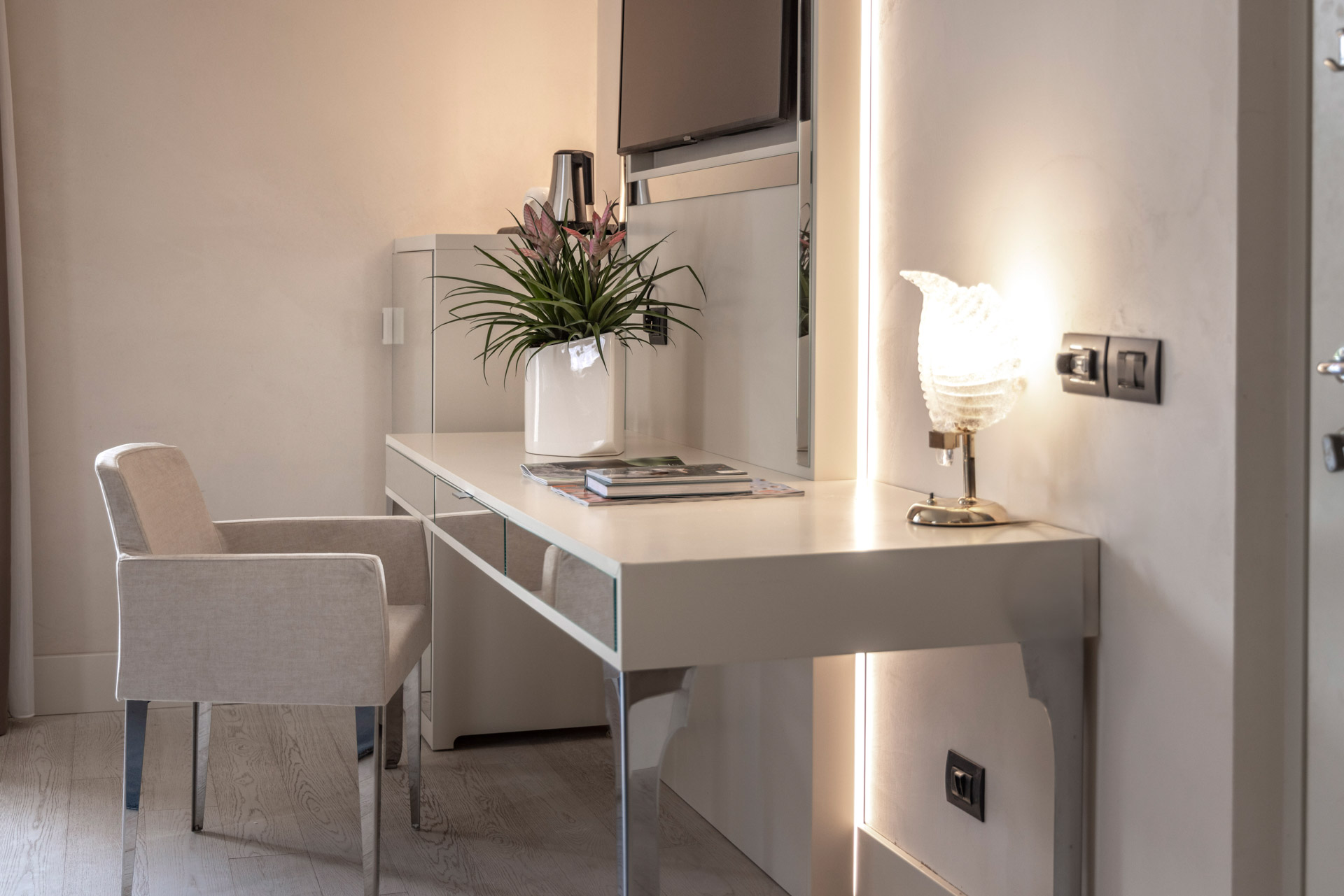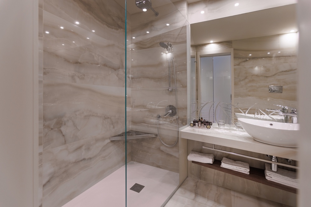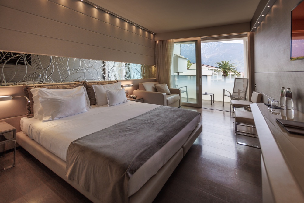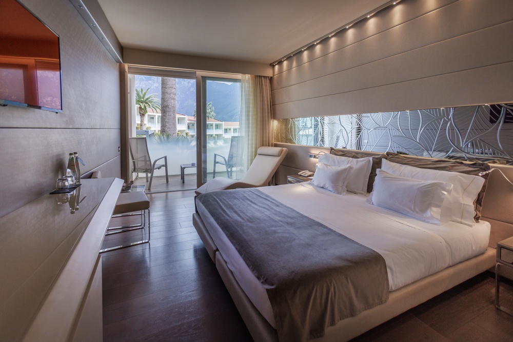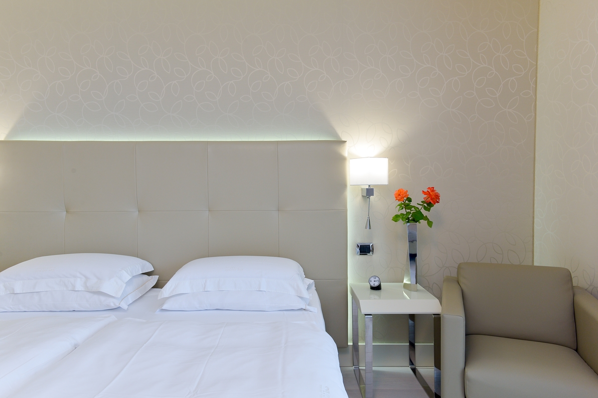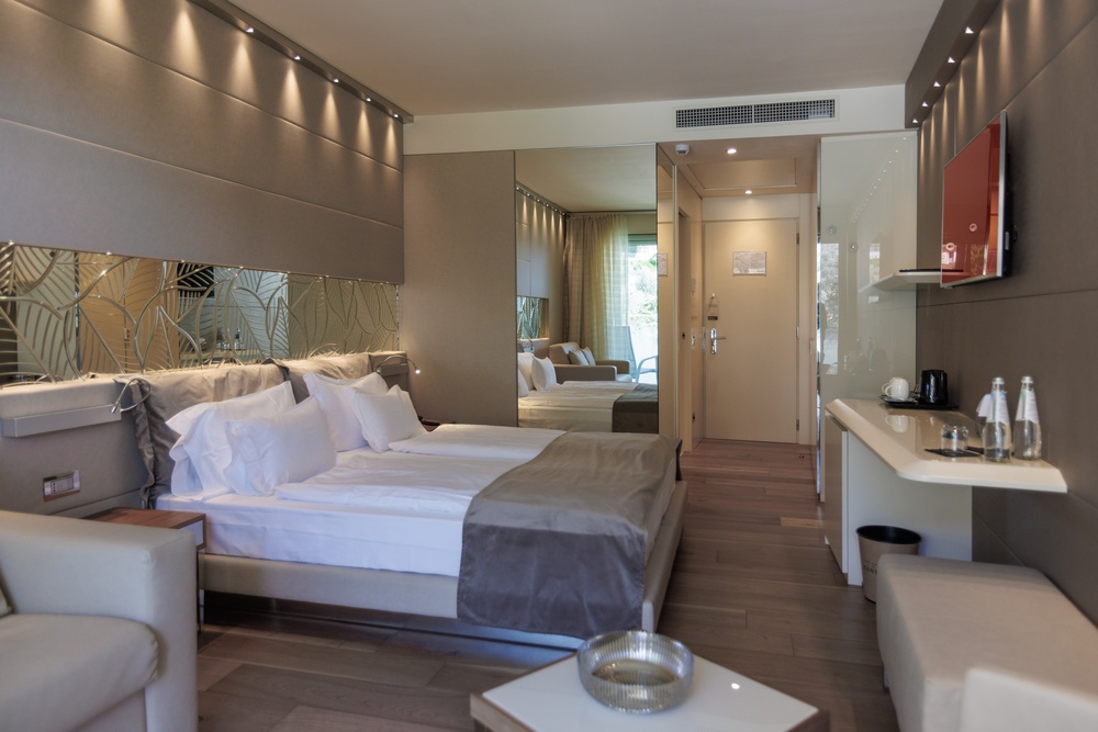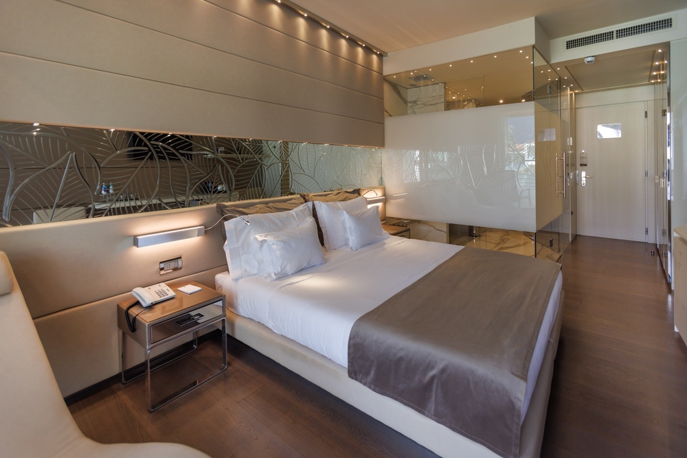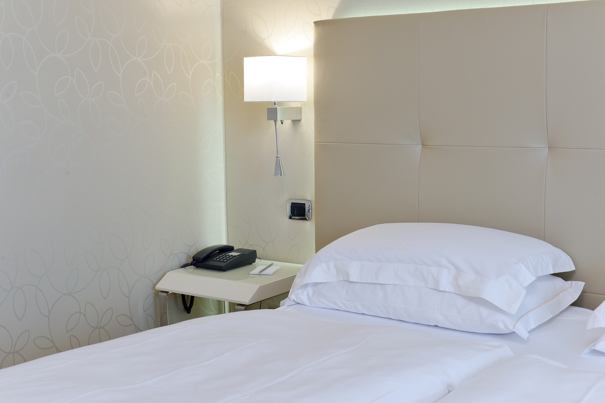 Discover the comfortable Prestige Partial Lake View rooms, immersed in a timeless palette of bright and enveloping colors that convey a sophisticated tranquility and absolute relaxation. Each room is equipped with a balcony with a partial lake view offering a unique visual experience. The possibility of adding a third bed, upon request, makes them ideal for families and groups of friends. The bathroom is a design masterpiece, featuring a spacious glass shower cabin that enhances the sense of well-being. Soft bathrobes and slippers are available for your personal comfort, while a direct-dial phone, minibar, and tea and coffee maker add a touch of convenience to your stay. You will also find a hairdryer, a makeup mirror, and a full line of bathroom amenities. To ensure an impeccable experience and respect the well-being of all guests, all our rooms are non-smoking.