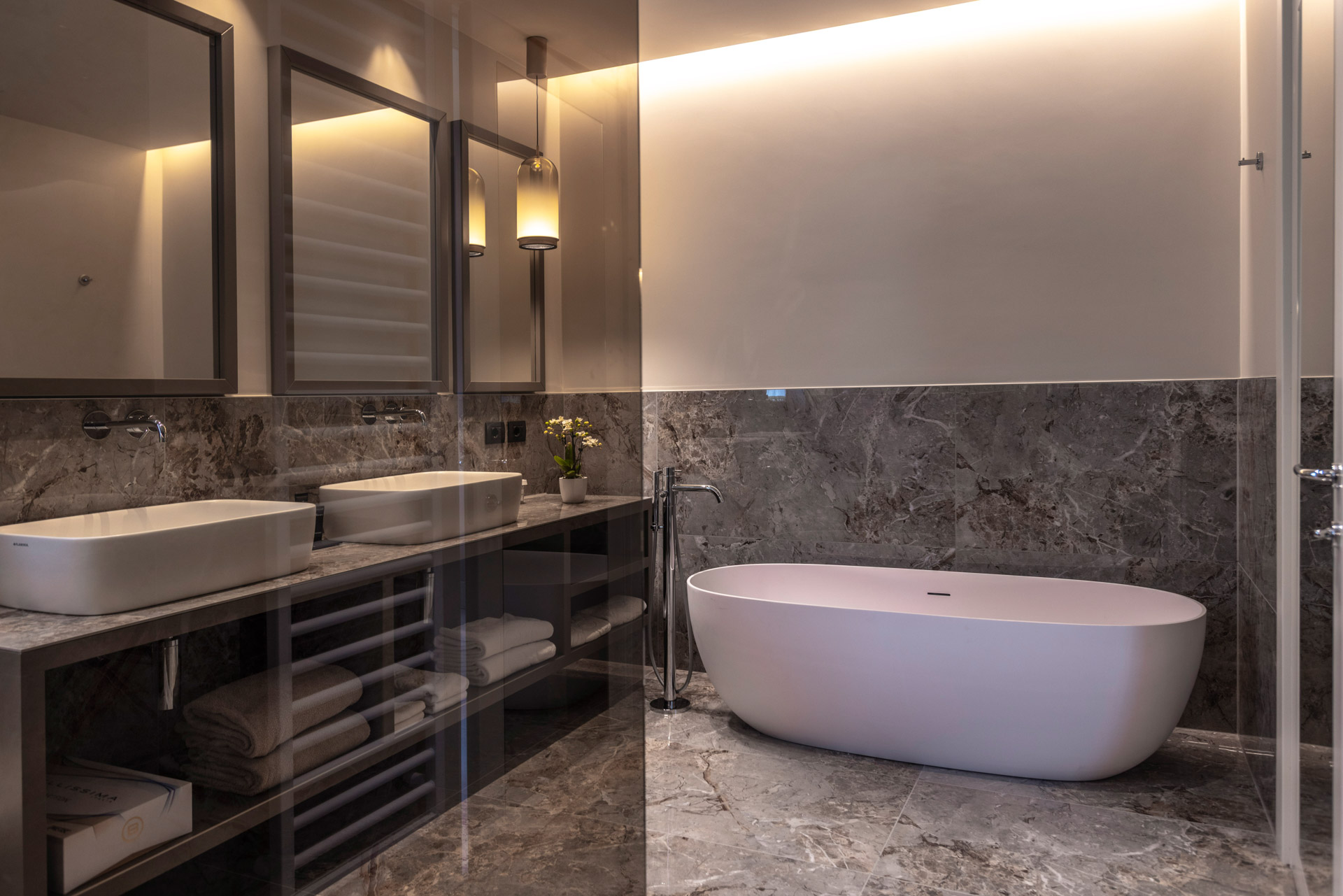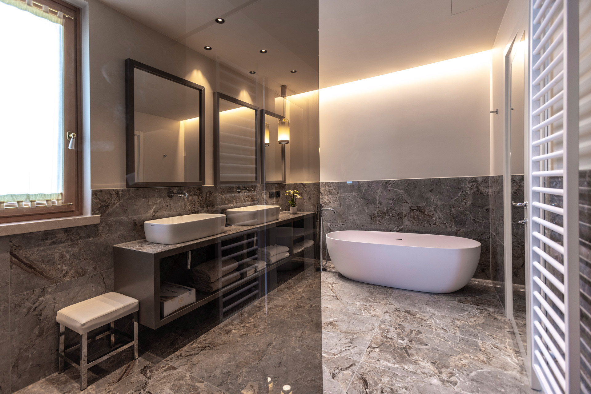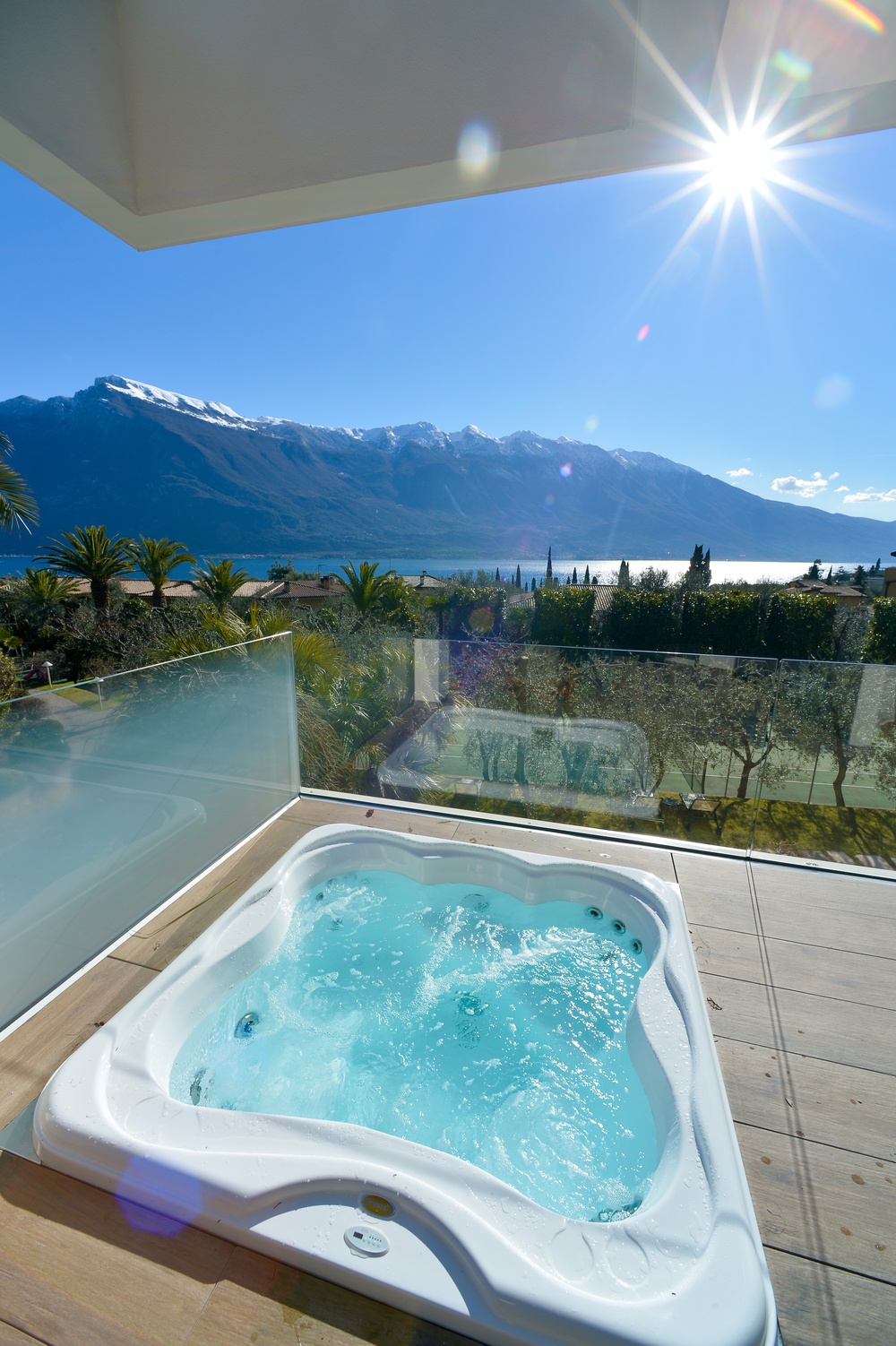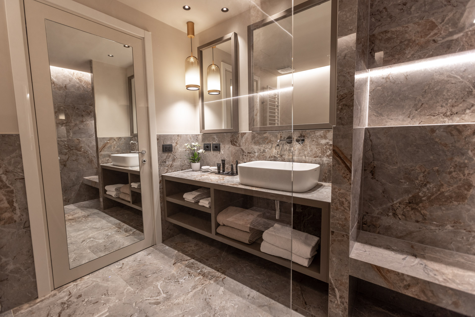 Space, luxury, privacy, an experience to be lived in the Deluxe Suites, designed to offer the ultimate in comfort and style. Each suite features two independent bedrooms with double bathrooms, characterized by light colors and modern furnishings, embellished by large windows offering breathtaking views of the lake. An impeccable example of Italian design that will leave our guests speechless. Each suite boasts an exclusive lake view, a private patio and a refined mini jacuzzi pool. The double bathrooms are equipped with a shower, soft bathrobes and two types of slippers for an unparalleled luxury experience. You will also find a direct dial phone, minibar, tea and coffee maker, Dyson hairdryer, make-up mirror and a complete bathroom line.