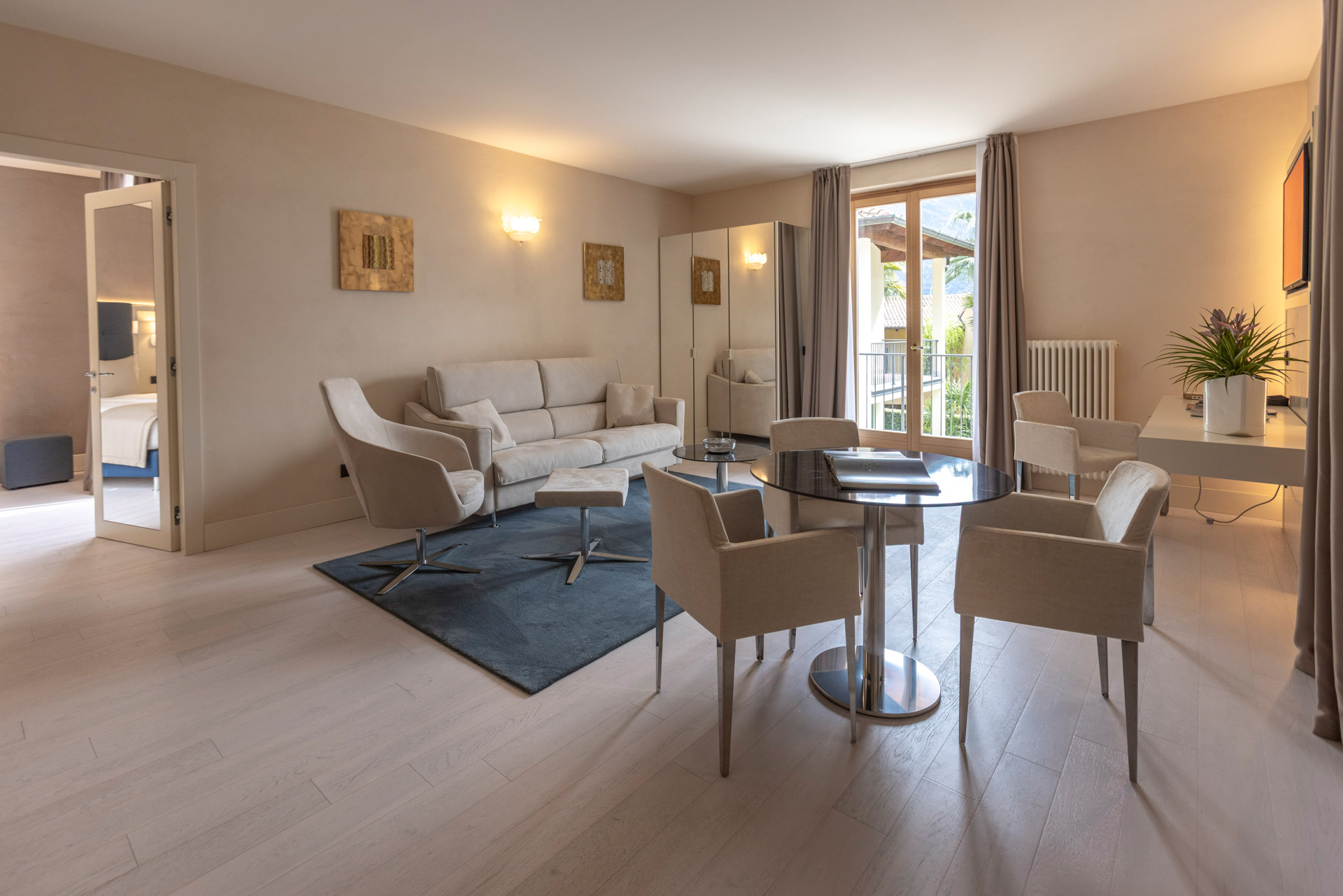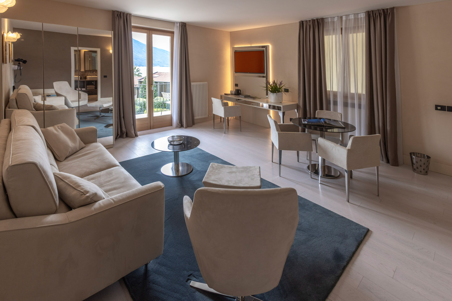Indulge in an unparalleled stay in our Suites with partial lake views, where every detail is meticulously designed to offer the utmost in comfort, elegance, and relaxation. Immerse yourself in the refined and luminous ambiance of the two rooms that make up your suite, tastefully furnished in ivory tones and adorned with a warm parquet wooden floor. Spacious terraces or balconies will grant you breathtaking views of the garden, lake, or mountains, depending on your suite's location. Choose between a garden view or a partial lake view, both capable of offering a captivating panorama that will leave you breathless. The generously sized bathroom boasts a separate bathtub and shower, perfect for indulging in moments of rejuvenating relaxation. Bathrobes and soft slippers will be at your disposal to ensure maximum comfort, while a complete bathroom line will pamper you with delicate fragrances and high-quality products. Exclusive amenities such as a direct-dial telephone, minibar, and tea and coffee maker guarantee a stay focused on practicality and relaxation. Additionally, a makeup mirror and hairdryer will be available to cater to your every need. Choose our suites and prepare to experience an unforgettable stay, where luxury, refinement, and attention to detail merge to offer you a dream vacation. To ensure an impeccable experience and respect the well-being of all guests, all our rooms are non-smoking.
