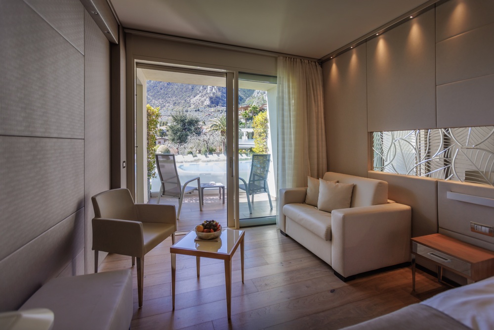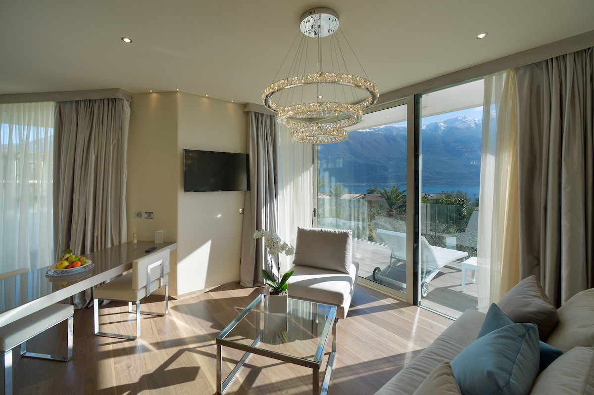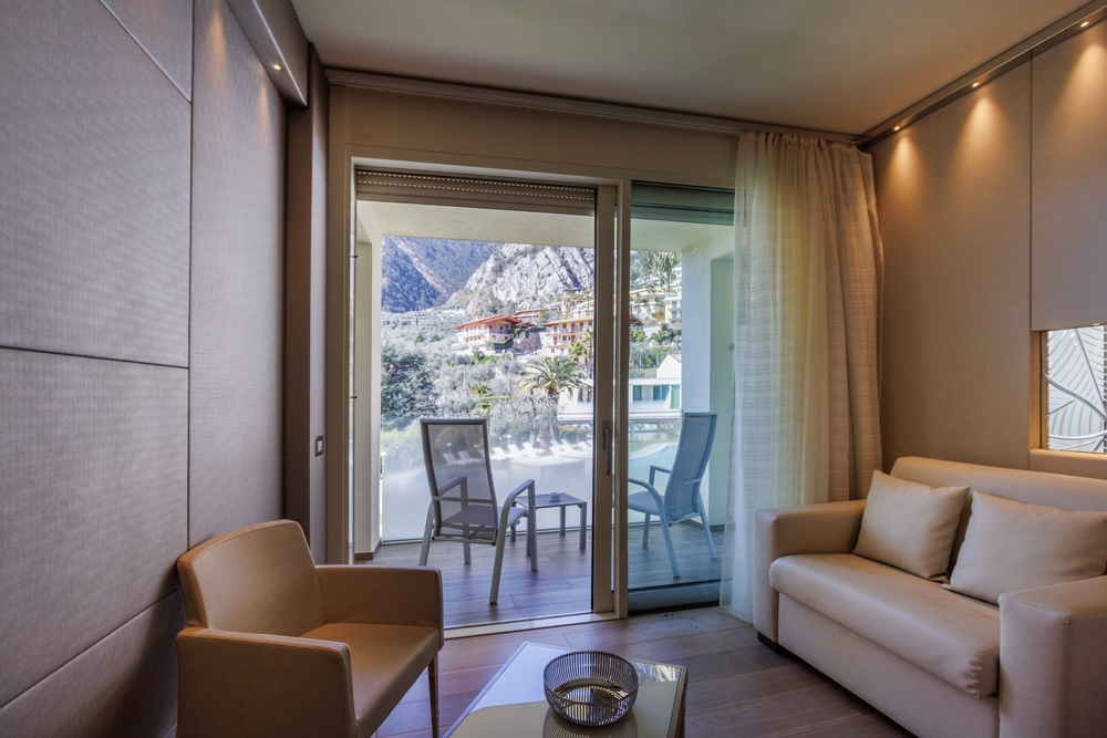 Junior Suite Partial Lake View Our Junior Suites with a Partial Lake View are modern and bright rooms that will welcome you with elegance and comfort. Characterized by light tones, they offer large windows that provide a suggestive partial view of the lake, creating a relaxing and enchanting atmosphere. The bathroom is equipped with a spacious shower, while soft bathrobes and personal slippers will make you feel pampered from the very first moment. The rooms also offer the possibility, upon request, to add a third bed to meet every need. Services include a direct dial telephone, minibar, tea and coffee maker, hairdryer, make-up mirror, and a line of high-quality bathroom products. Discover a haven of luxury and serenity, where every detail is carefully curated to offer you an unforgettable stay. To guarantee an impeccable experience and respect the well-being of all guests, all of our rooms are non-smoking.