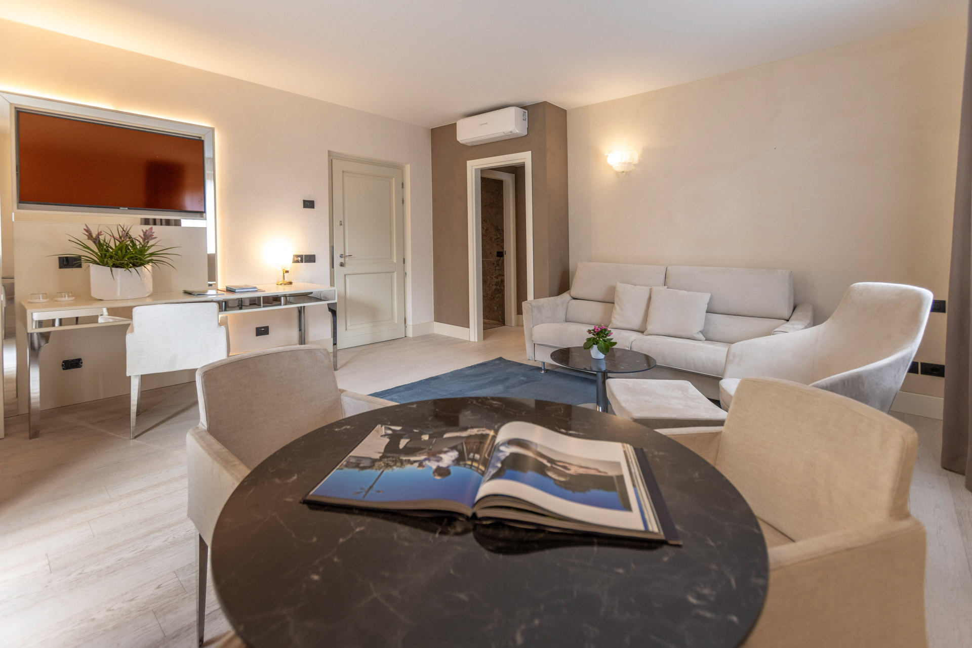 Let yourself be transported into a dreamlike state in an oasis of style and modernity, where refined design intertwines with the enchanting beauty of our garden. Our Junior Suites with Garden and/or pool view, bright and airy, characterized by light and relaxing tones, will welcome you with discreet elegance and an irresistibly charming atmosphere. Large windows open onto the lush garden, offering a panoramic view that will envelop you in a sense of peace and well-being. Let yourself be intoxicated by the scents of nature and the song of the birds, while you surrender to the deepest relaxation. Every detail is designed for your maximum comfort. The bathroom, equipped with a spacious shower, will give you moments of pure relaxation, soft bathrobes and slippers will make you feel at home from the very first moment. Services include a direct dial telephone, minibar, tea and coffee maker, hairdryer, makeup mirror, and a line of high-quality bathroom products. The rooms offer, on request, the possibility of adding a third bed to comfortably accommodate an additional guest. Come discover a haven of luxury and serenity, where every detail is carefully designed to offer you an unforgettable stay. To guarantee an impeccable experience and respect the well-being of all guests, all our rooms are non-smoking.