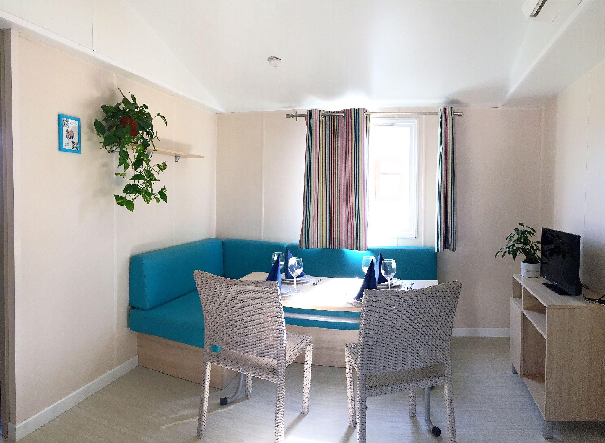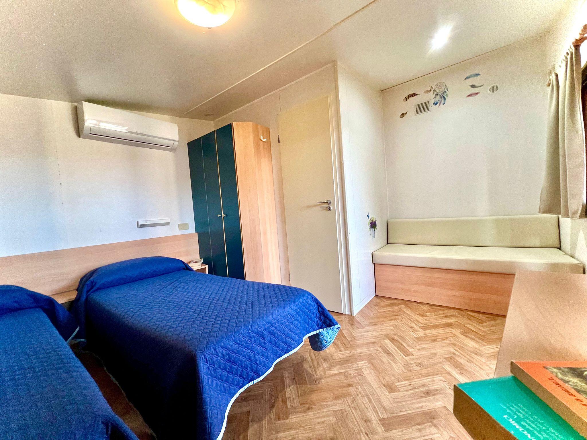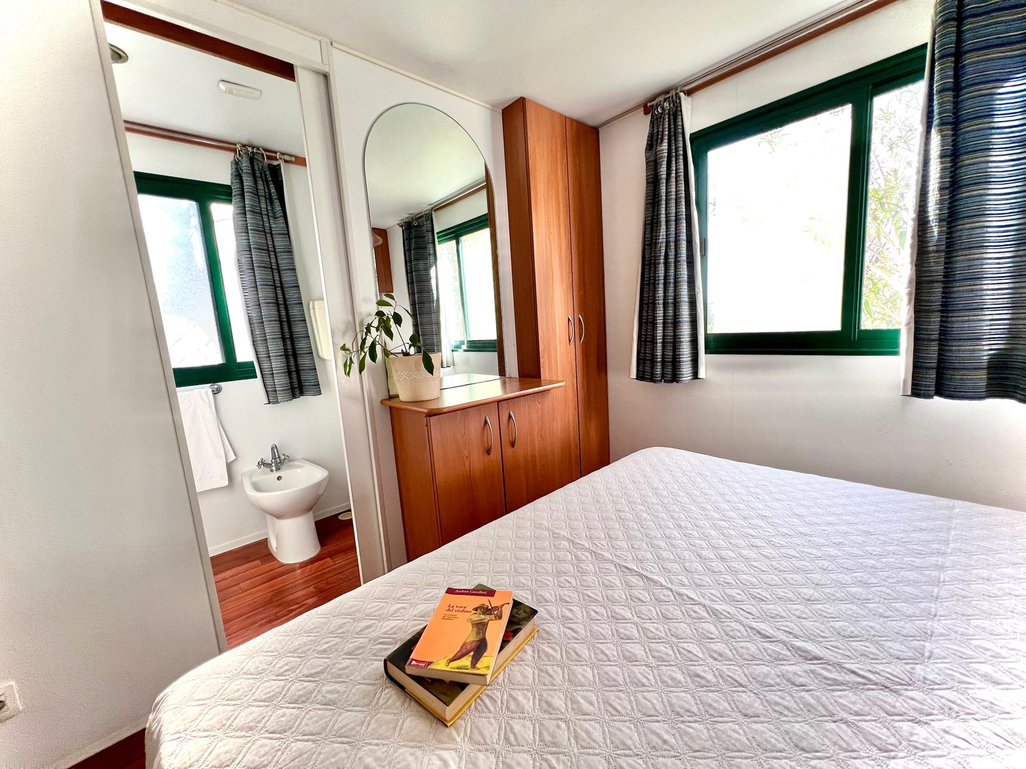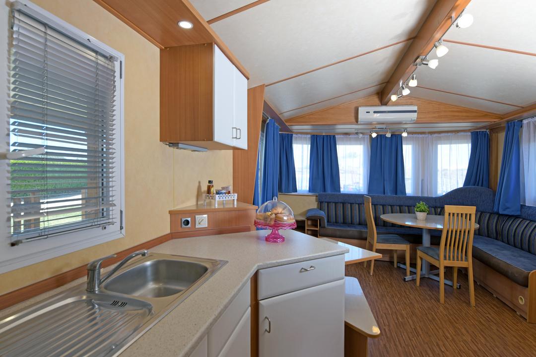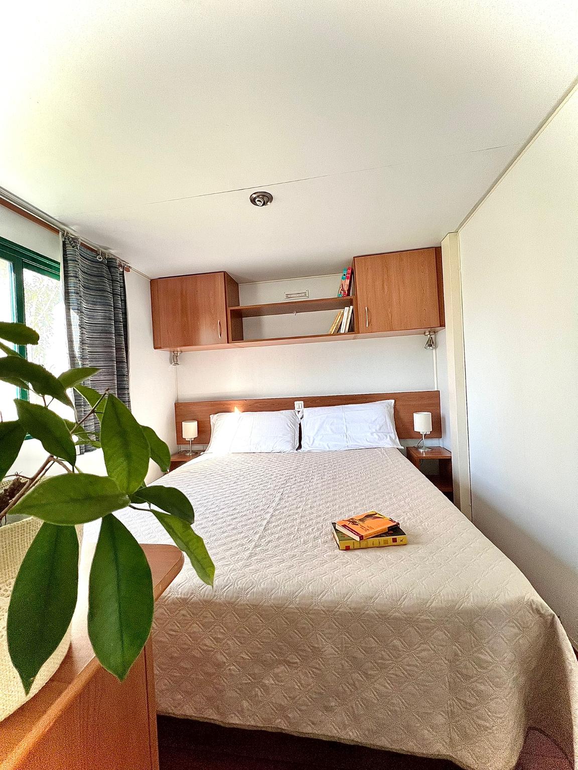 Alojamiento en casas móviles cerca de las piscinas y del parque infantil es la solución ideal para familias con niños. Descripción: habitación doble ( cama francesa), habitación con dos camas individuales, baño con ducha y bidet, cocina con refrigerador/congelador, TV y aire acondicionado/calefacción.