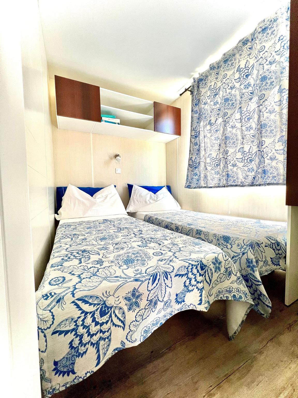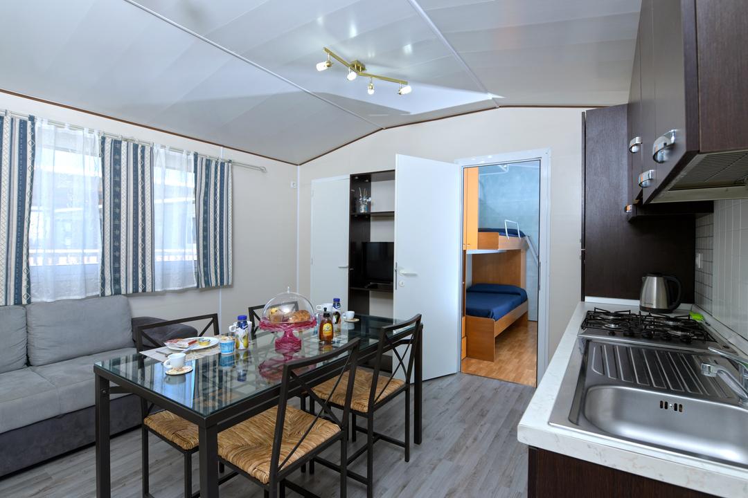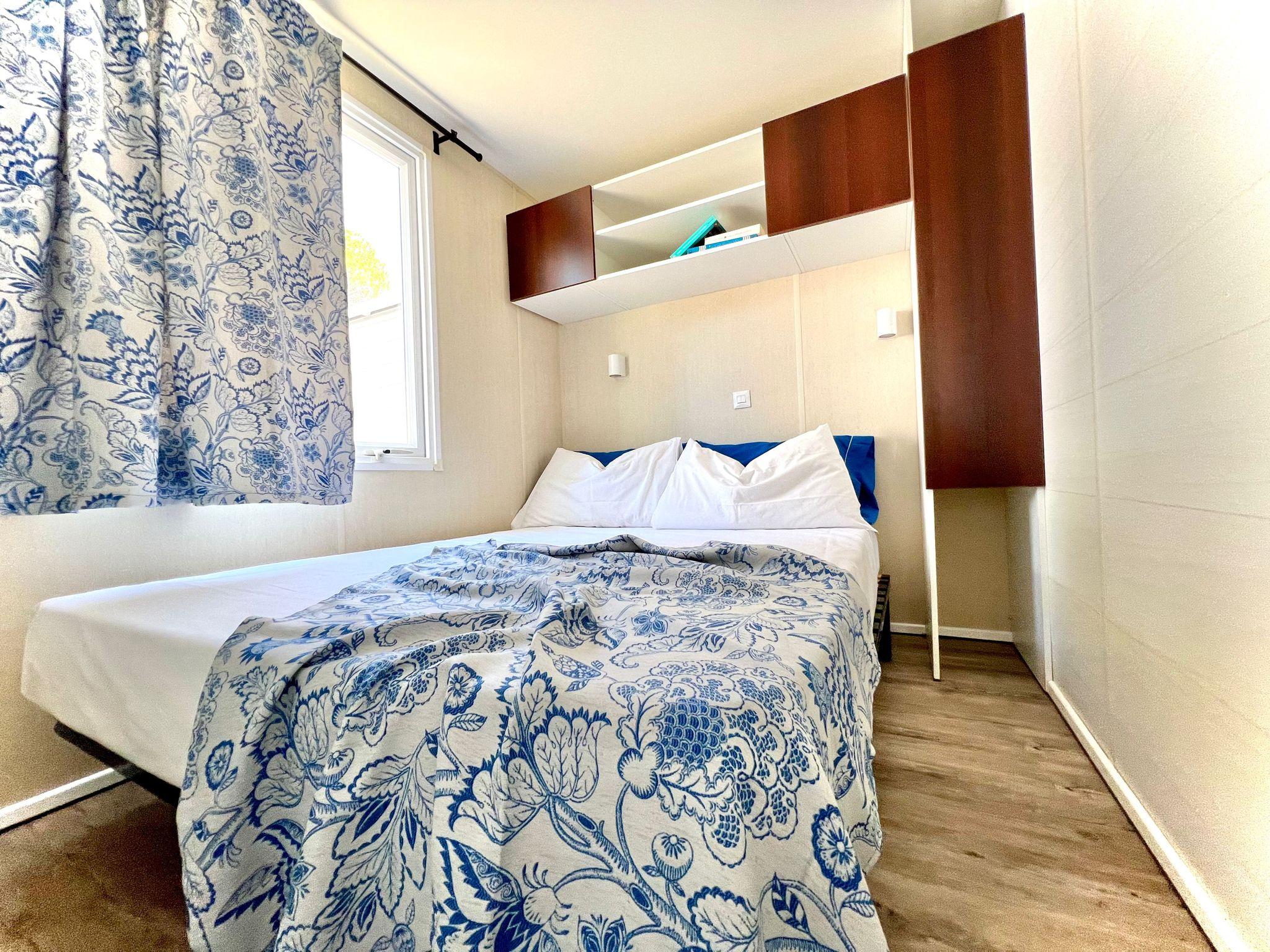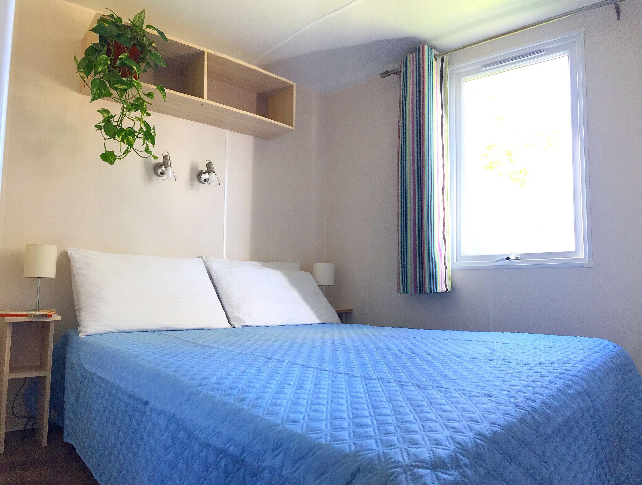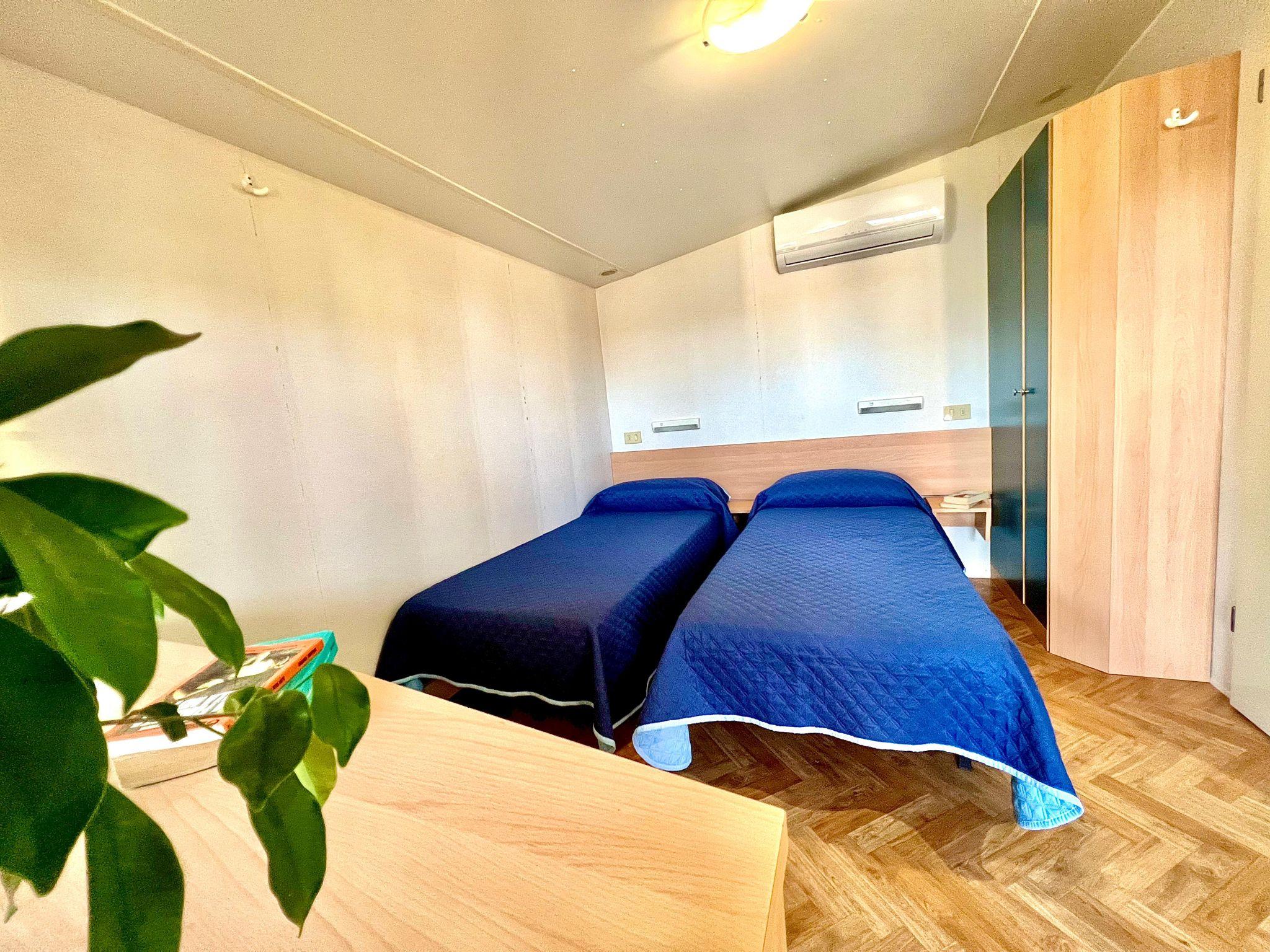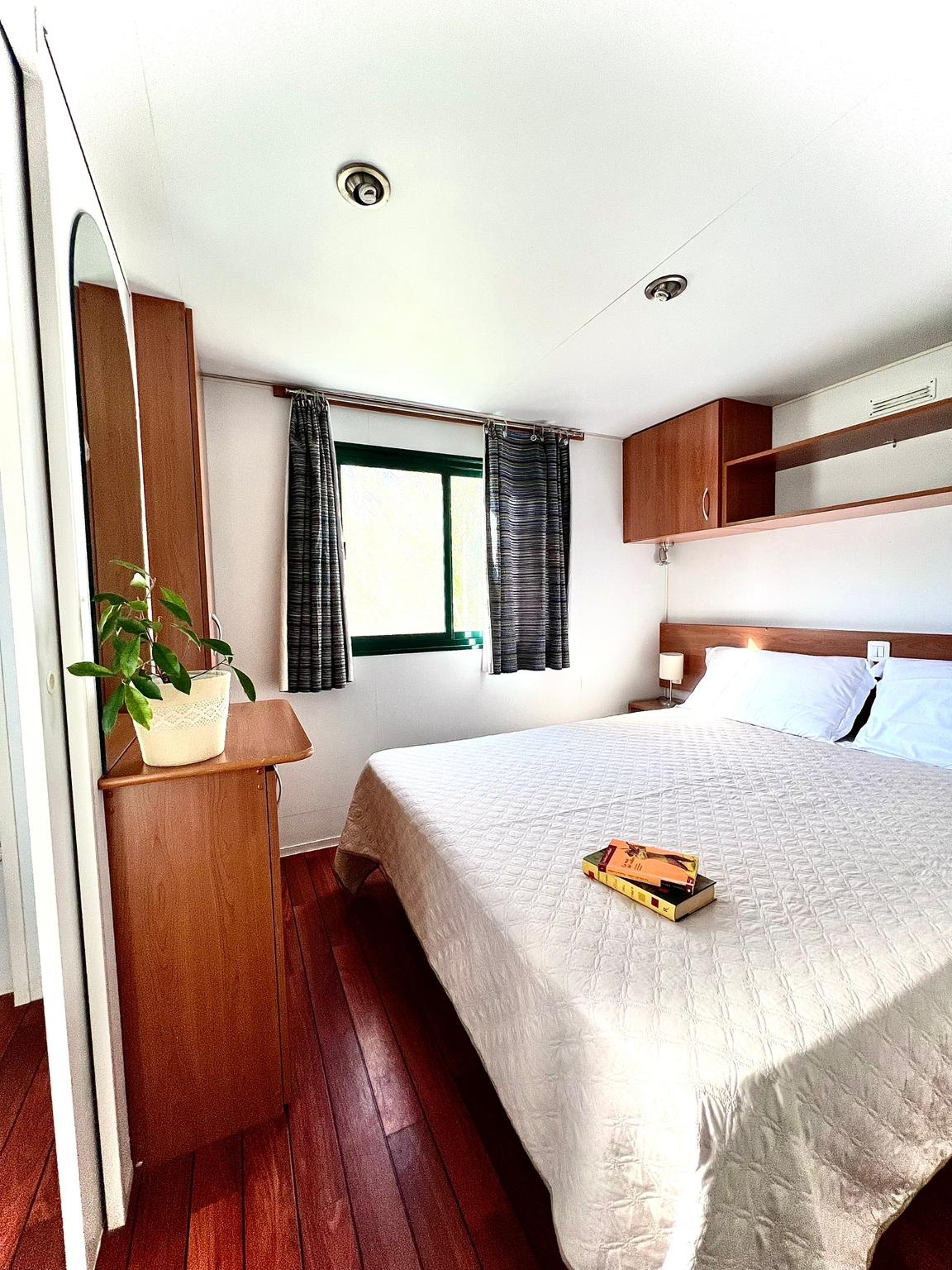 Alojamiento en casas móviles cerca de las piscinas y del parque infantil es la solución ideal para familias con niños. Descripción: habitación doble ( cama francesa), habitación con dos camas individuales, baño con ducha y bidet, cocina con refrigerador/congelador, TV y aire acondicionado/calefacción.