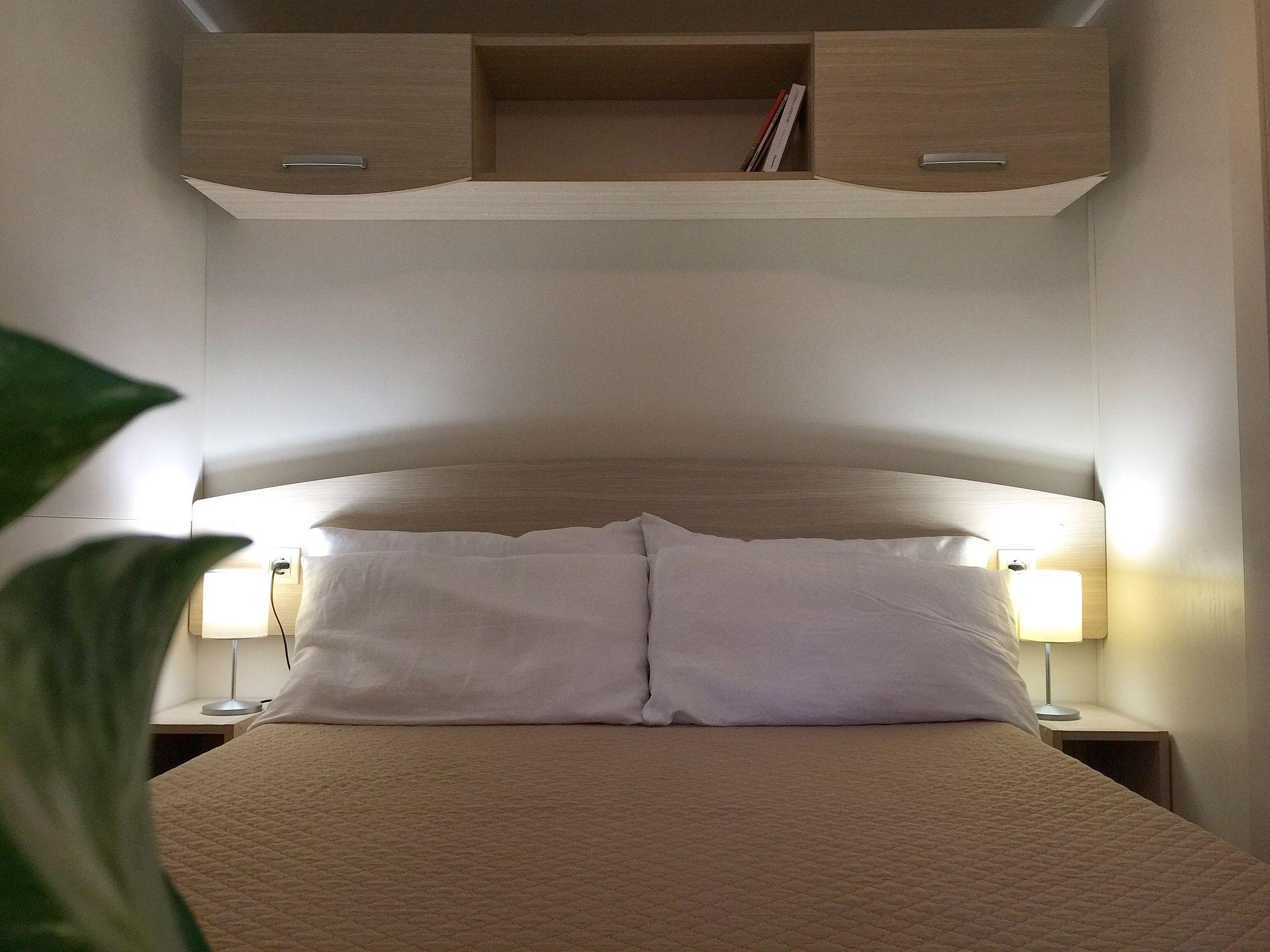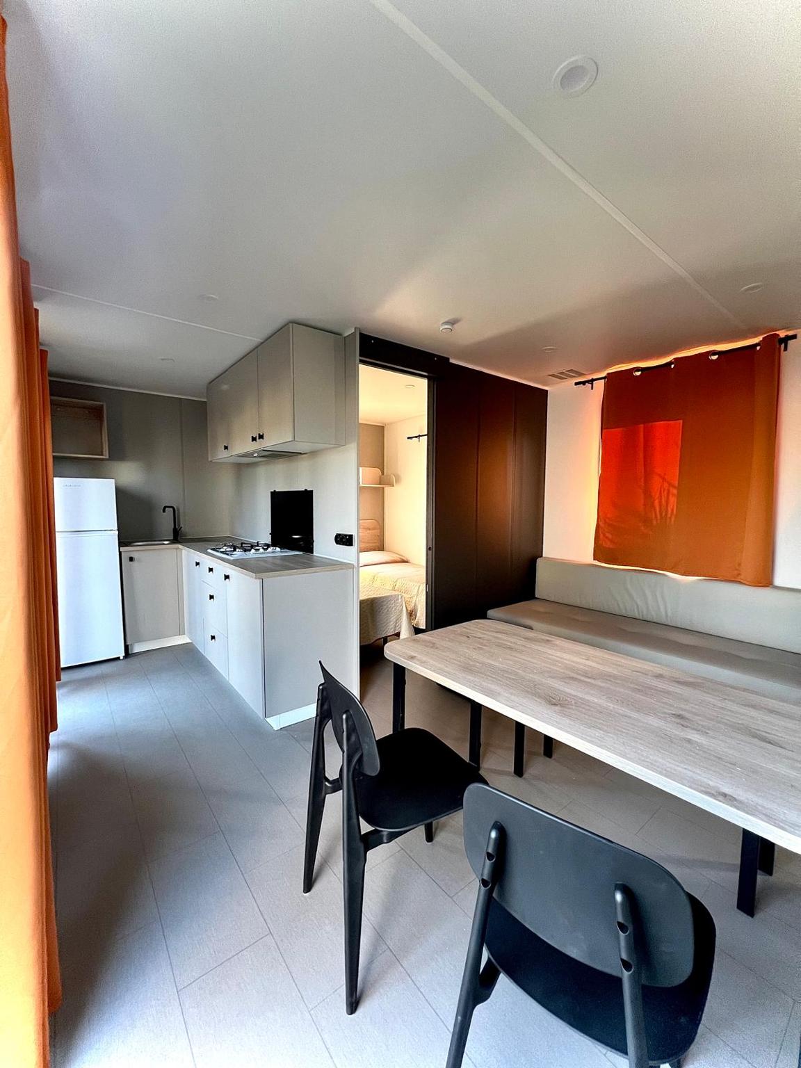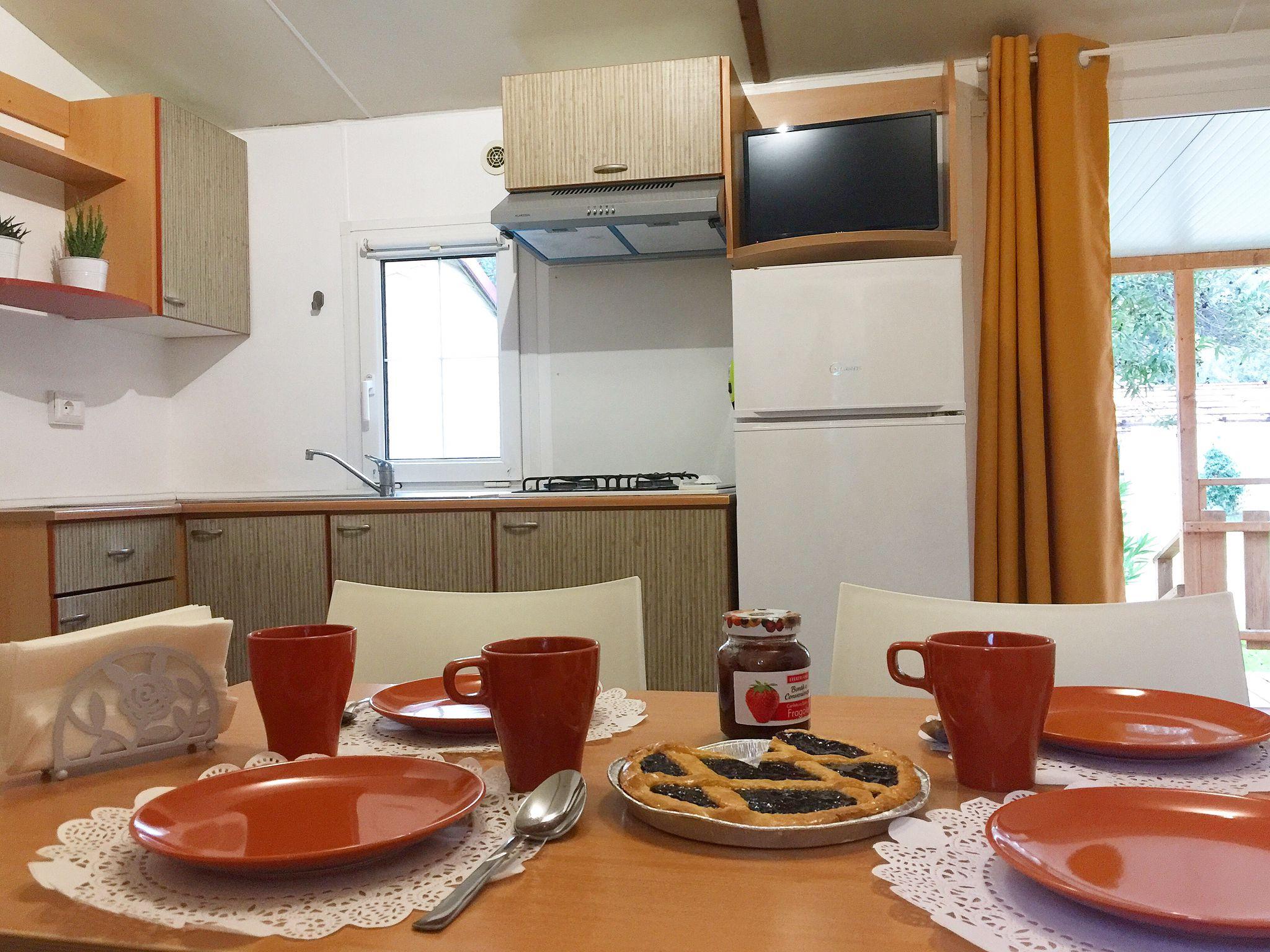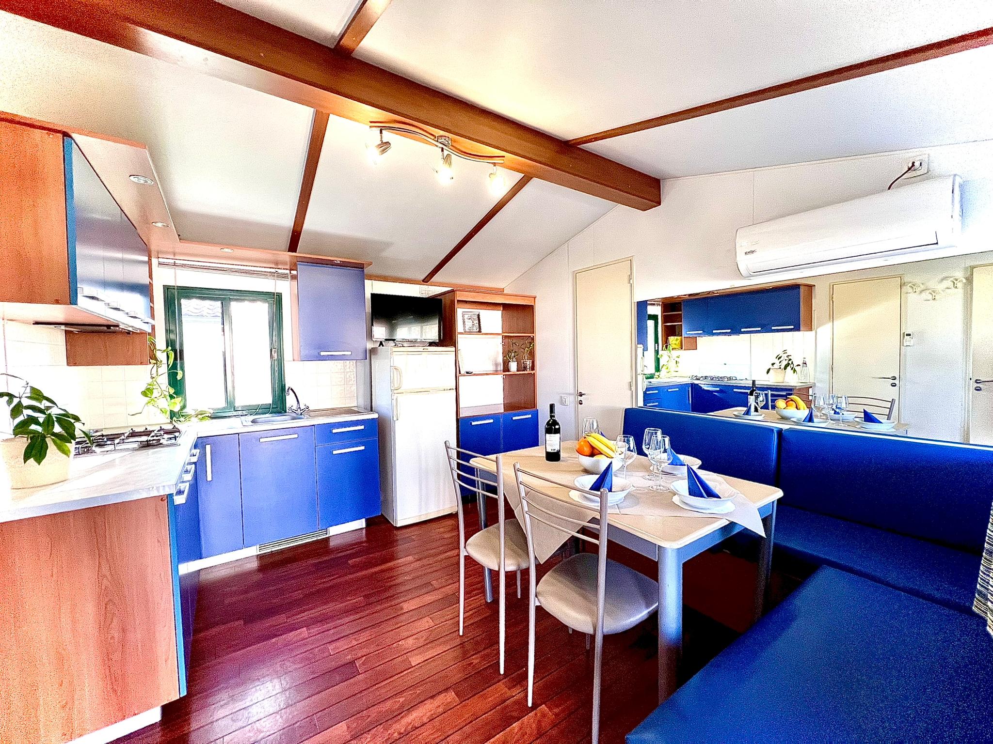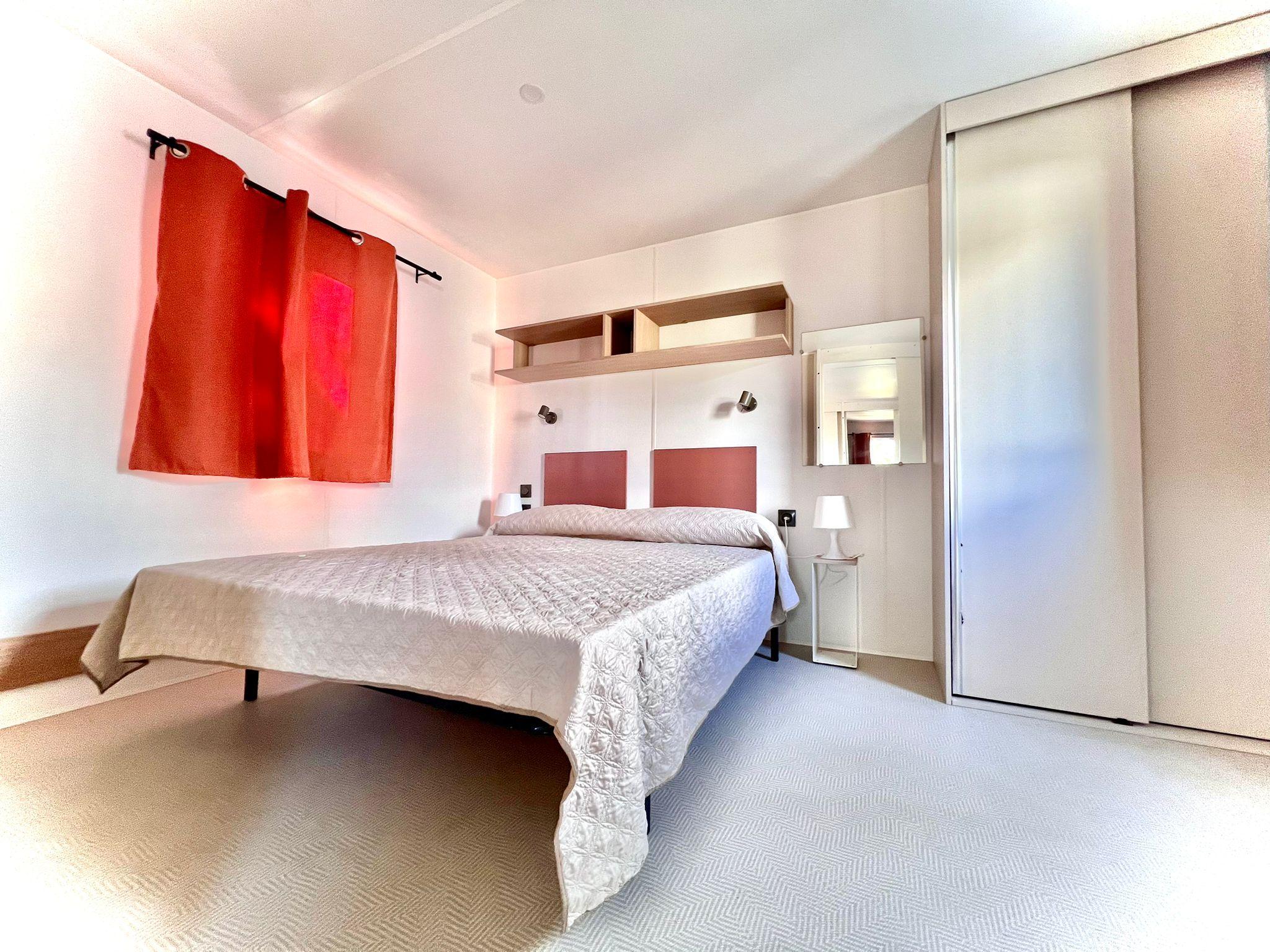 Alojamiento en casas móviles cerca de las piscinas y del parque infantil es la solución ideal para familias con niños. Descripción: habitación doble ( cama francesa), habitación con dos camas individuales, baño con ducha y bidet, cocina con refrigerador/congelador, TV y aire acondicionado/calefacción.