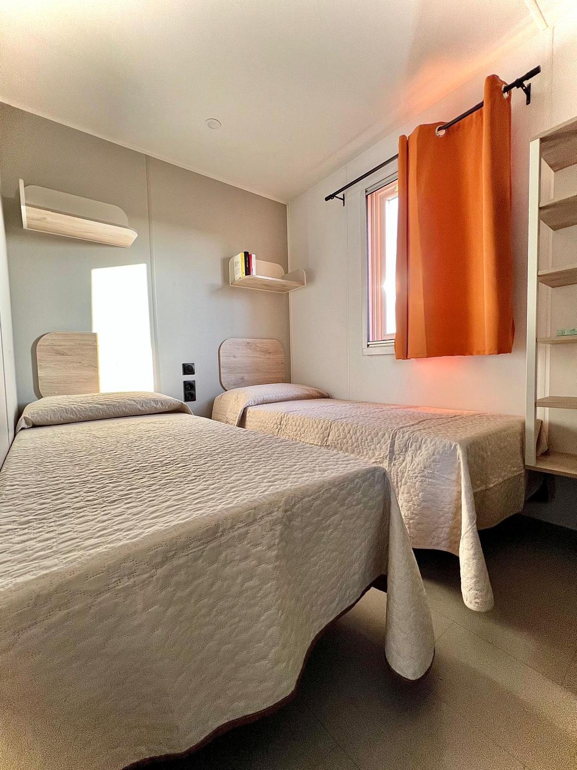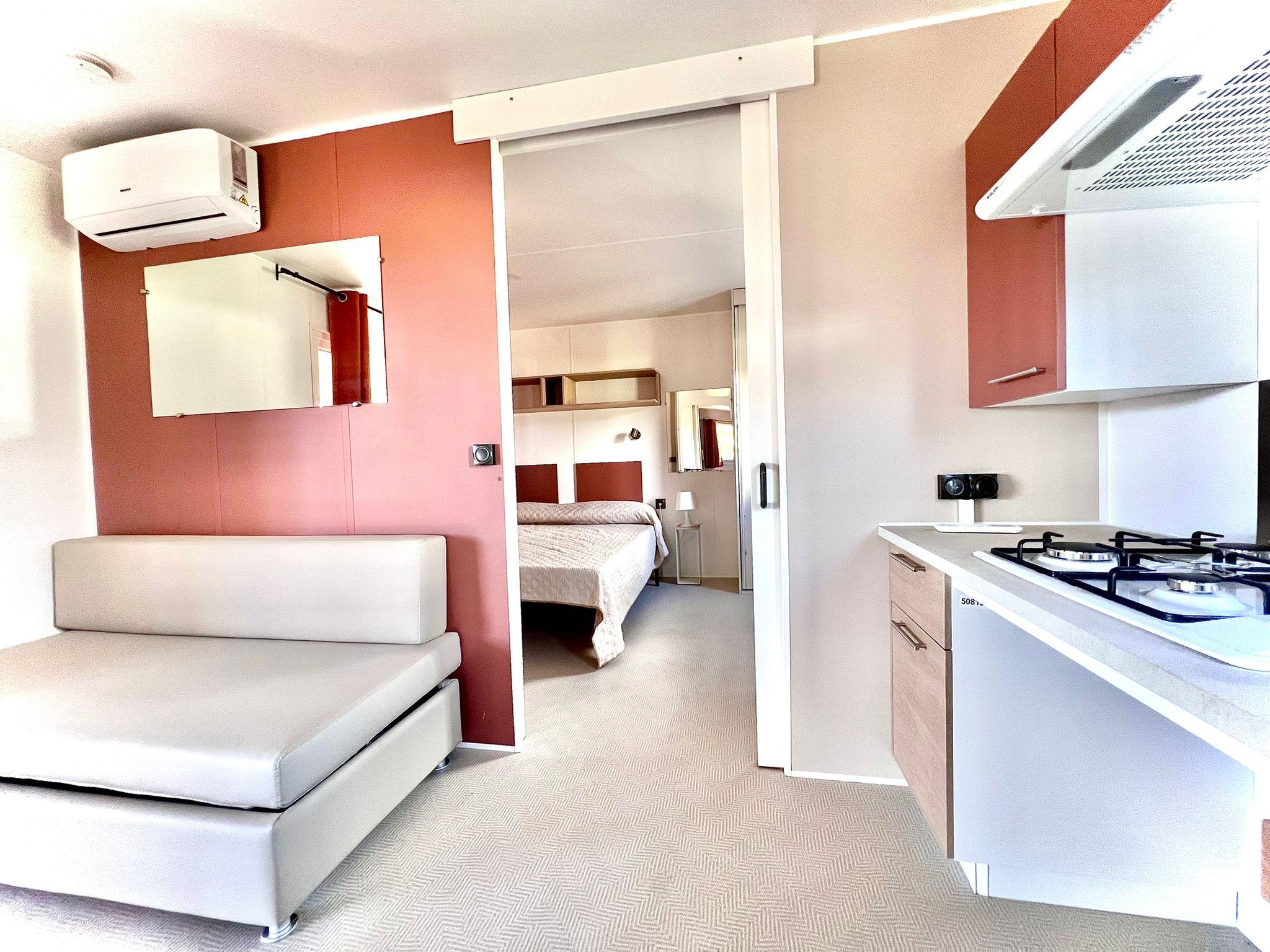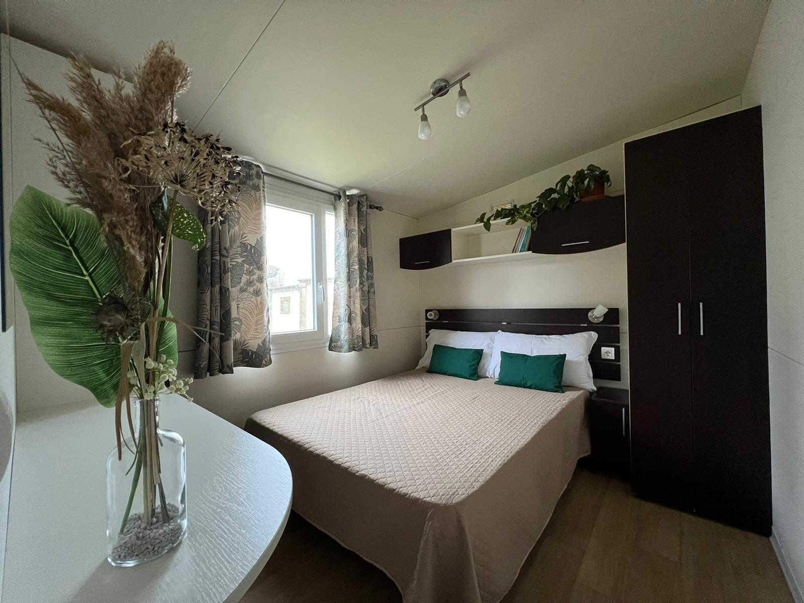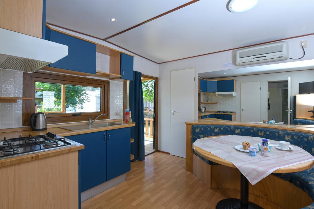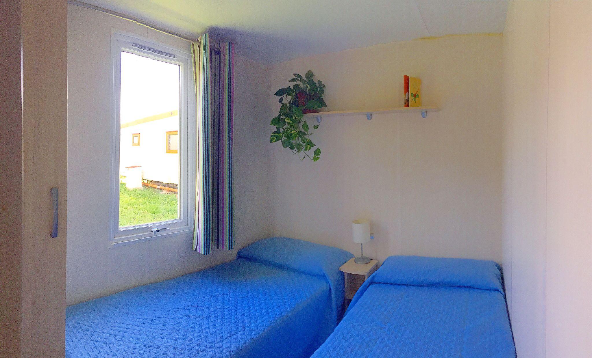 Alojamiento en casas móviles cerca de las piscinas y del parque infantil es la solución ideal para familias con niños. Descripción: habitación doble ( cama francesa), habitación con dos camas individuales, baño con ducha y bidet, cocina con refrigerador/congelador, TV y aire acondicionado/calefacción.