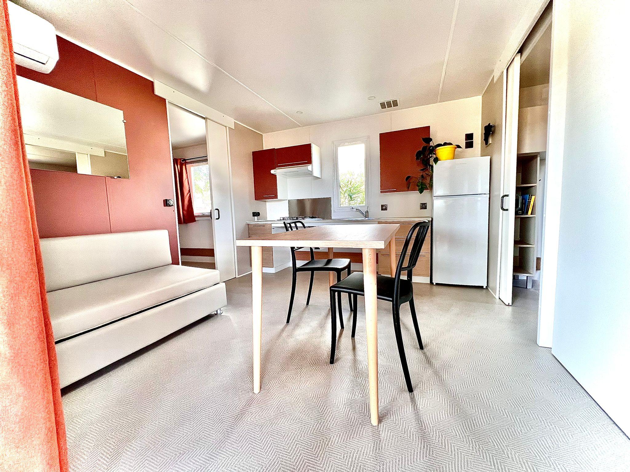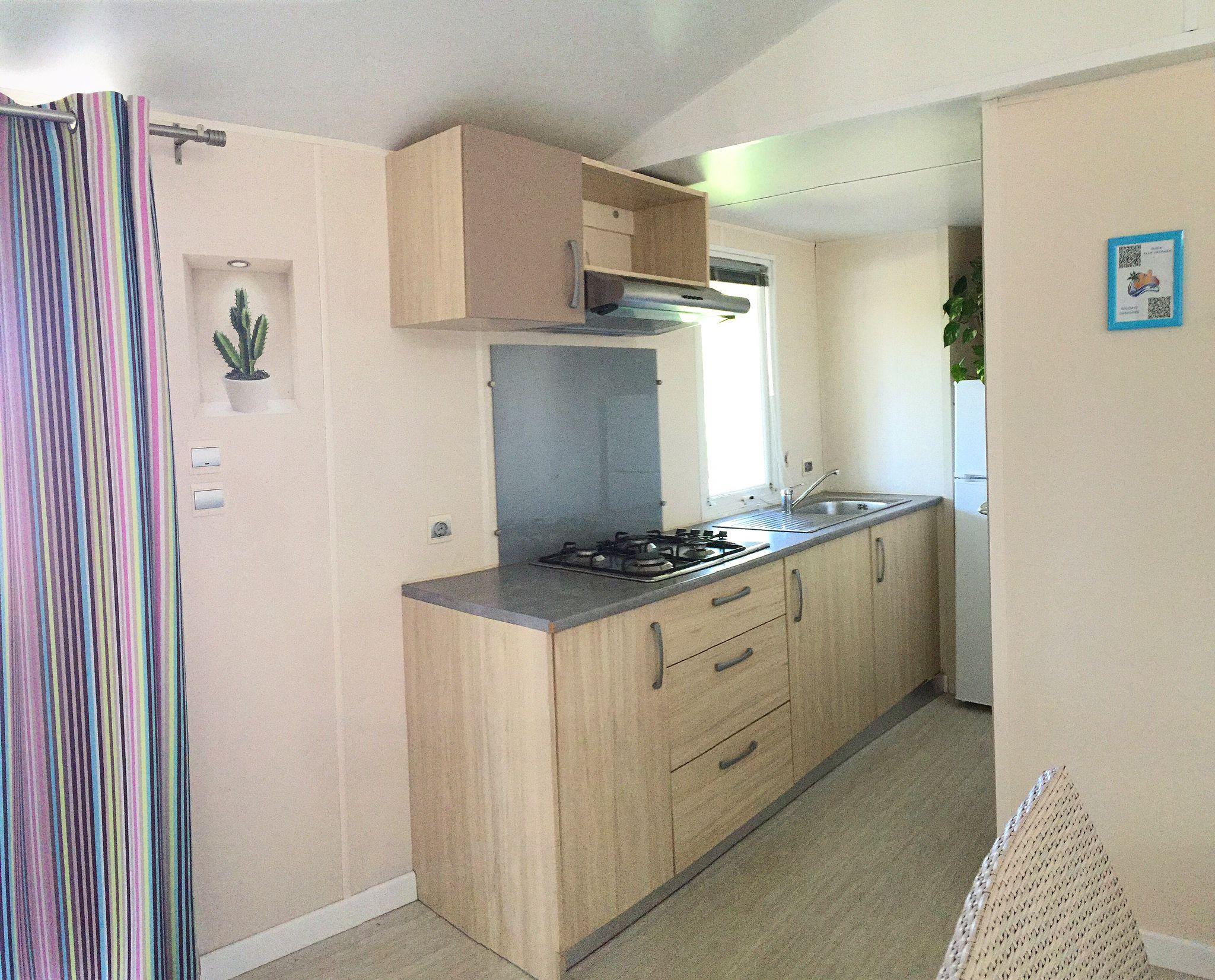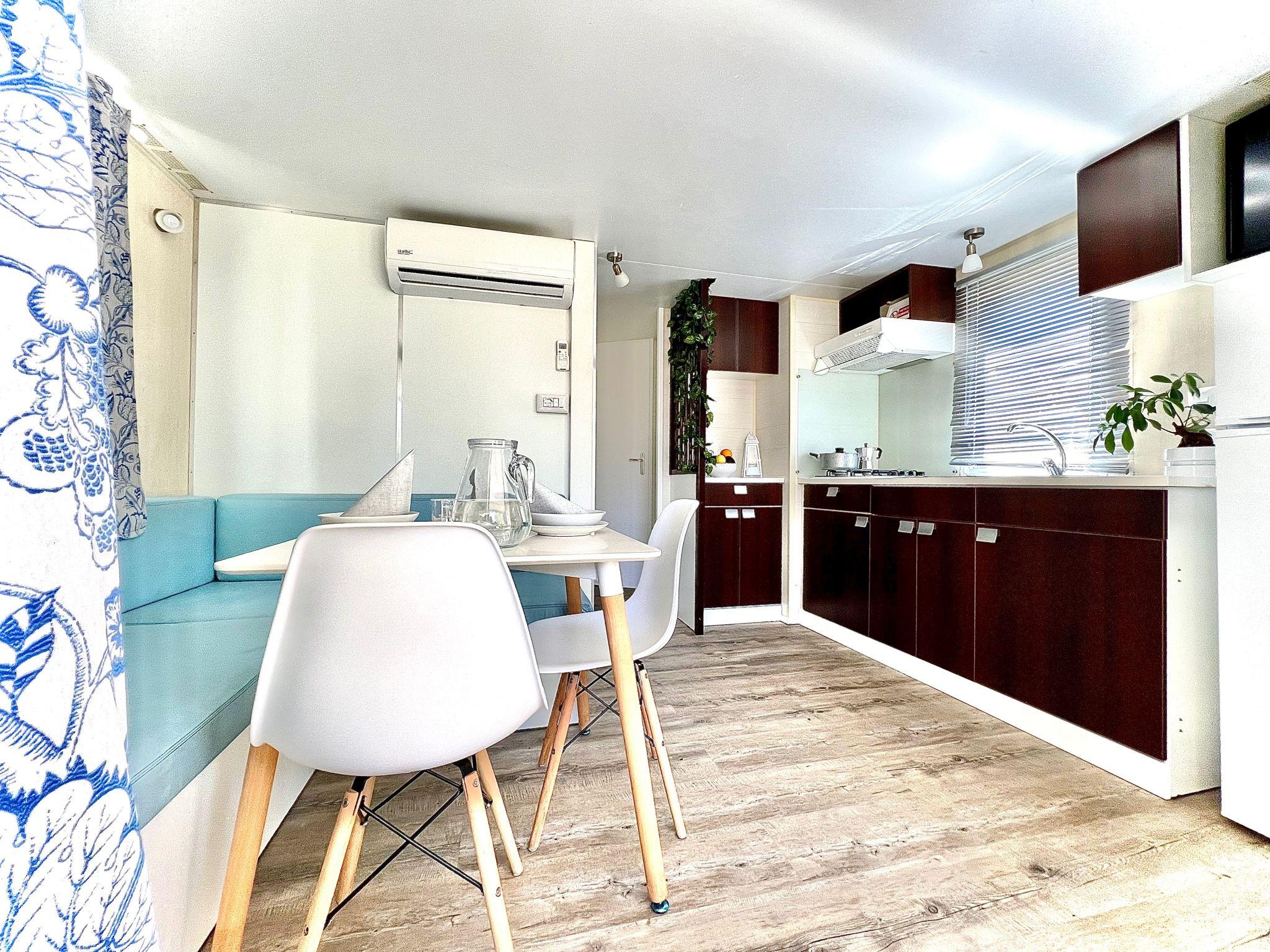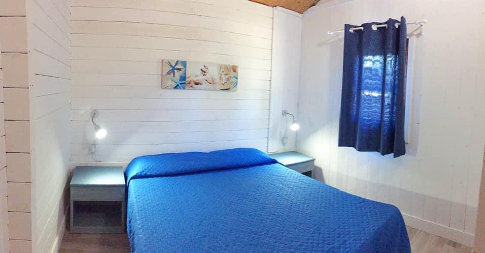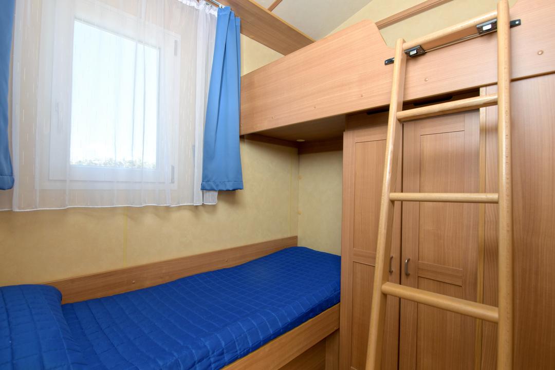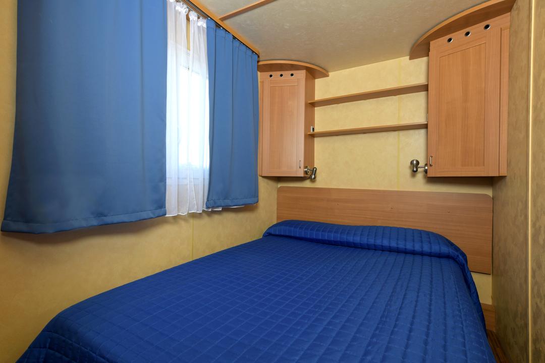 Alojamiento en casas móviles cerca de las piscinas y del parque infantil es la solución ideal para familias con niños. Descripción: habitación doble ( cama francesa), habitación con dos camas individuales, baño con ducha y bidet, cocina con refrigerador/congelador, TV y aire acondicionado/calefacción.