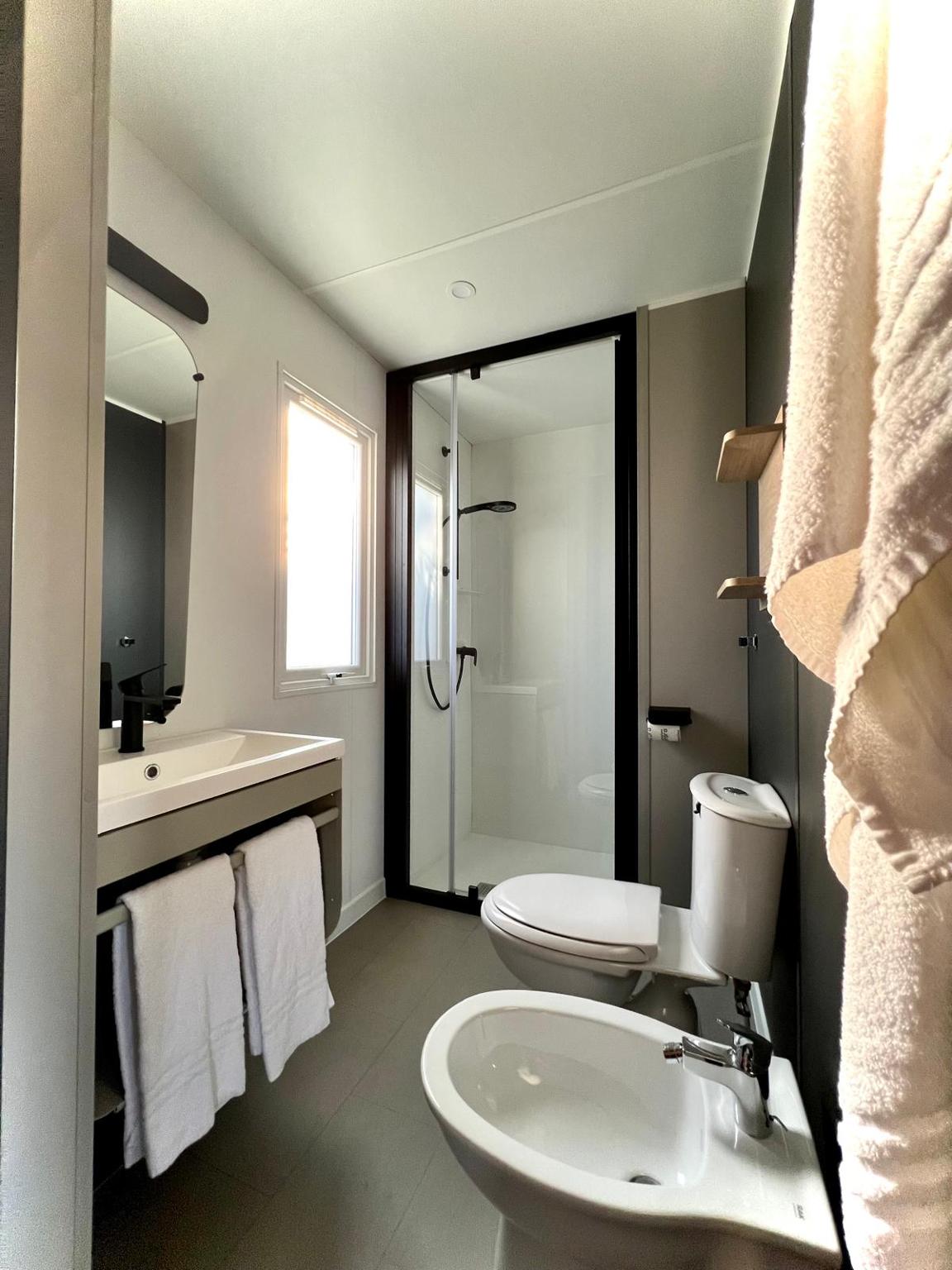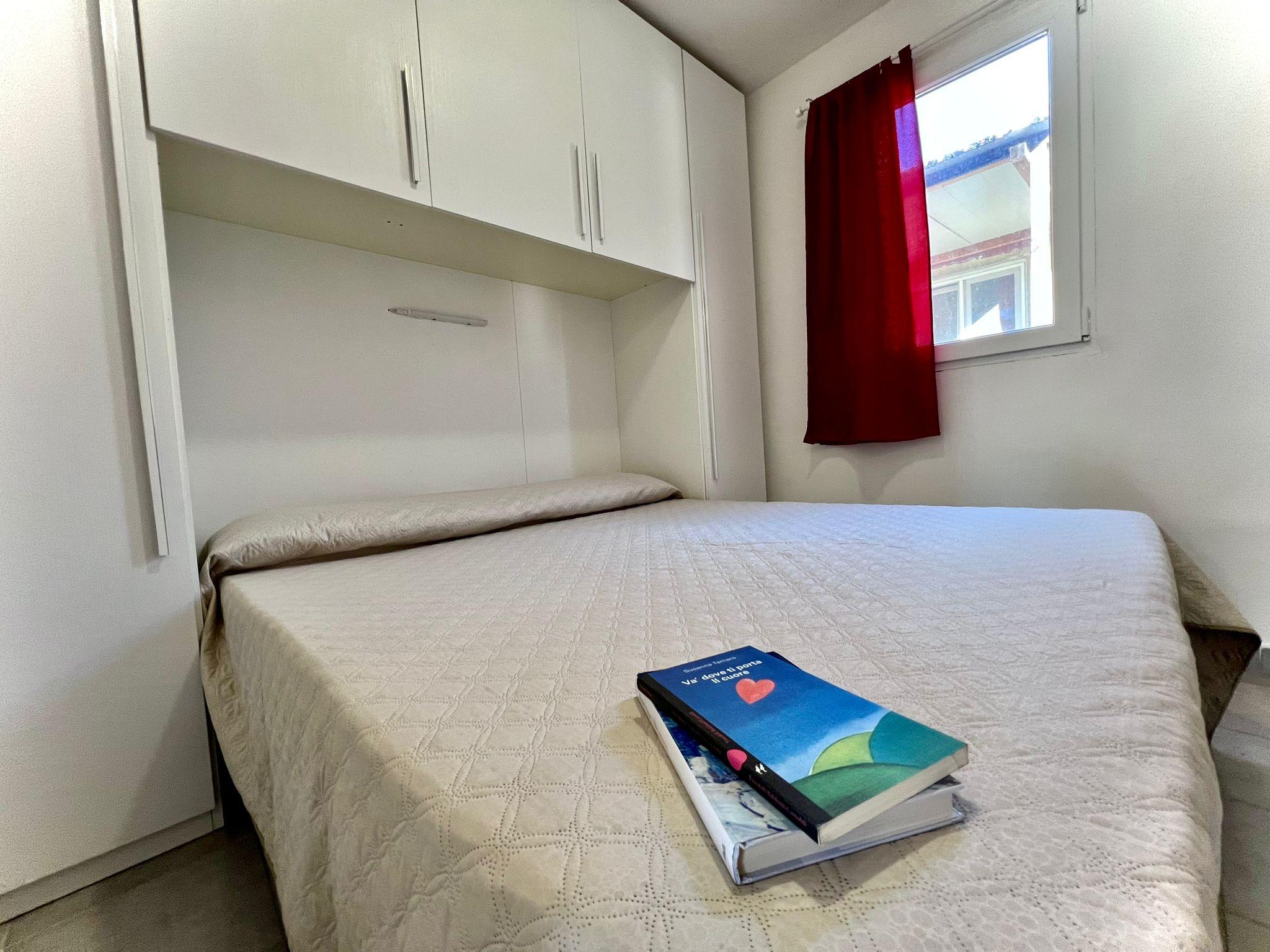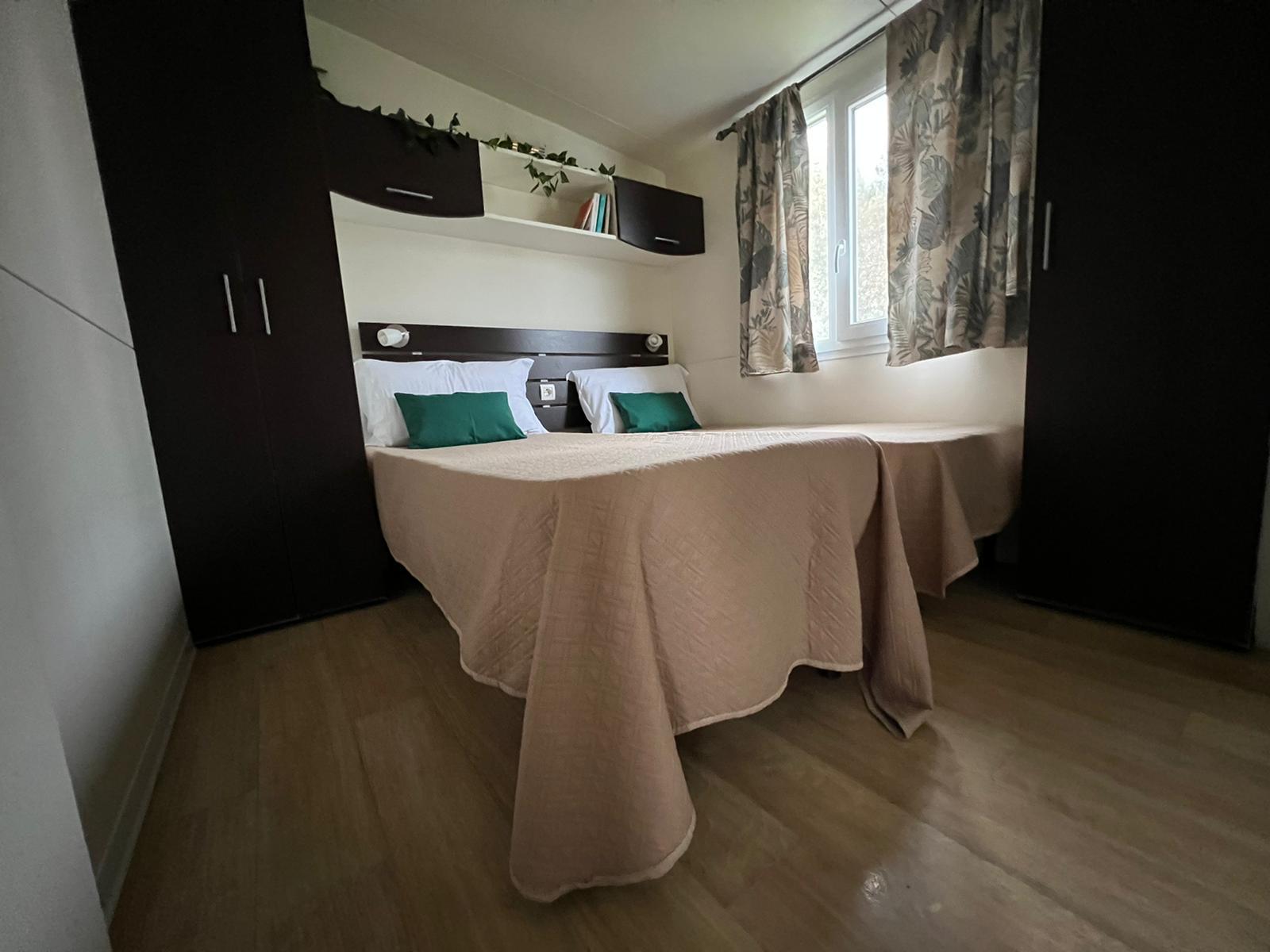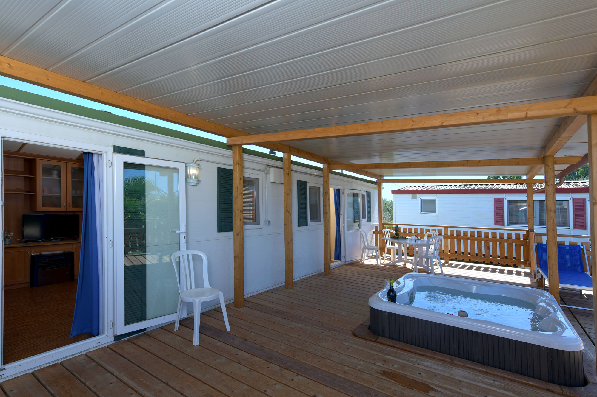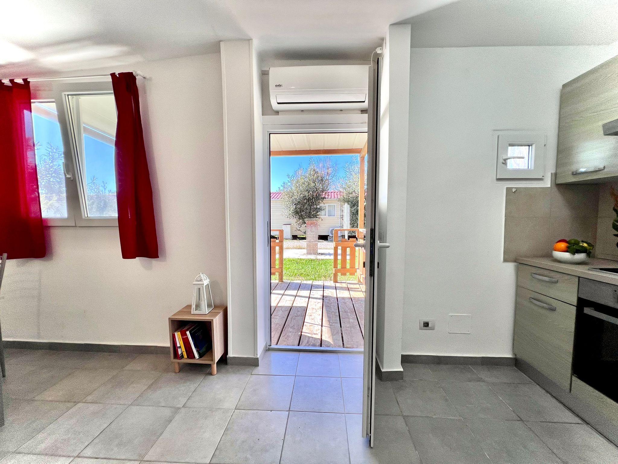 Alojamiento en casas móviles cerca de las piscinas y del parque infantil es la solución ideal para familias con niños. Descripción: habitación doble ( cama francesa), habitación con dos camas individuales, baño con ducha y bidet, cocina con refrigerador/congelador, TV y aire acondicionado/calefacción.