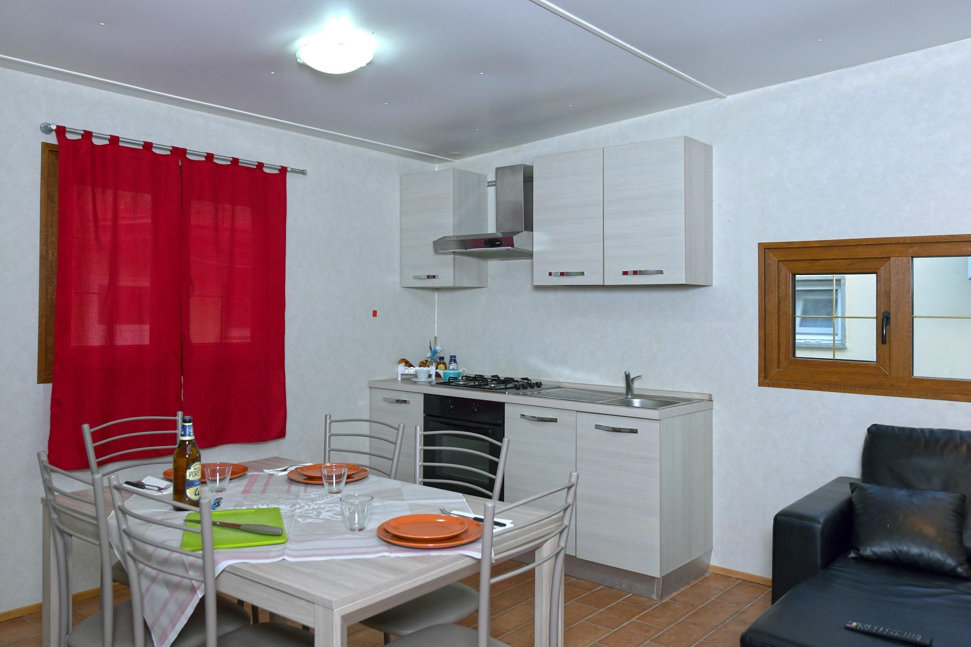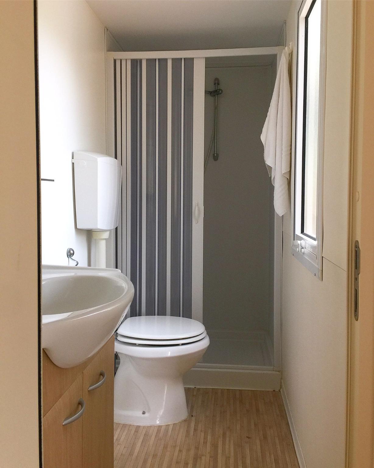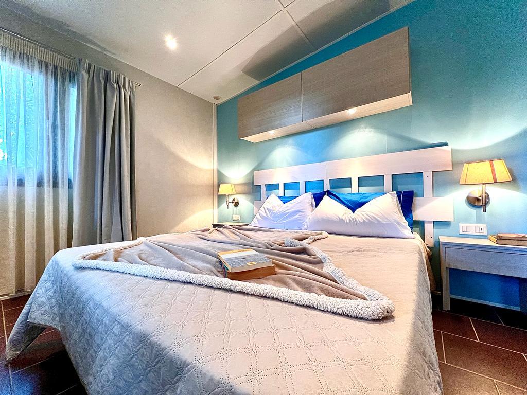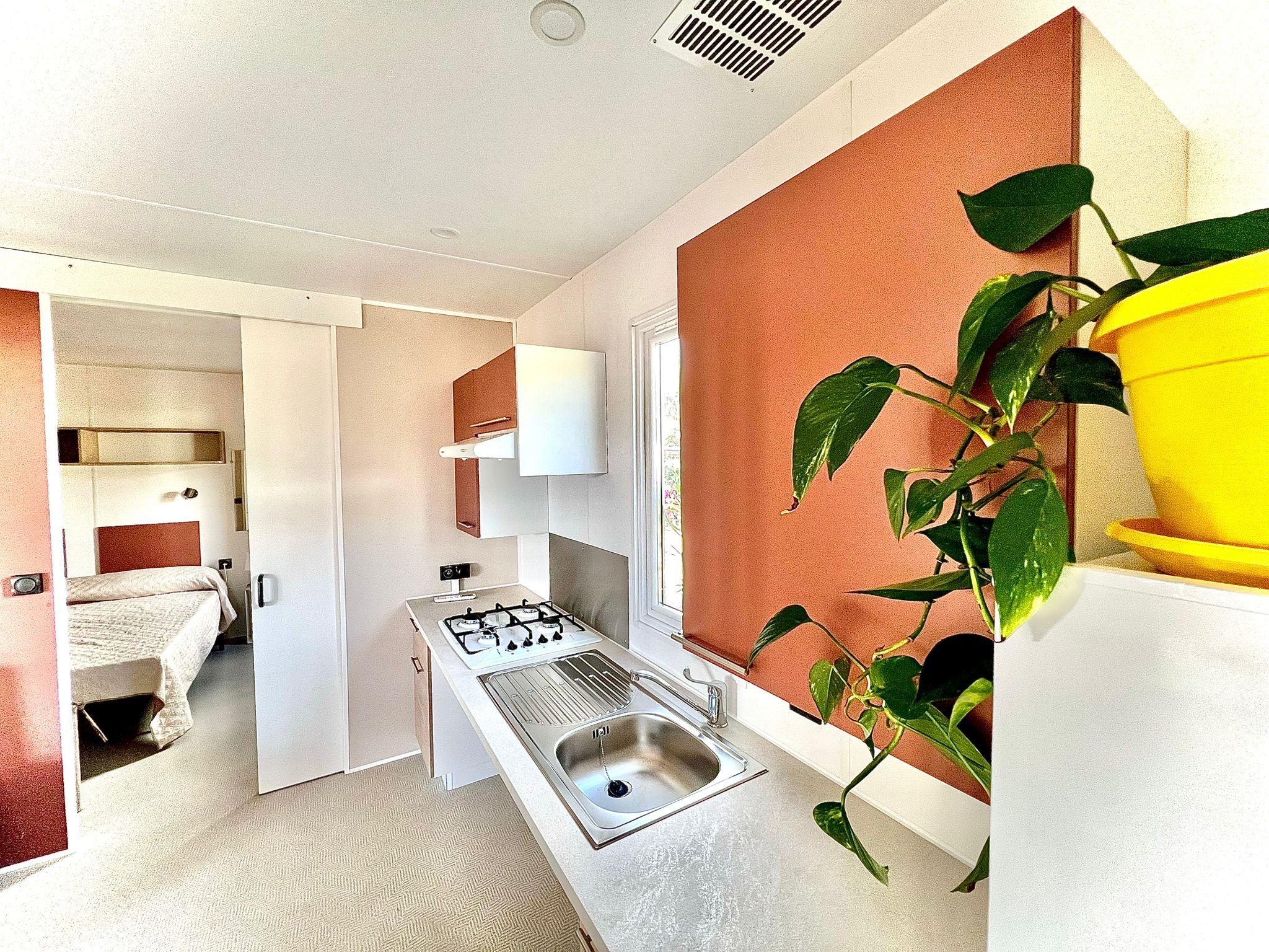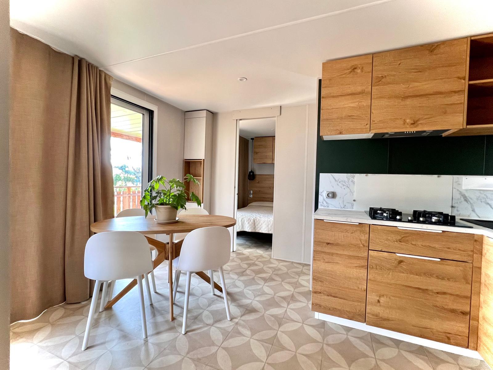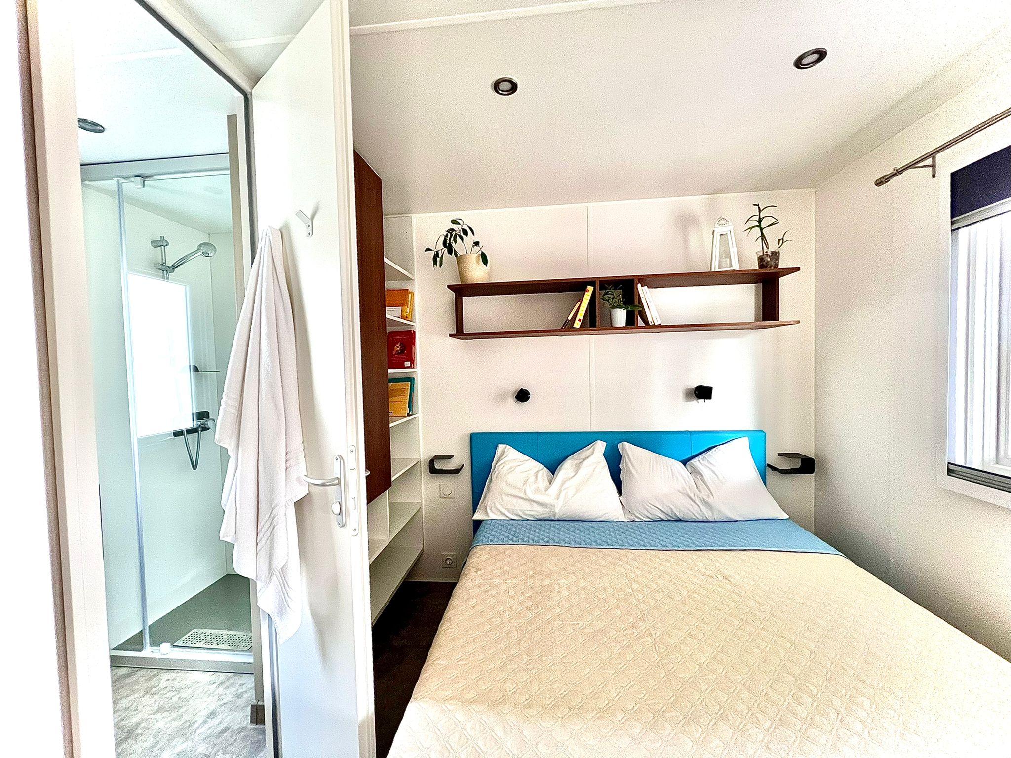 Alojamiento en casas móviles cerca de las piscinas y del parque infantil es la solución ideal para familias con niños. Descripción: habitación doble ( cama francesa), habitación con dos camas individuales, baño con ducha y bidet, cocina con refrigerador/congelador, TV y aire acondicionado/calefacción.