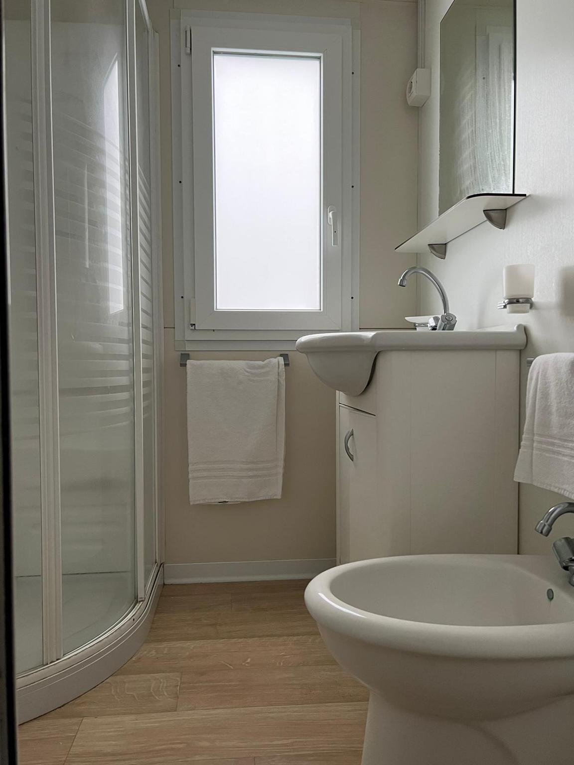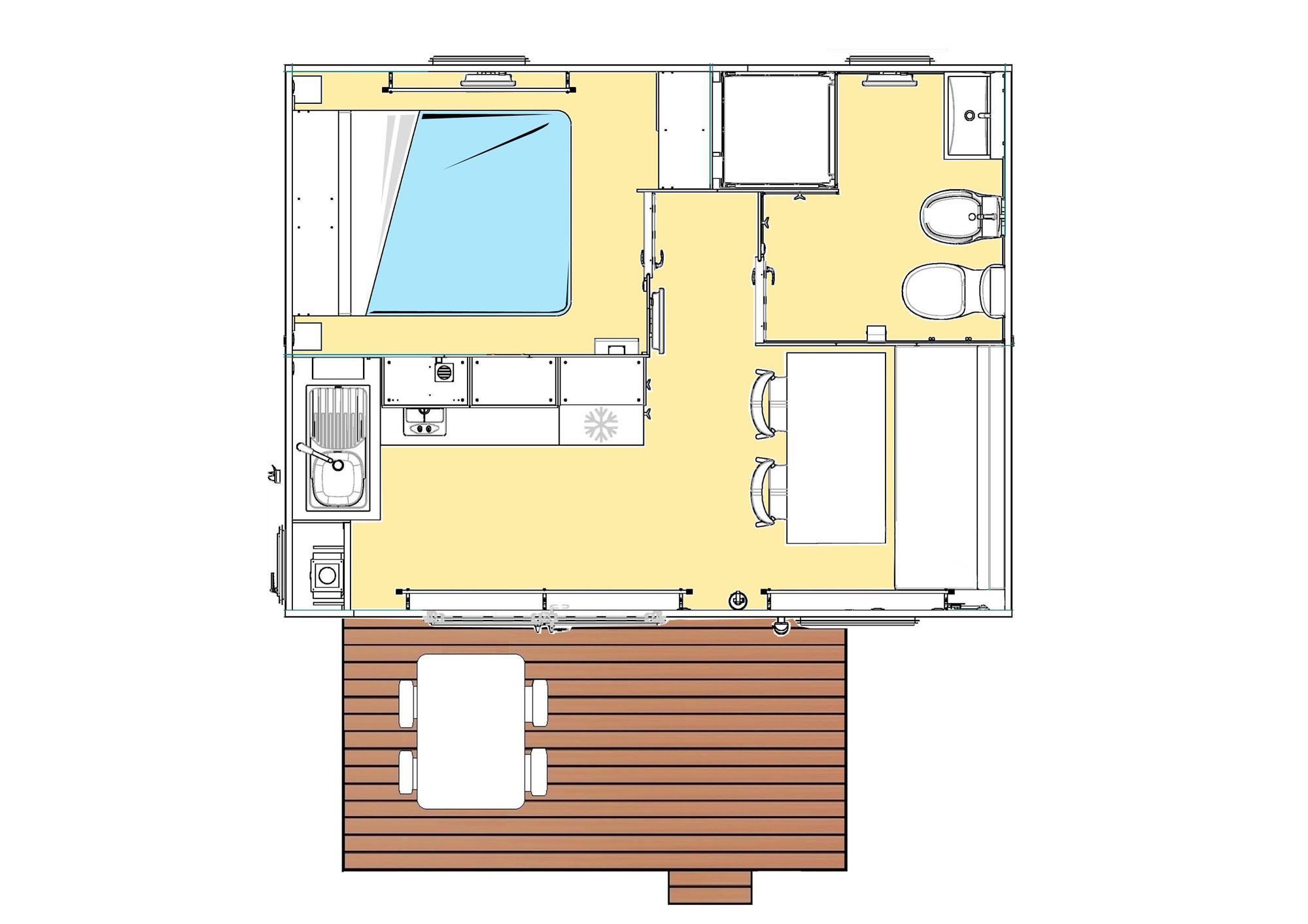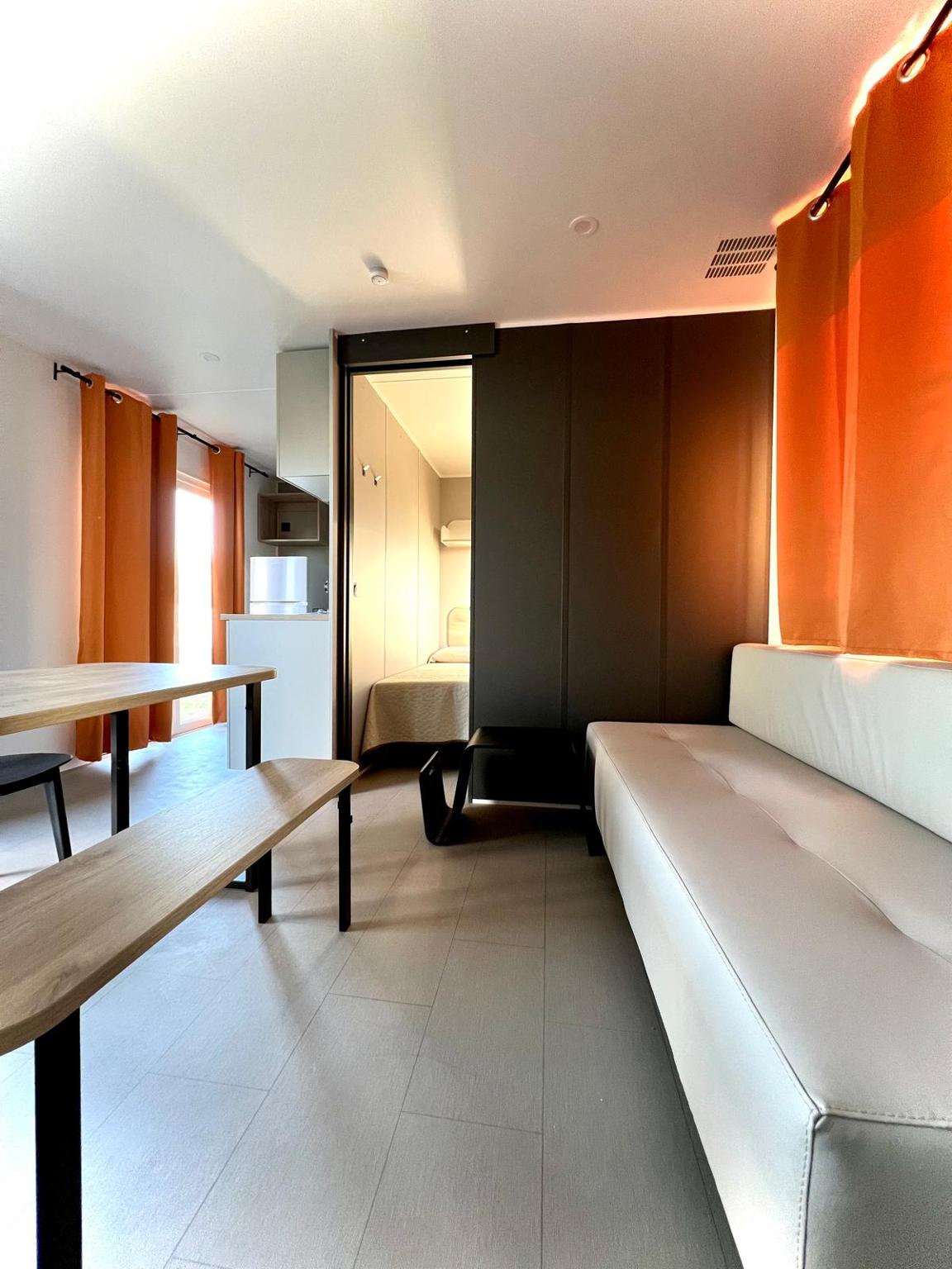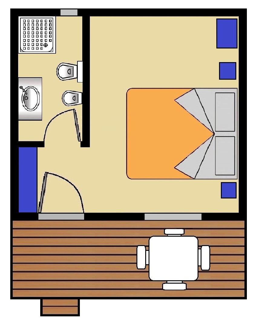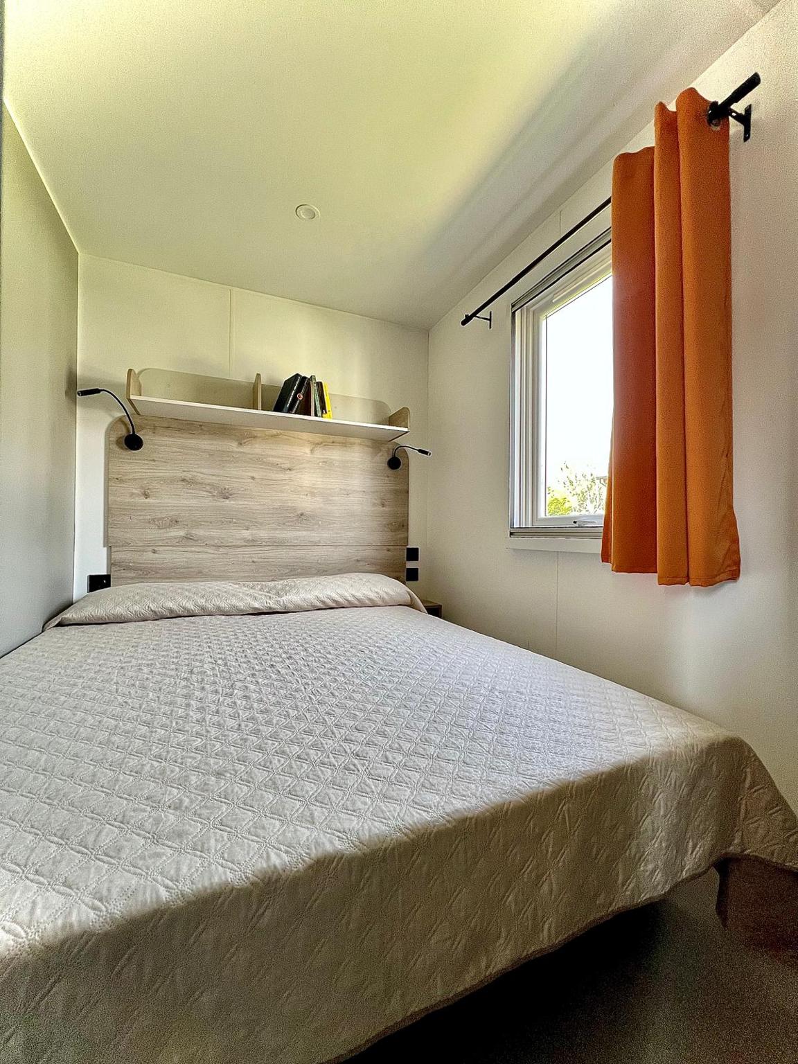 Alojamiento en casas móviles cerca de las piscinas y del parque infantil es la solución ideal para familias con niños. Descripción: habitación doble ( cama francesa), habitación con dos camas individuales, baño con ducha y bidet, cocina con refrigerador/congelador, TV y aire acondicionado/calefacción.