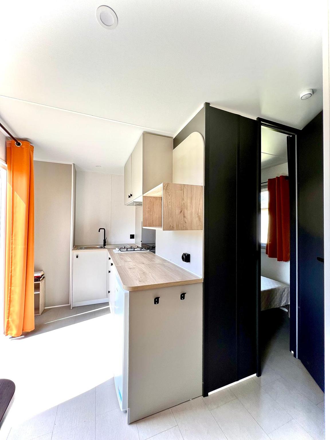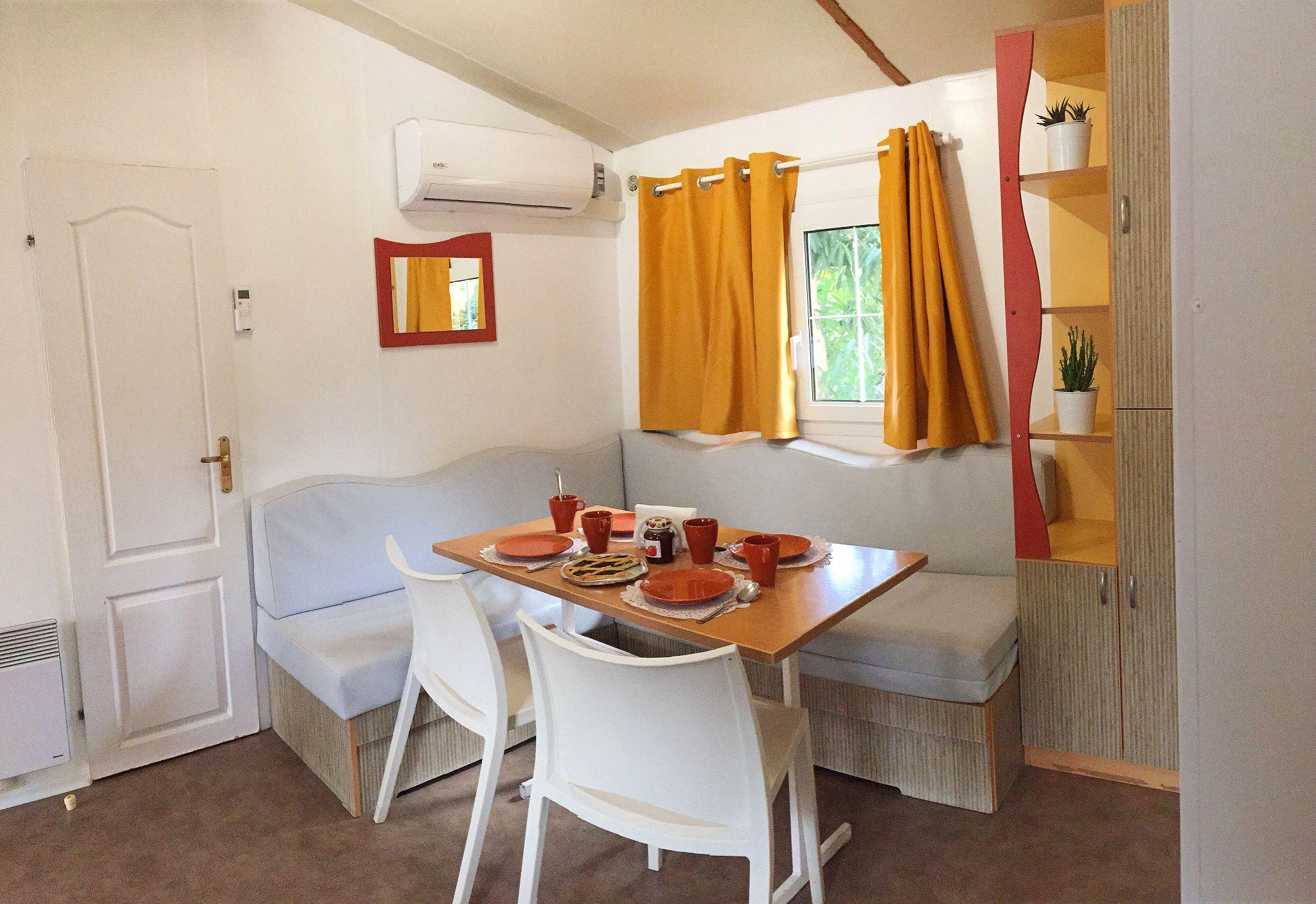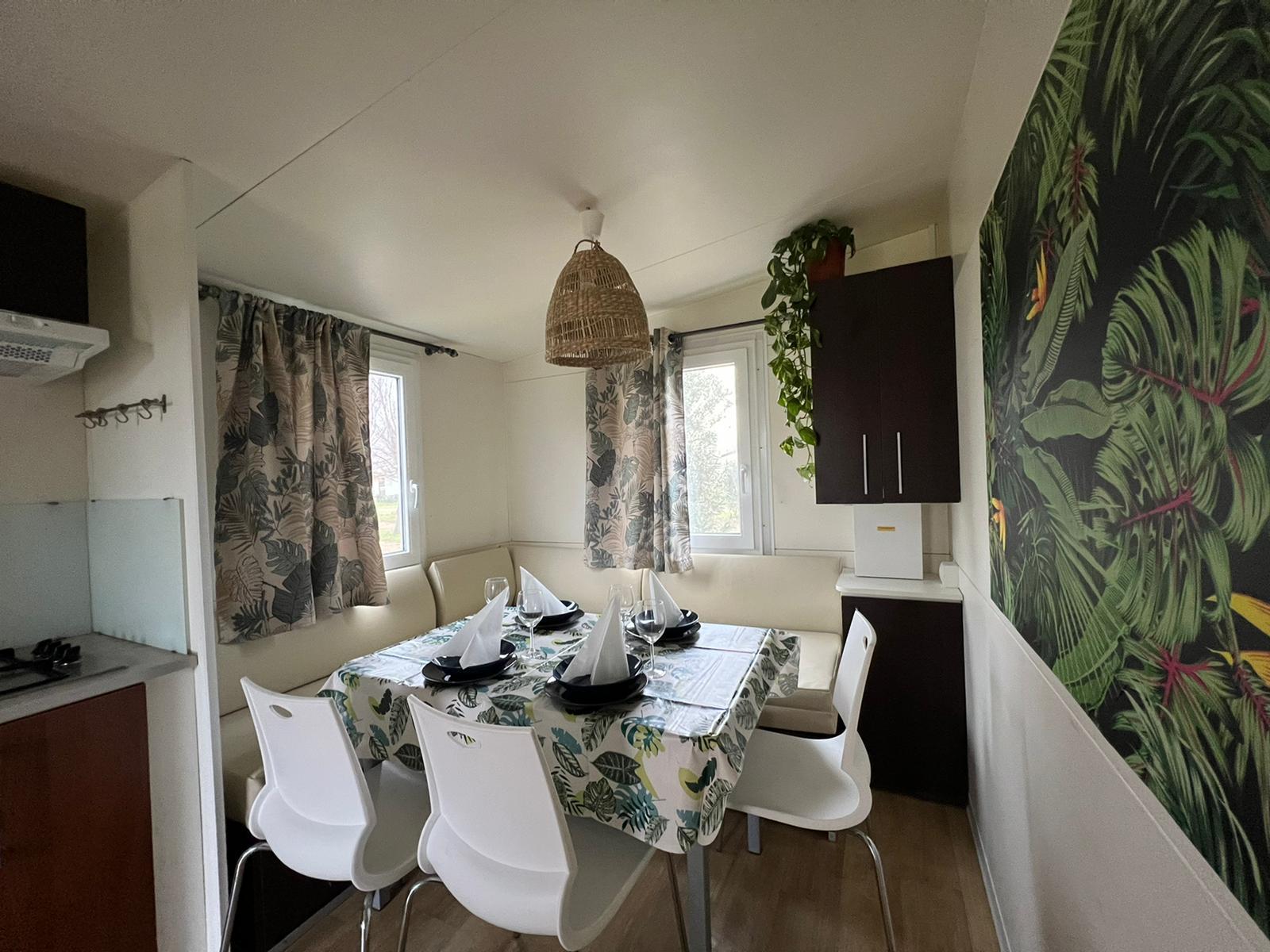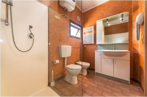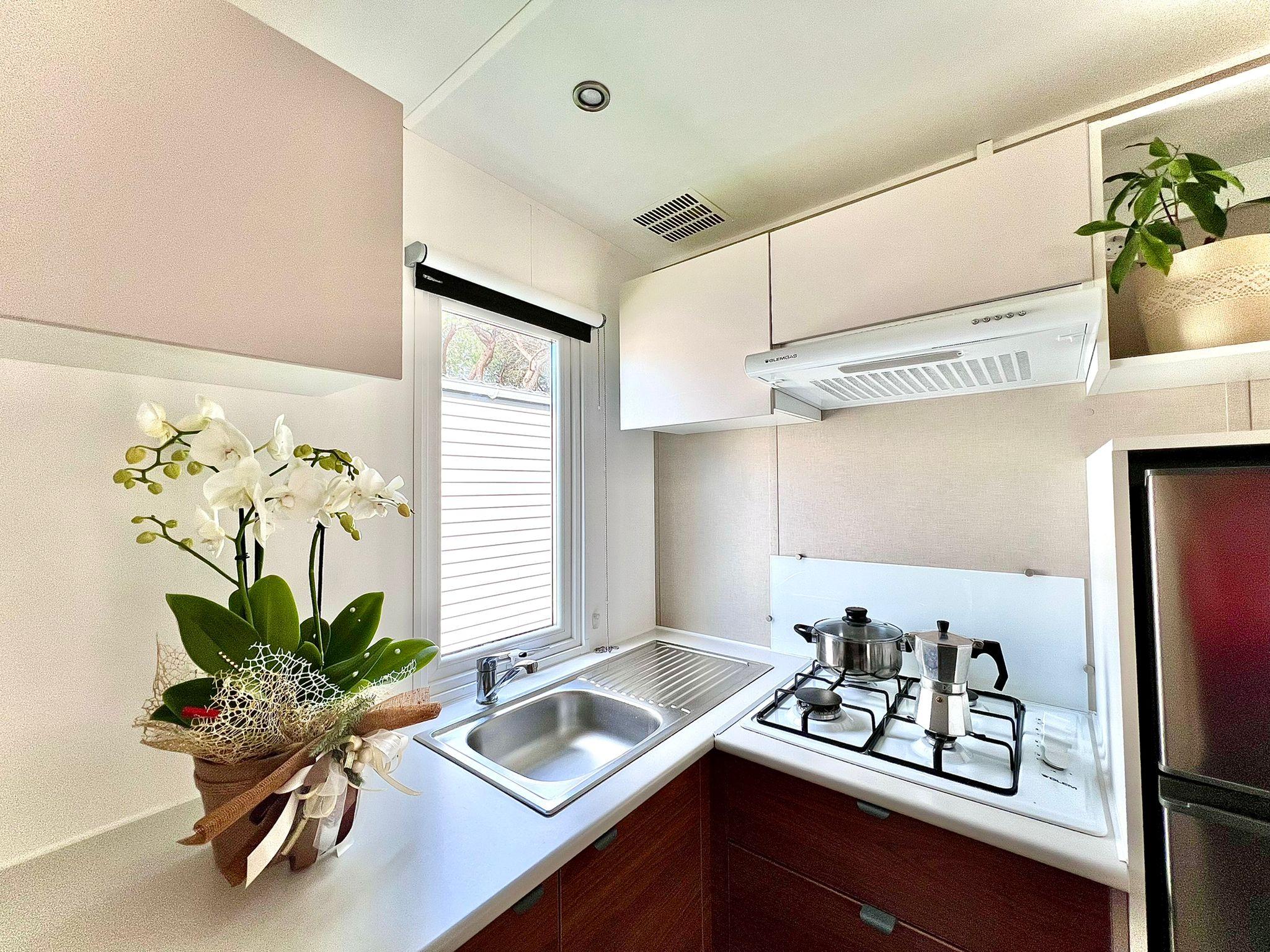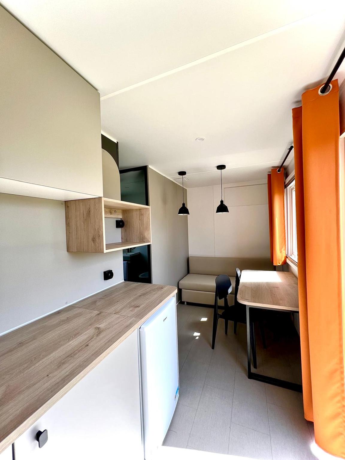 Alojamiento en casas móviles cerca de las piscinas y del parque infantil es la solución ideal para familias con niños. Descripción: habitación doble ( cama francesa), habitación con dos camas individuales, baño con ducha y bidet, cocina con refrigerador/congelador, TV y aire acondicionado/calefacción.
