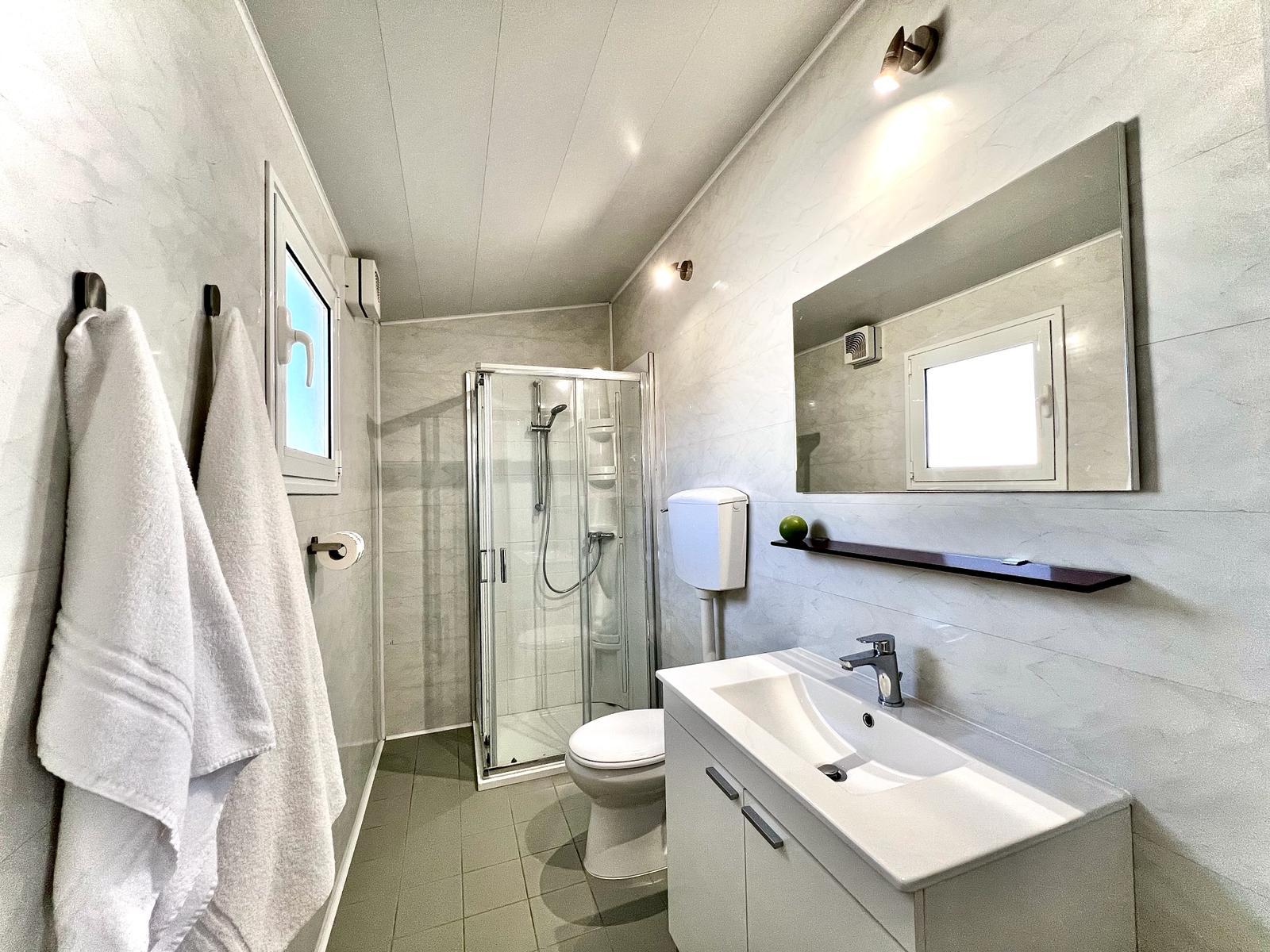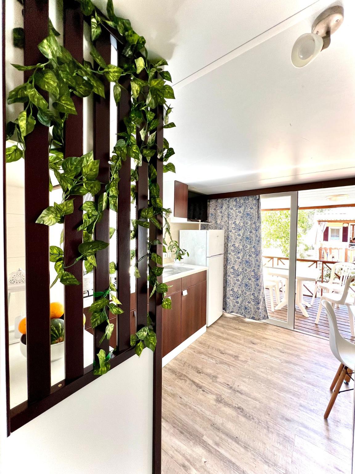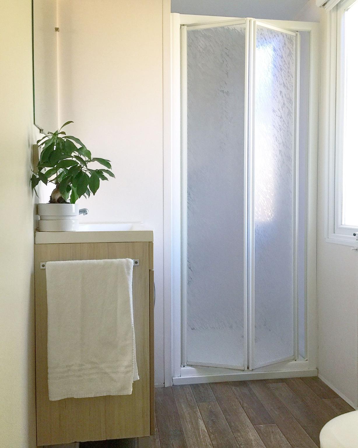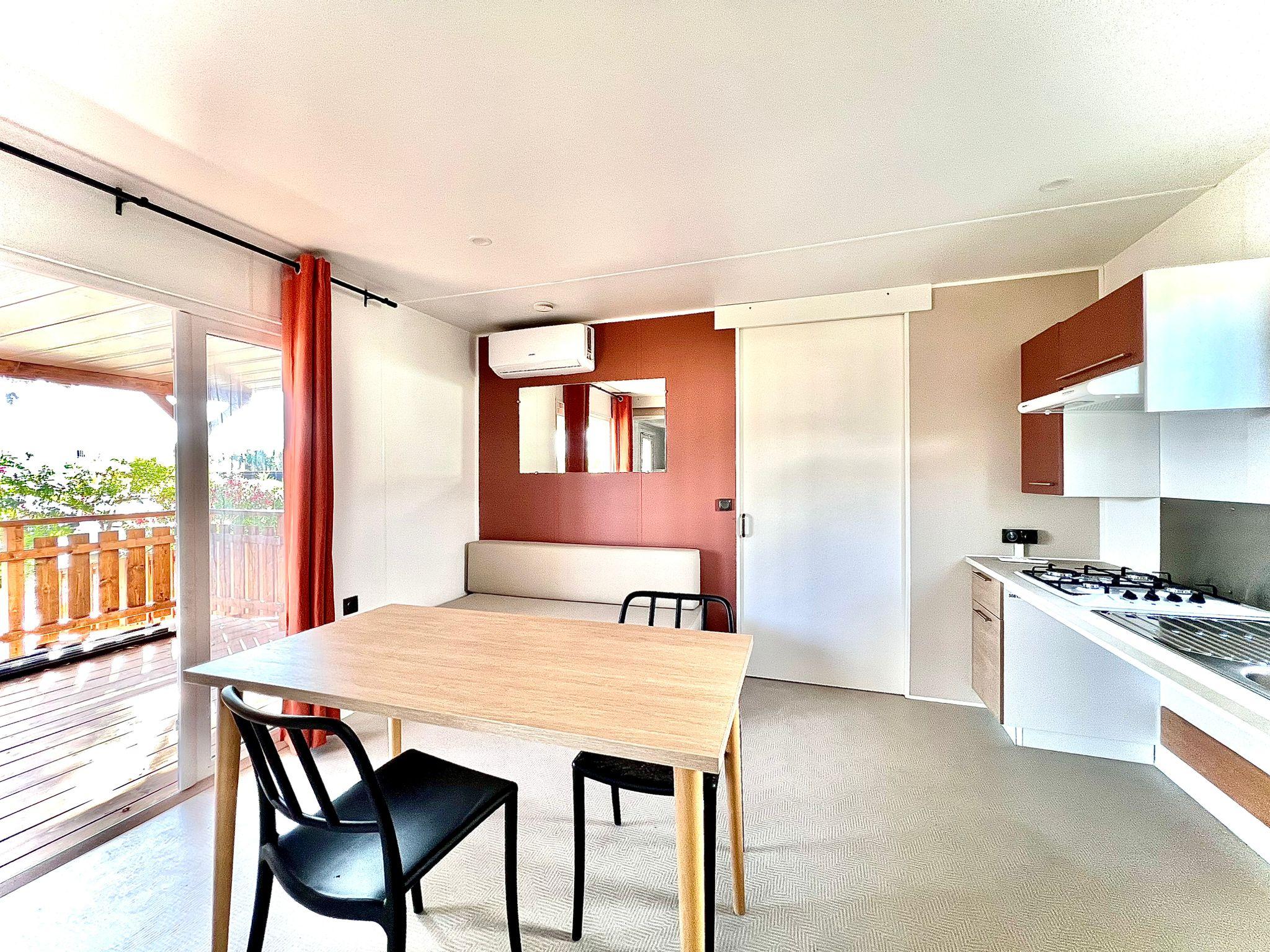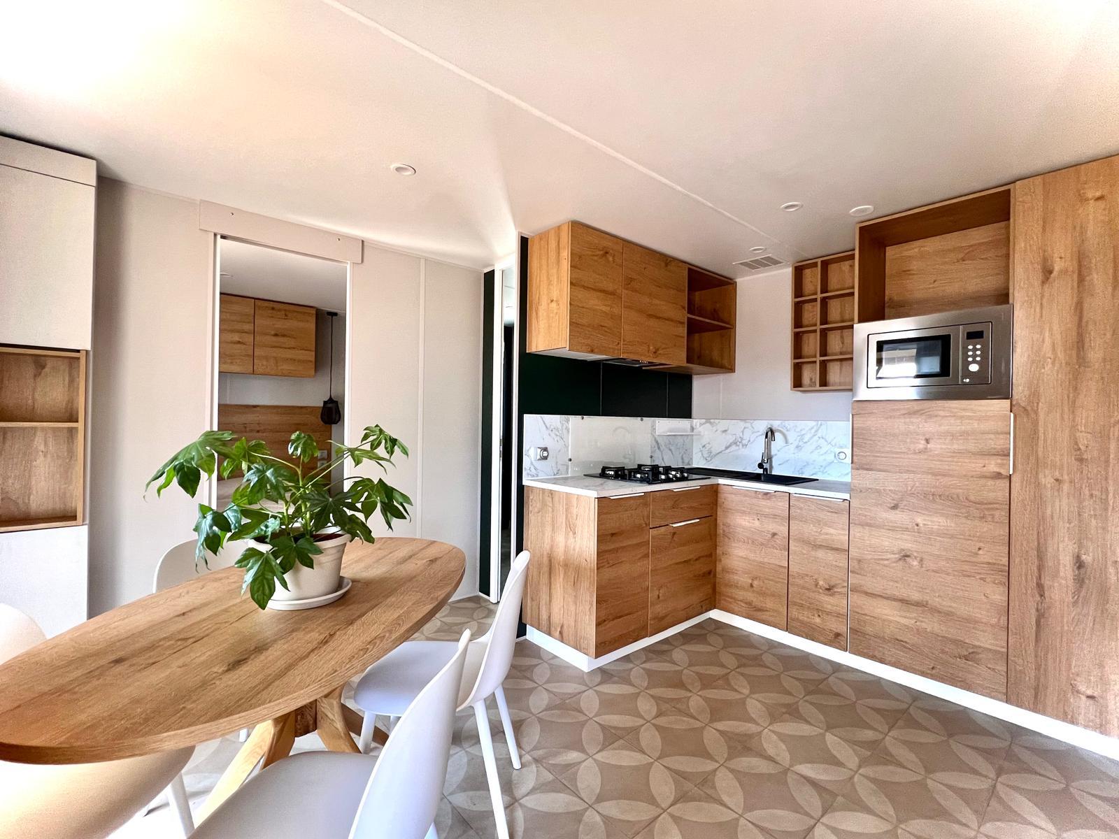 Alojamiento en casas móviles cerca de las piscinas y del parque infantil es la solución ideal para familias con niños. Descripción: habitación doble ( cama francesa), habitación con dos camas individuales, baño con ducha y bidet, cocina con refrigerador/congelador, TV y aire acondicionado/calefacción.