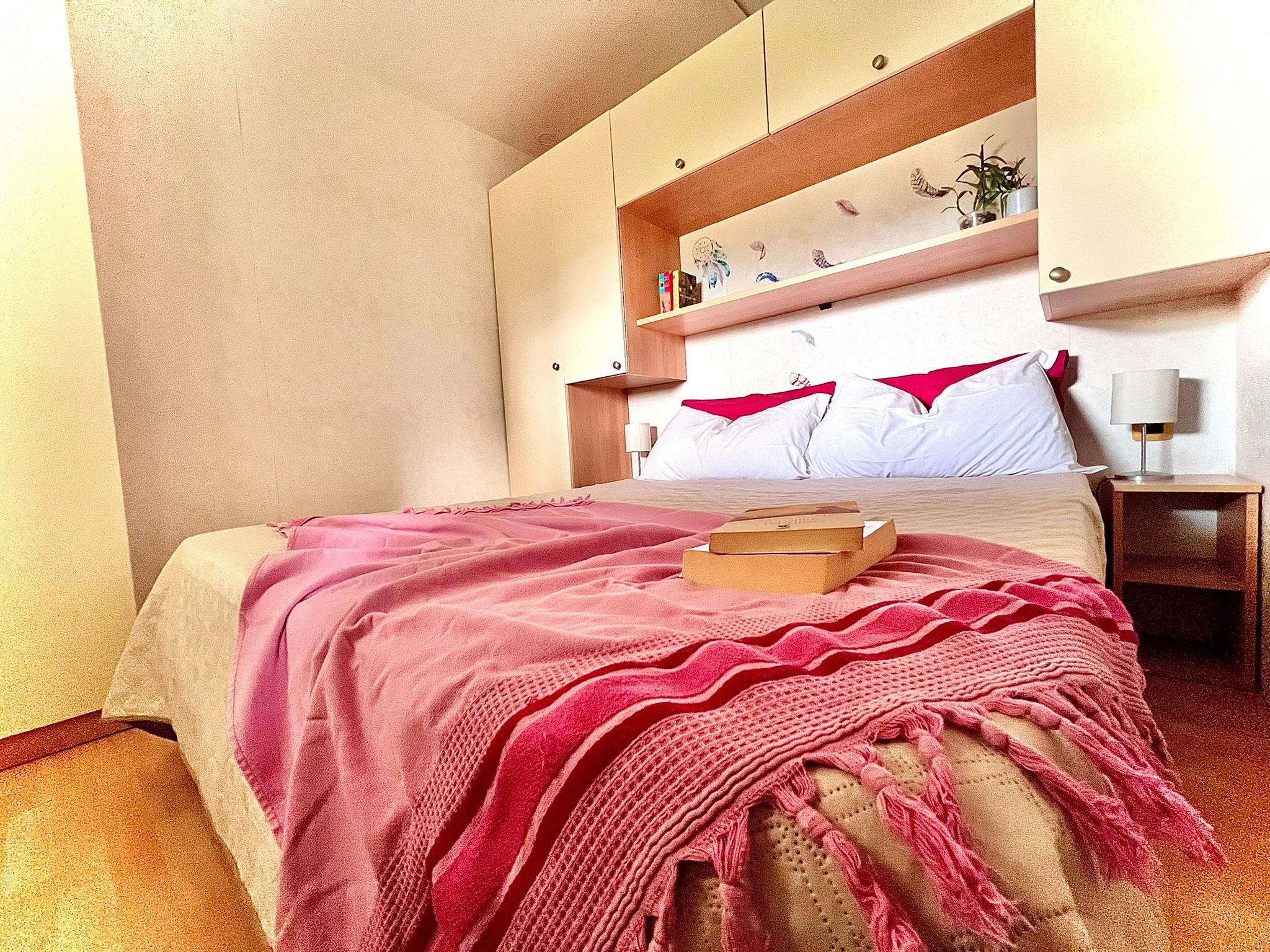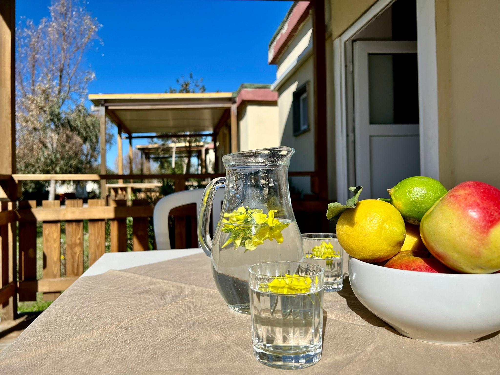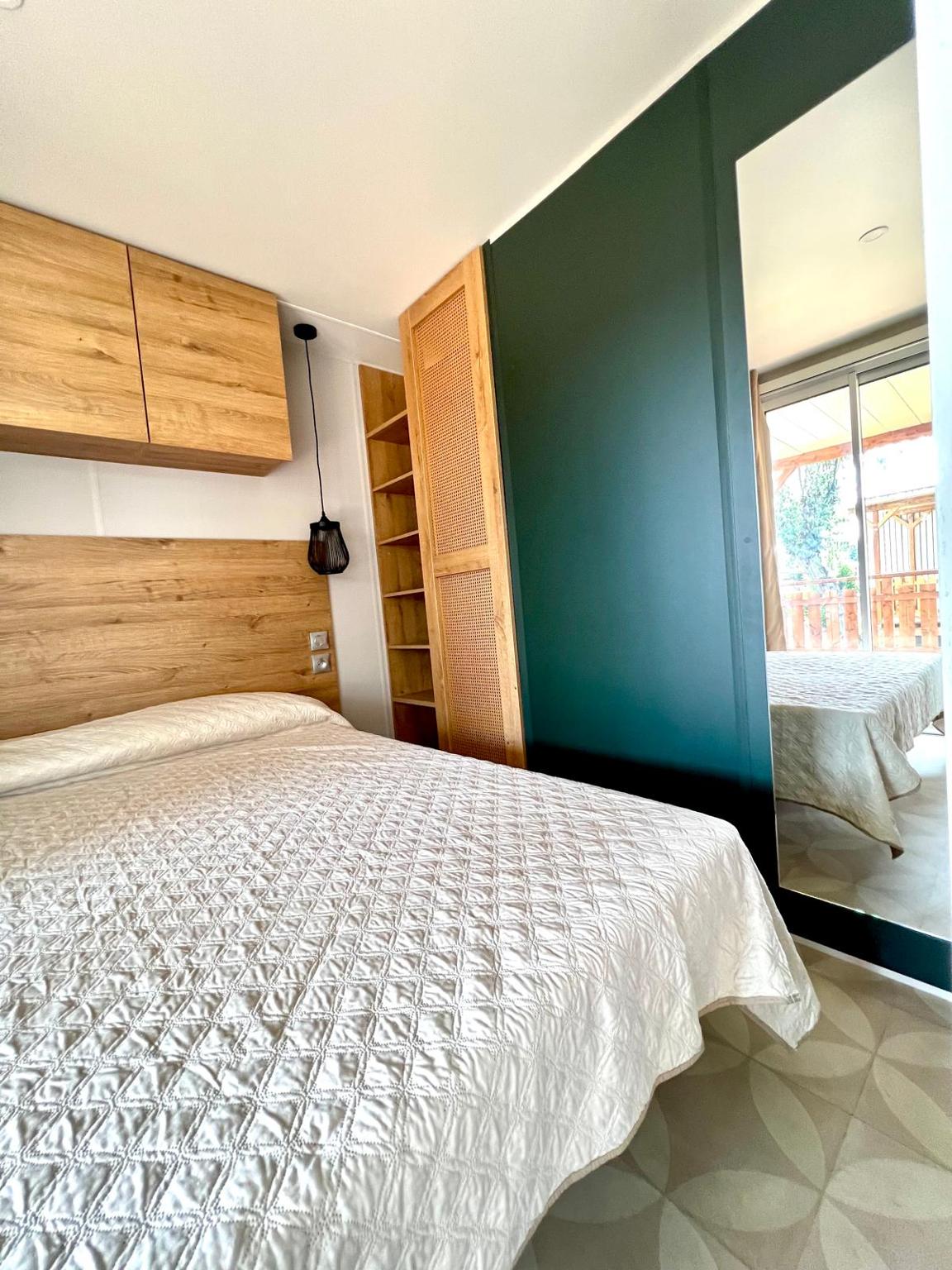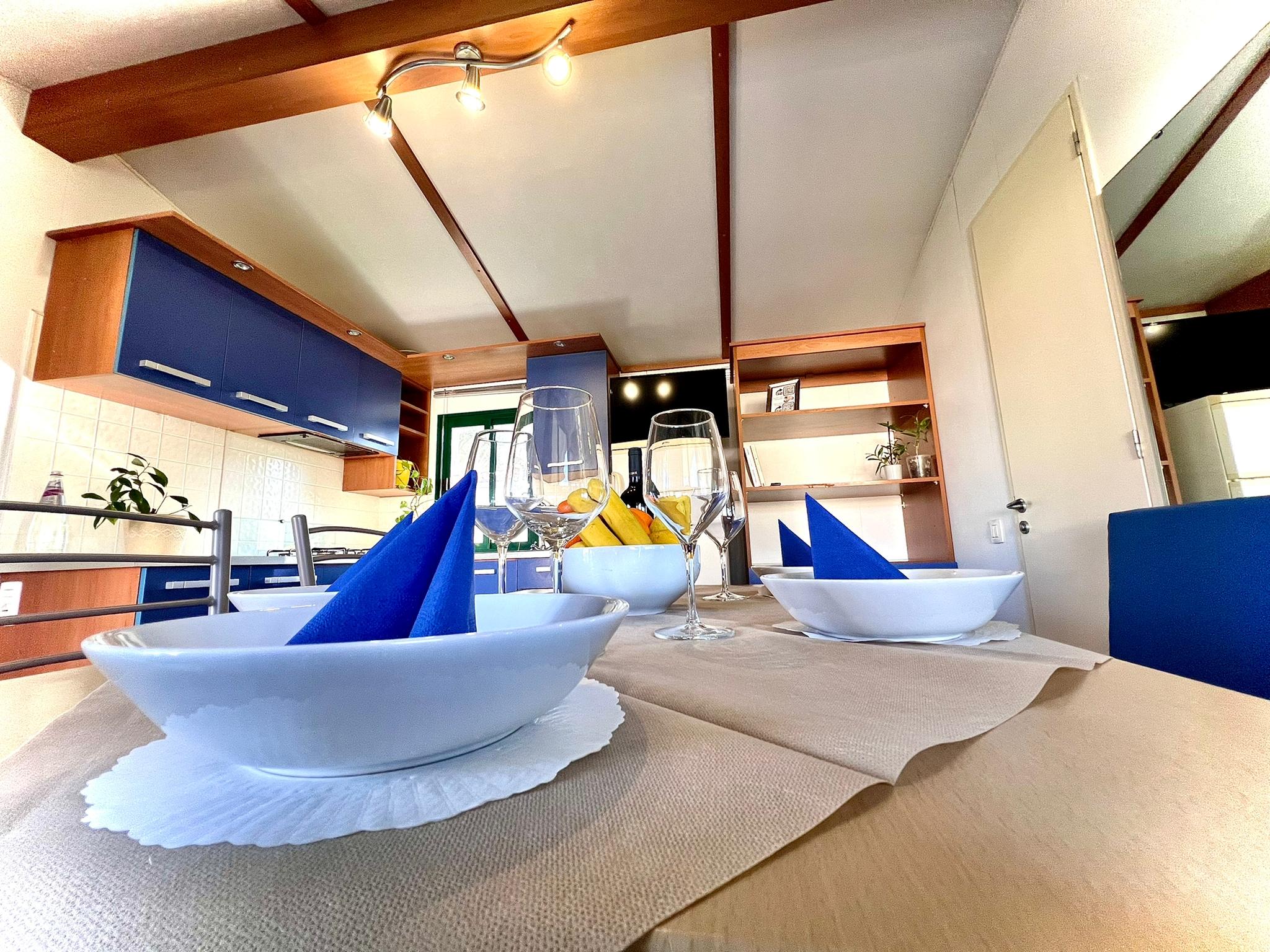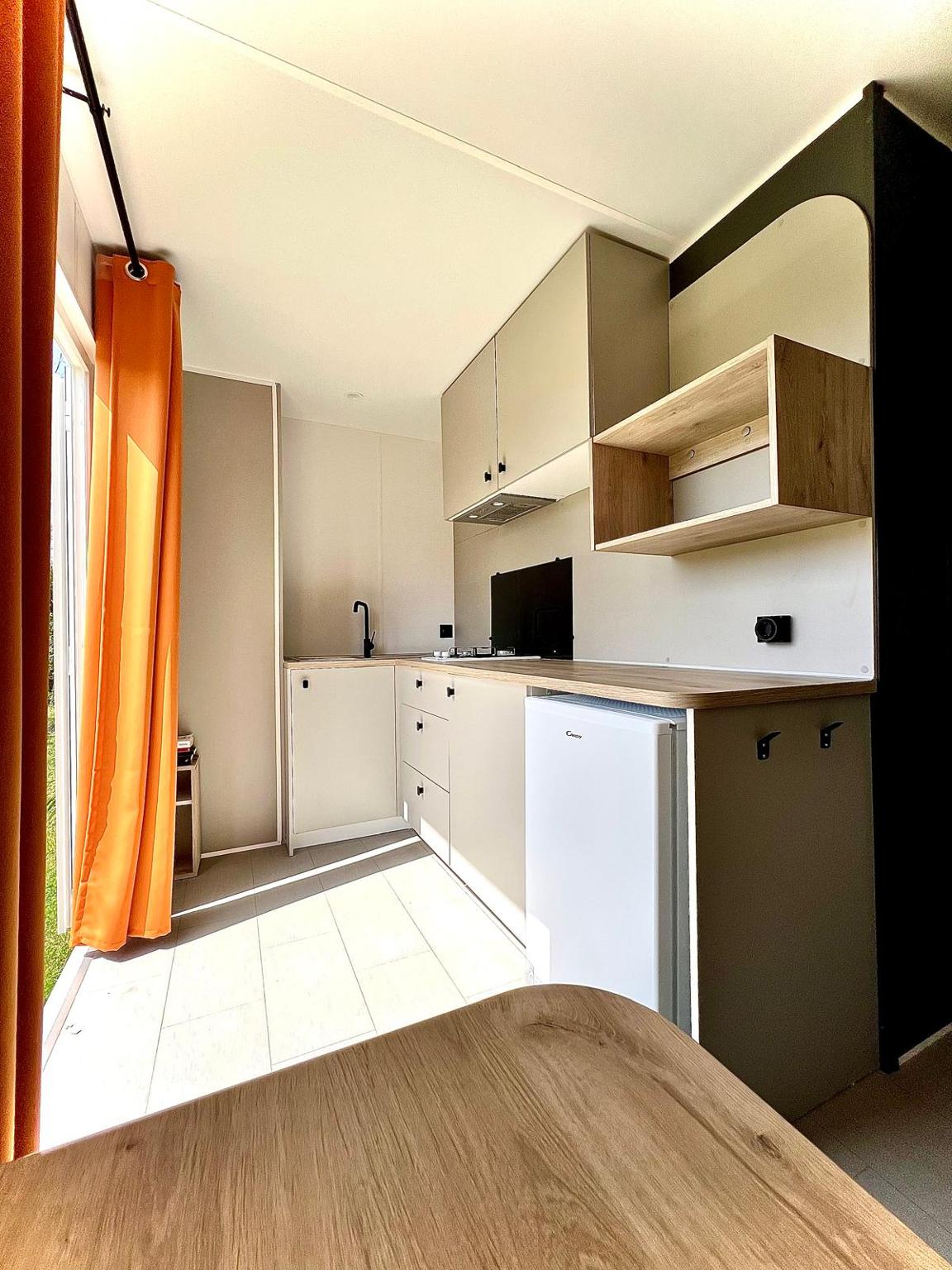 Alojamiento en casas móviles cerca de las piscinas y del parque infantil es la solución ideal para familias con niños. Descripción: habitación doble ( cama francesa), habitación con dos camas individuales, baño con ducha y bidet, cocina con refrigerador/congelador, TV y aire acondicionado/calefacción.