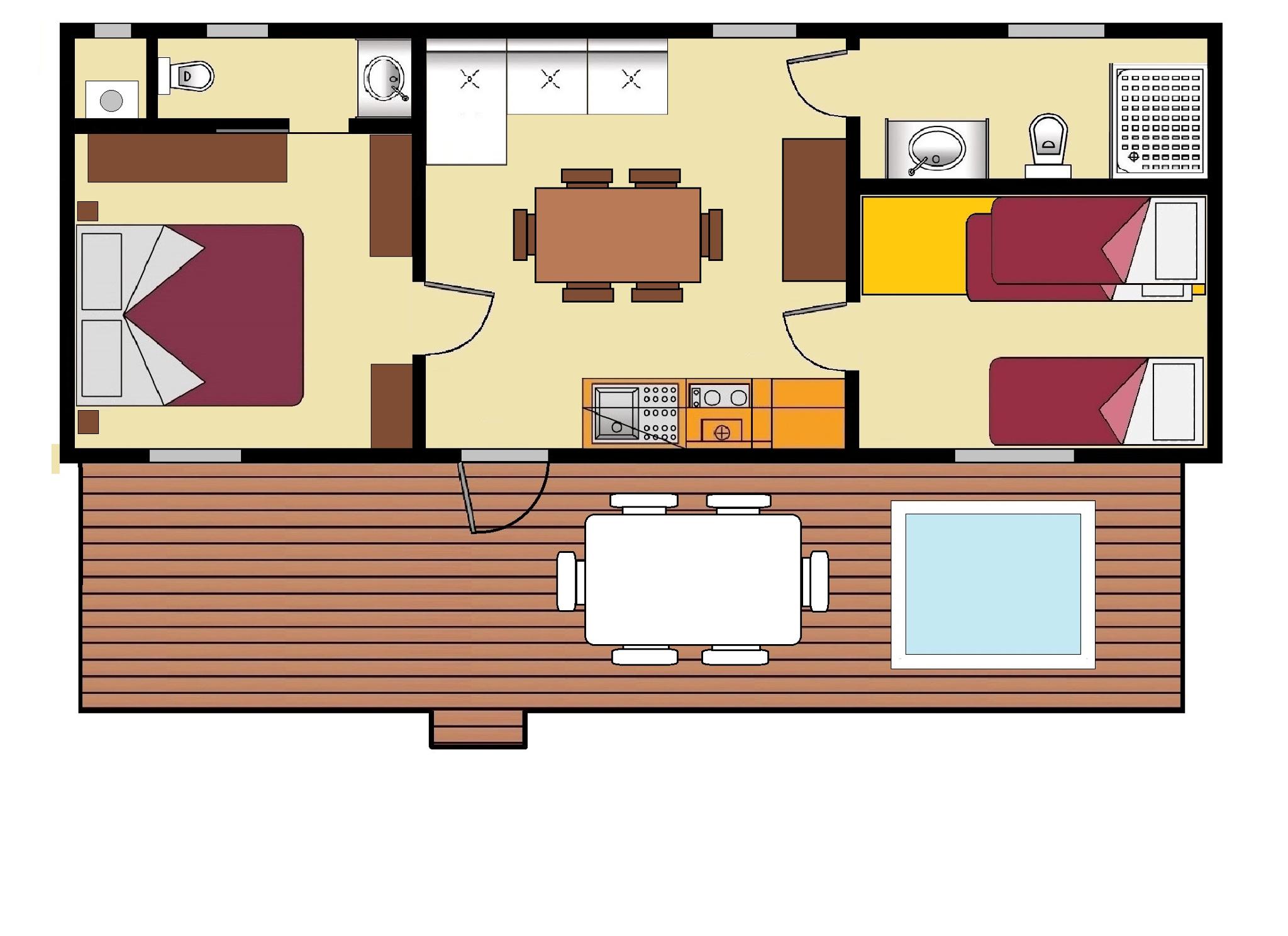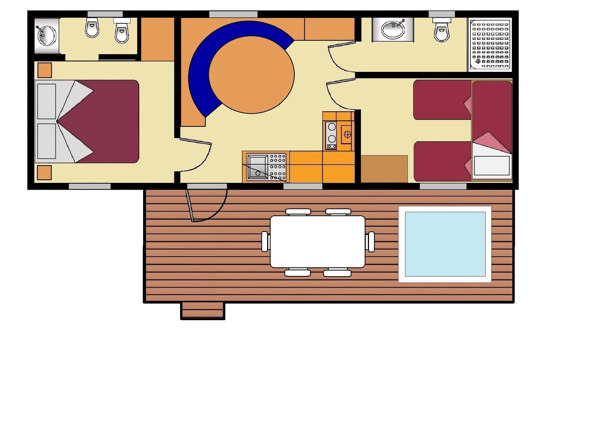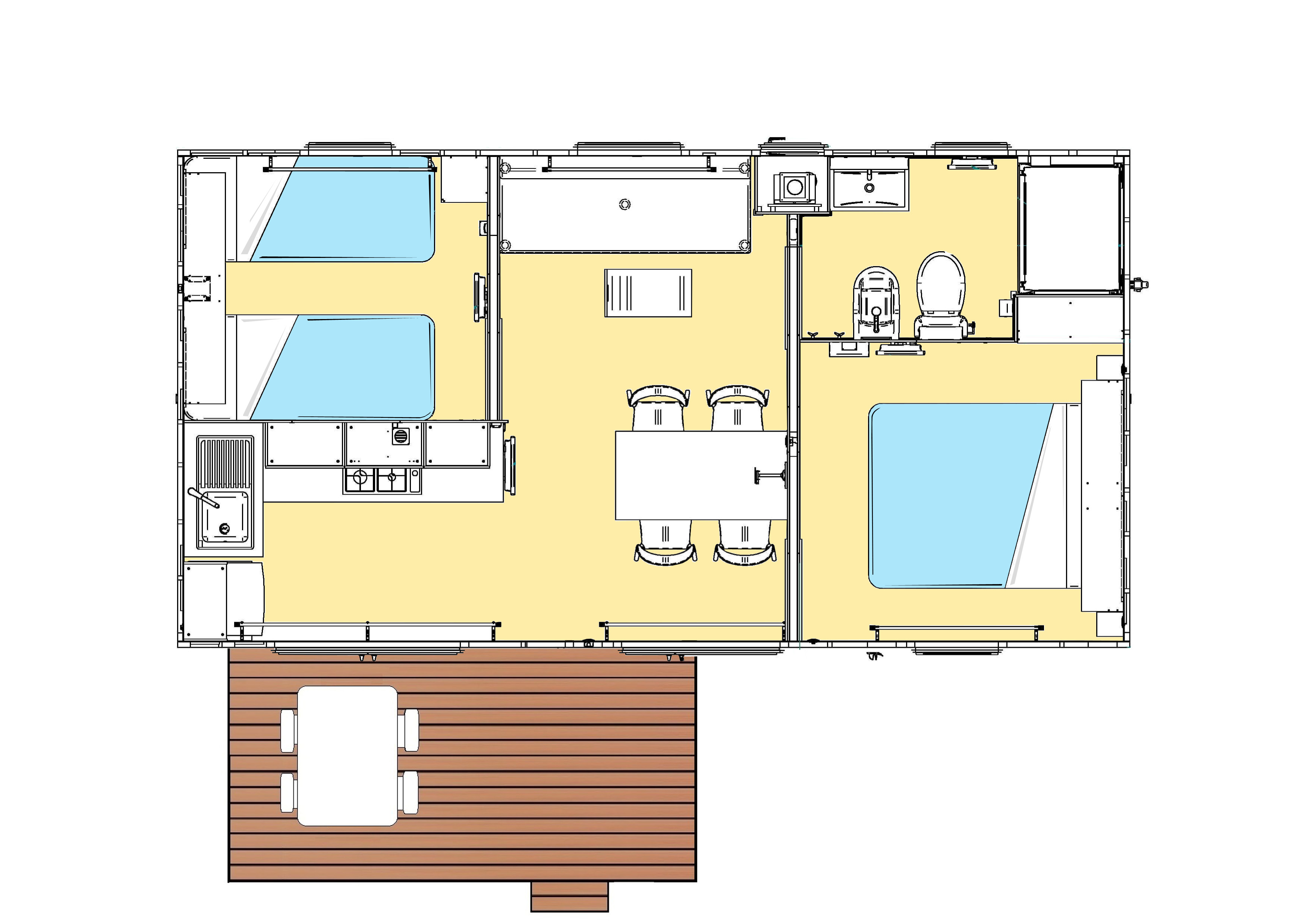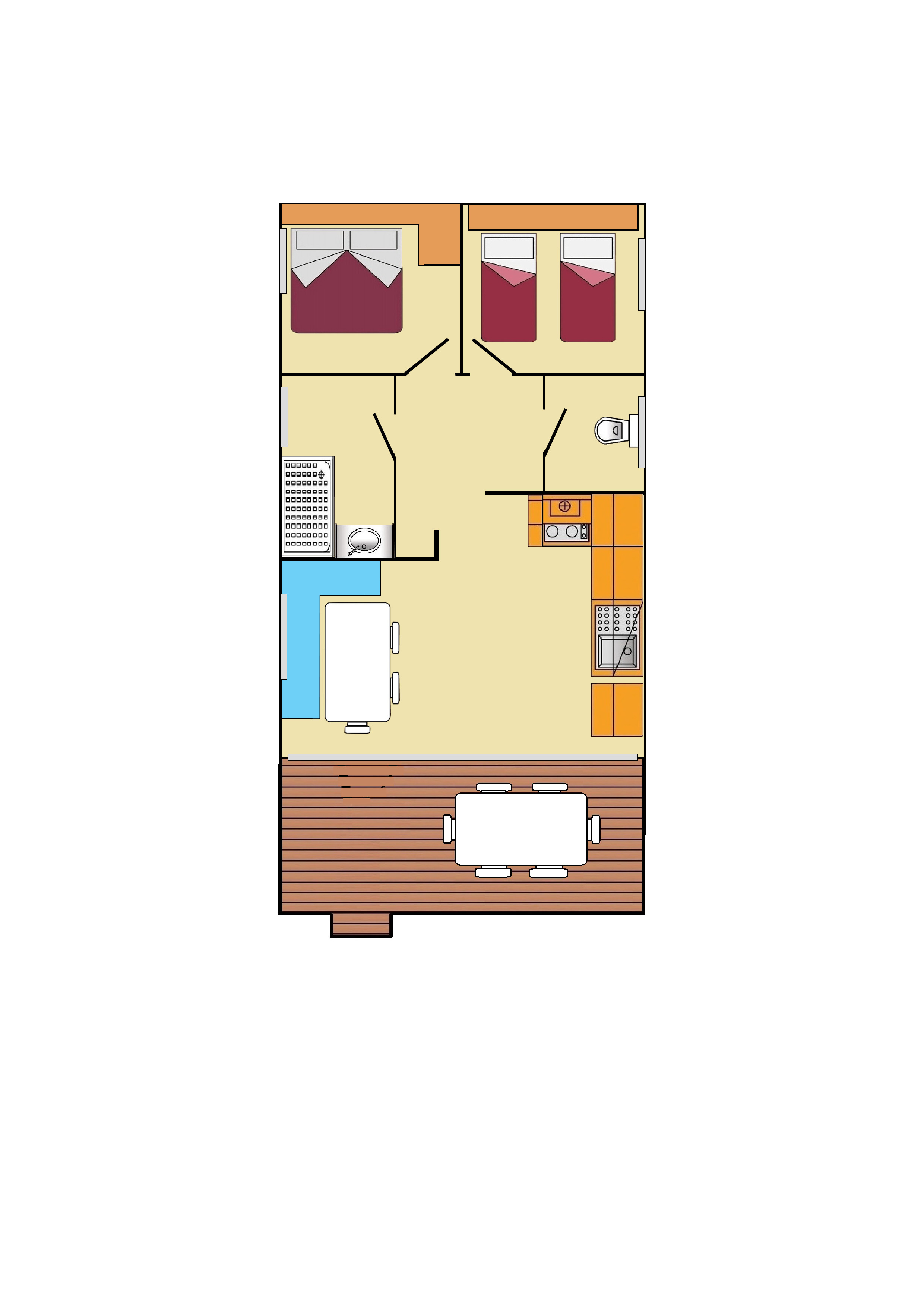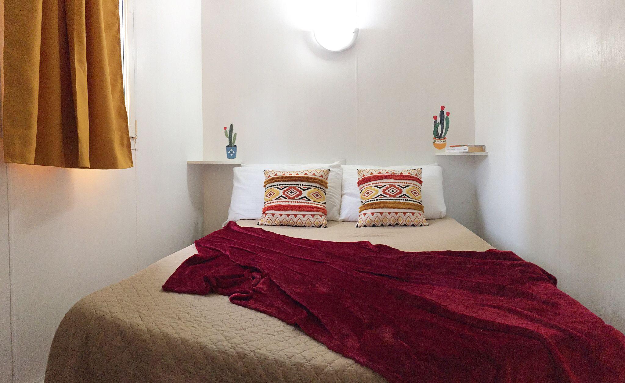 El alojamiento en casas móviles es la solución ideal para familias. Simples y funcionales, combinan calidad y comodidad.DESCRIPCIÓN: habitacion con cama francesa, habitacion con camas individuales, cocina con fregadero y frigorífico/congelator, TV y aire acondicionado/calefacción.