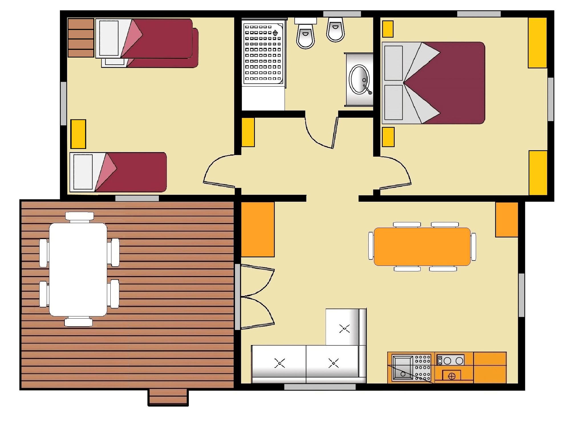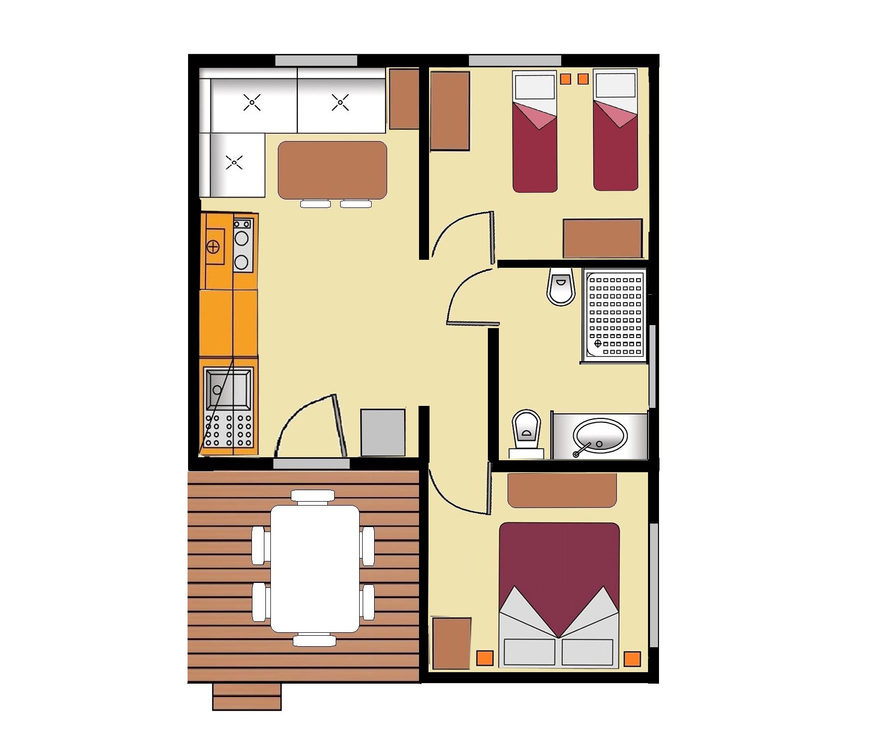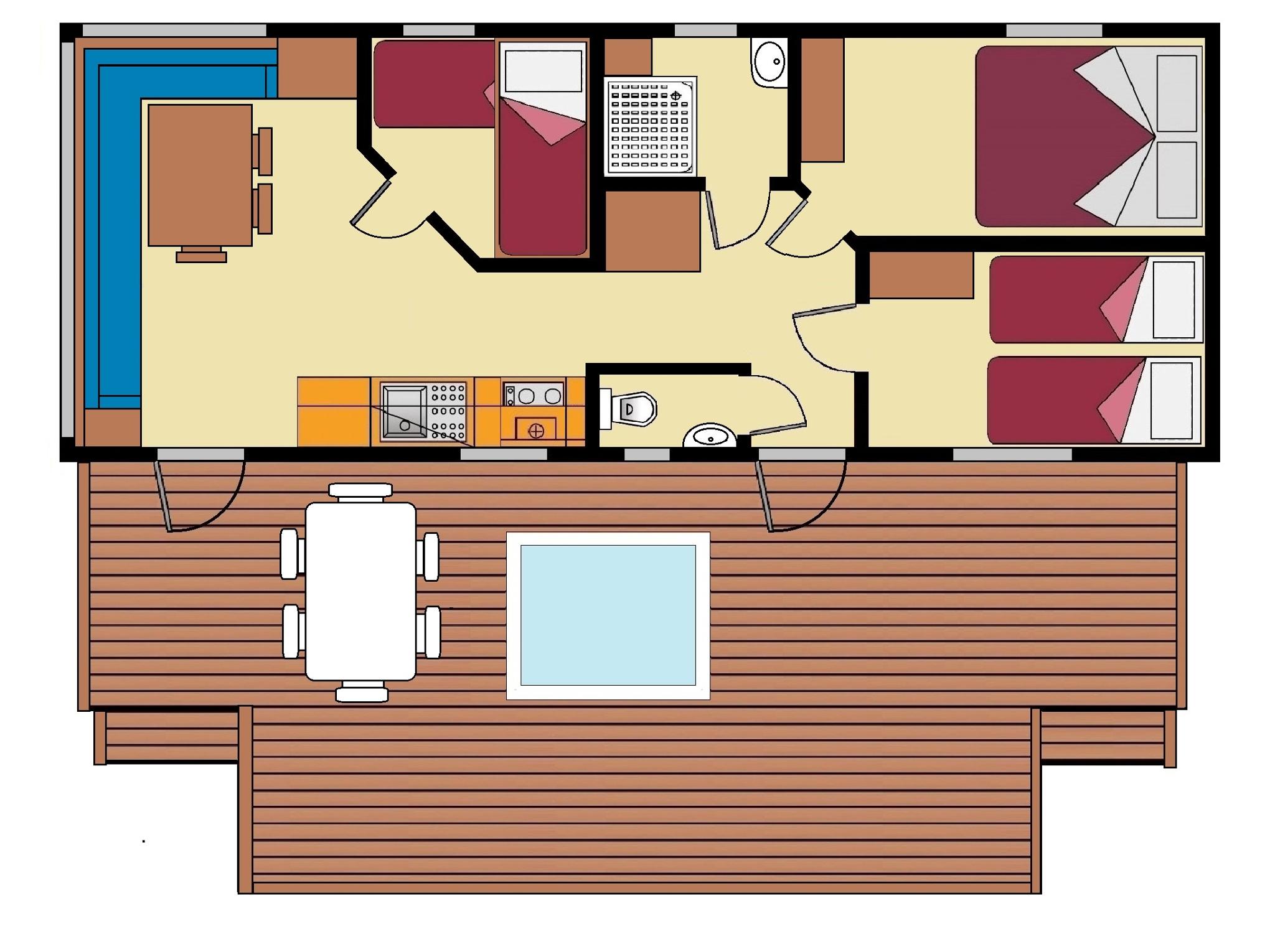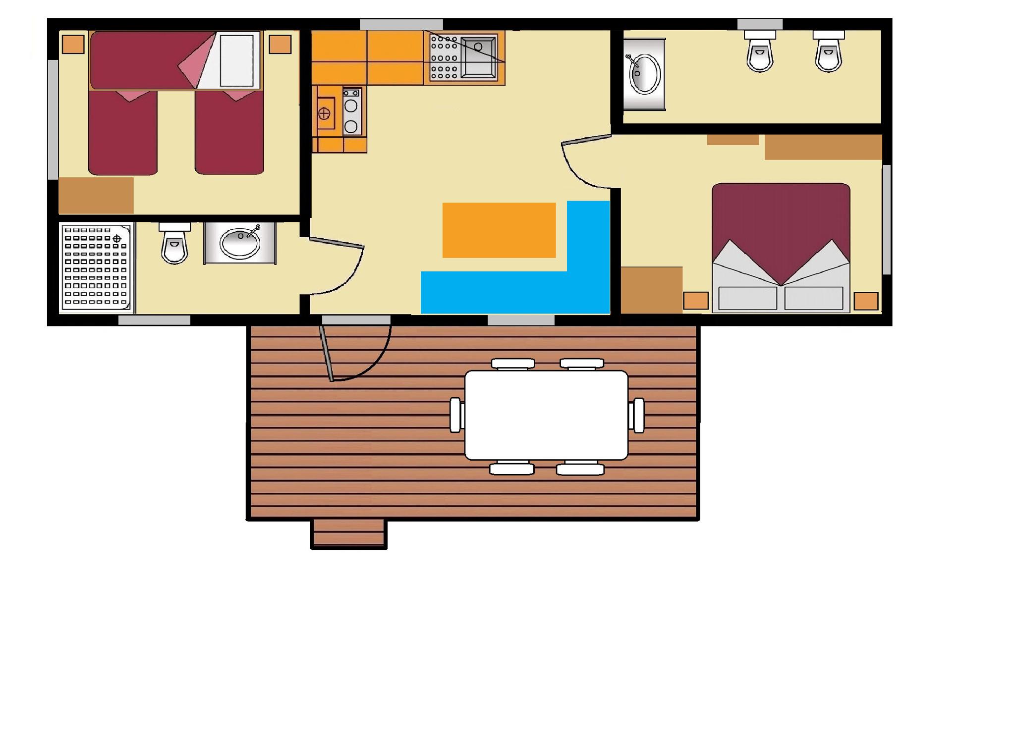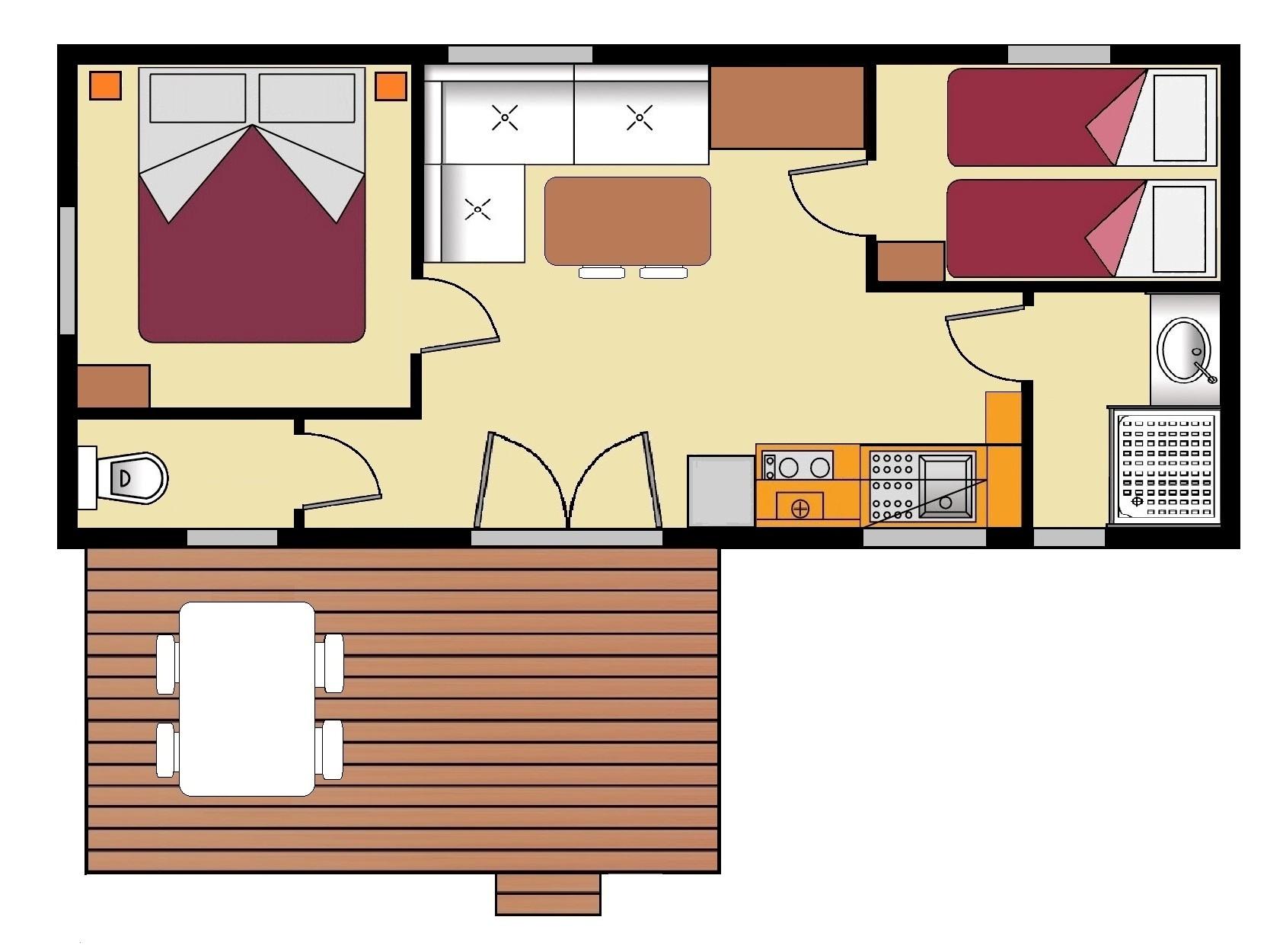 El alojamiento en casas móviles es la solución ideal para familias. Simples y funcionales, combinan calidad y comodidad.DESCRIPCIÓN: habitacion con cama francesa, habitacion con camas individuales, cocina con fregadero y frigorífico/congelator, TV y aire acondicionado/calefacción.