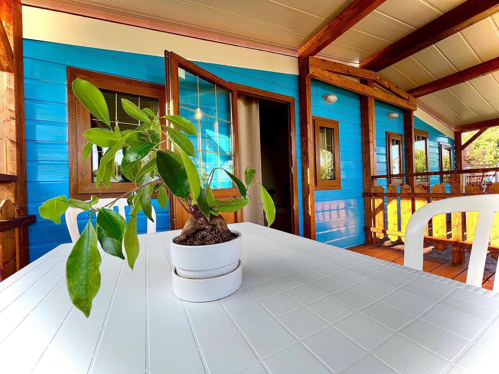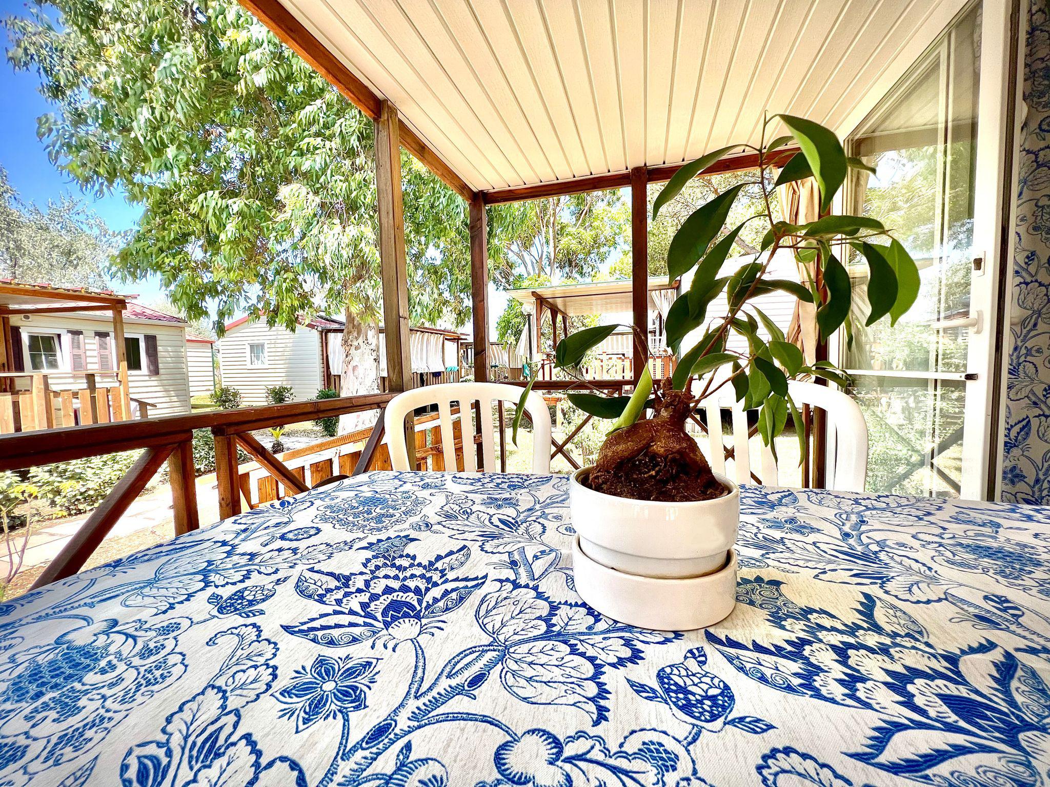 Casa móvil con habitacion doble cama francesa.Baño con caja ducha, lavabo, bidet e inodoro. Aire acondicionado, refrigerador y TV. Veranda con mesa y sillas. Sombrilla con 2 tumbonas en la playa