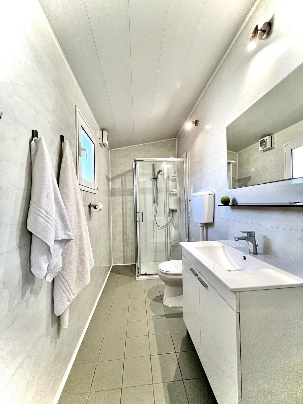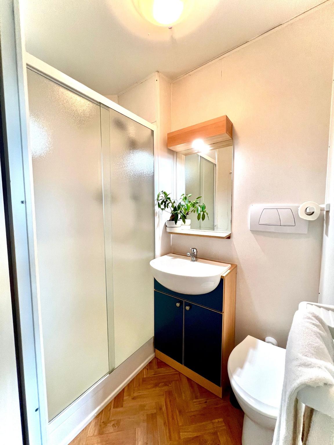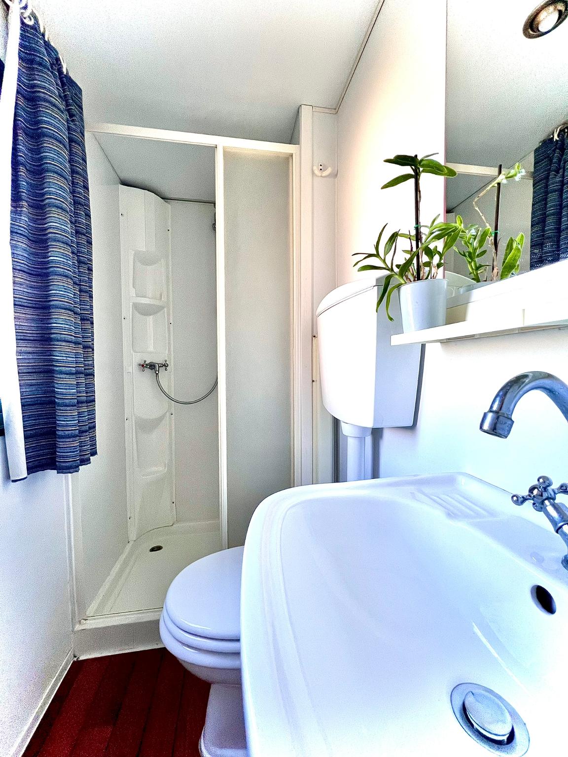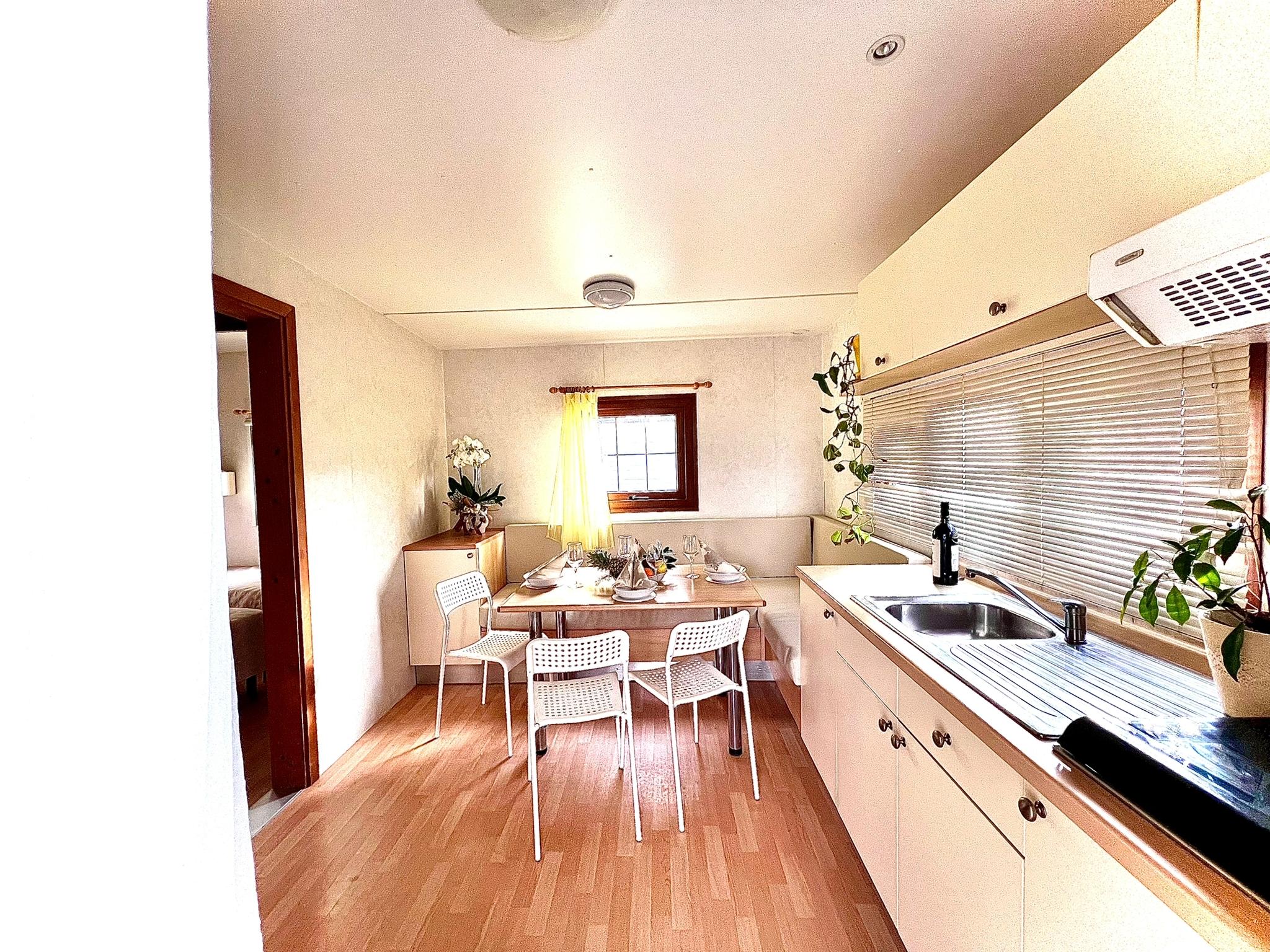 Alojamiento en casas móvile: habitacion doble ( cama francesa), dormitorio con camas individuales, cocina, fregadero y frigorífico/congelador, TV y aire acondicionado/calefacción. Cuarto de baño con ducha, lavabo, inodoro.