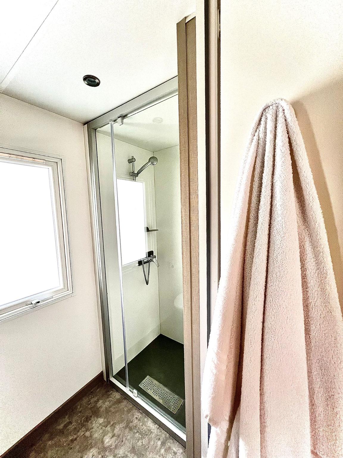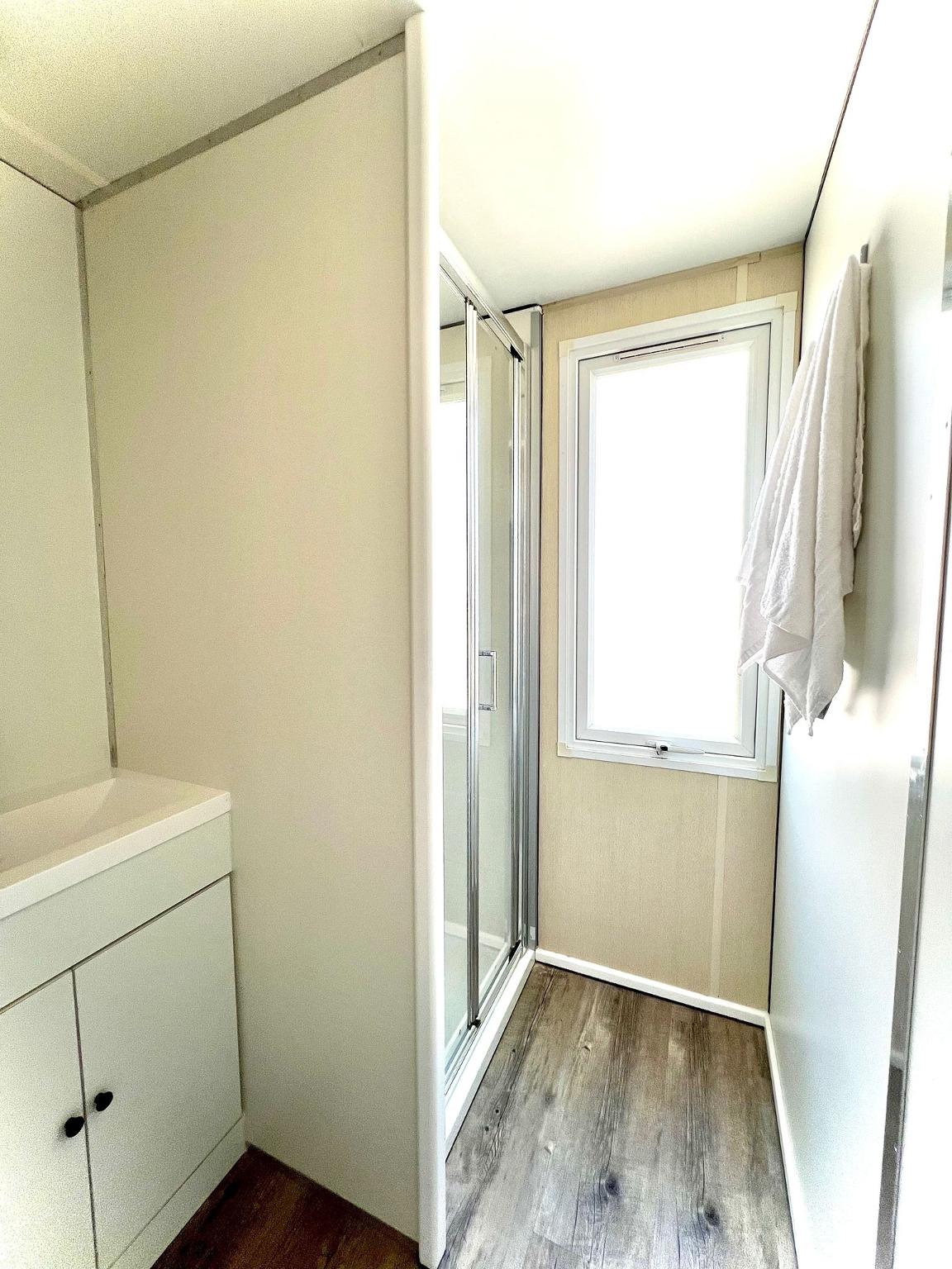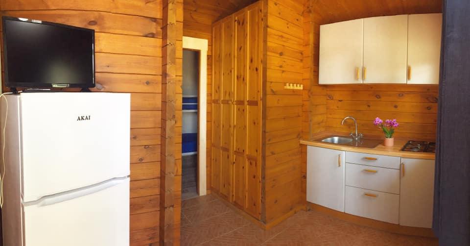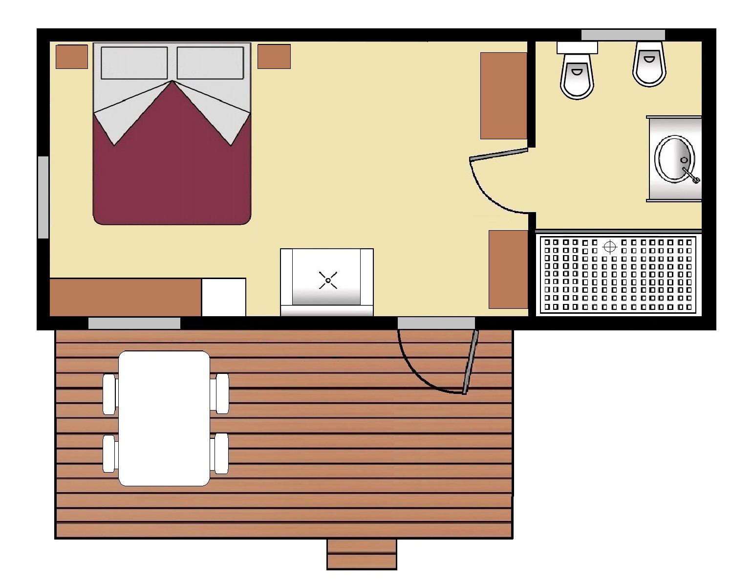 Alojamiento en casas móvile: habitacion doble ( cama francesa), dormitorio con camas individuales, cocina, fregadero y frigorífico/congelador, TV y aire acondicionado/calefacción. Cuarto de baño con ducha, lavabo, inodoro.