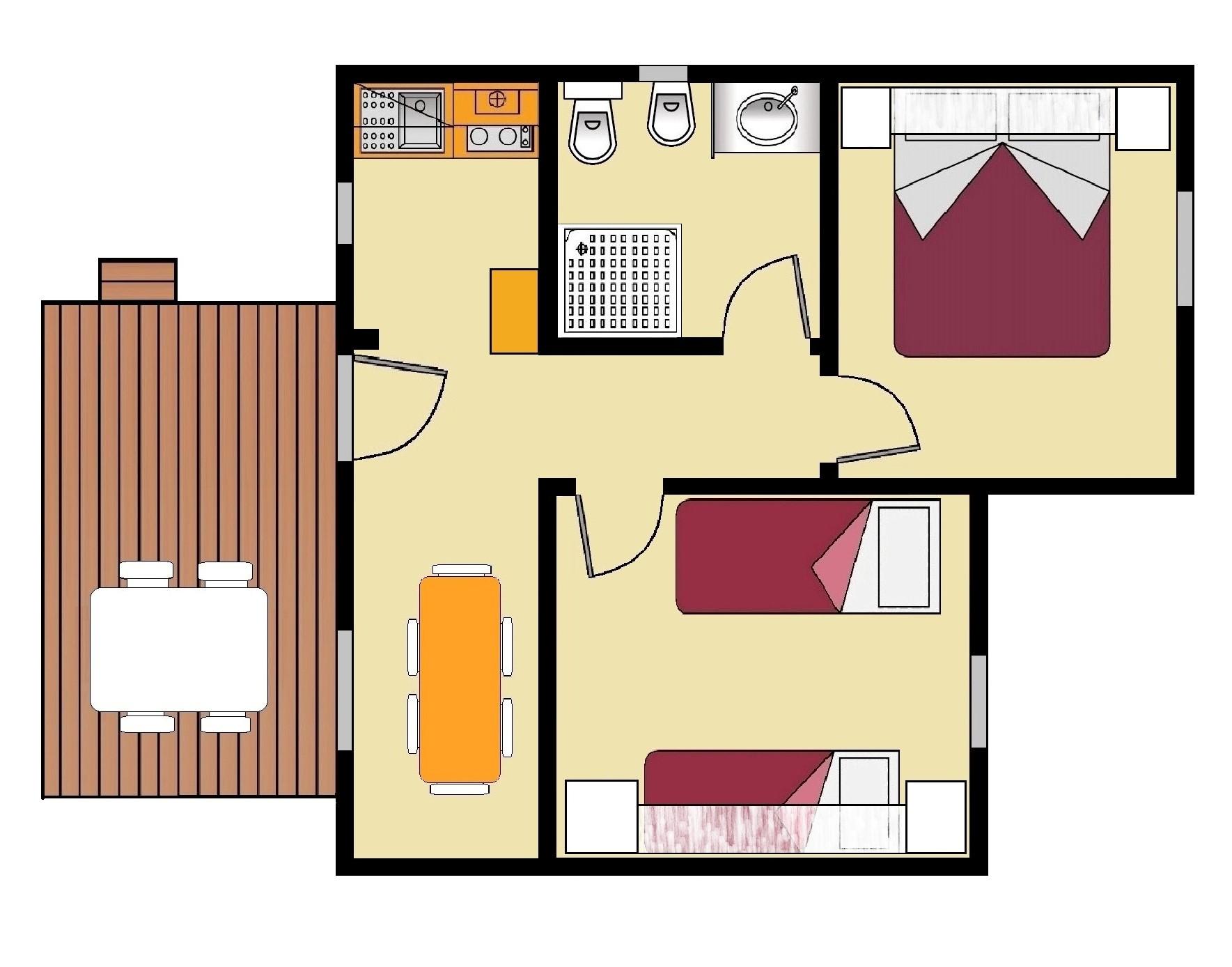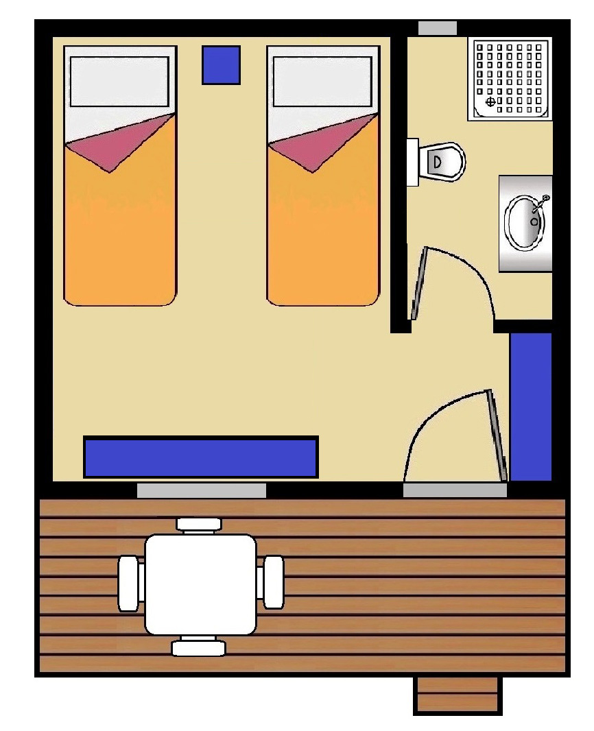 DESCRIPCIÓN: habitacion doble, habitacion con 2 camas individuales y una cama es alta para un niño hasta 7 años. Sala de estar con cocineta, fregadero, refrigerador/congelador, TV y aire acondicionado, calefacción