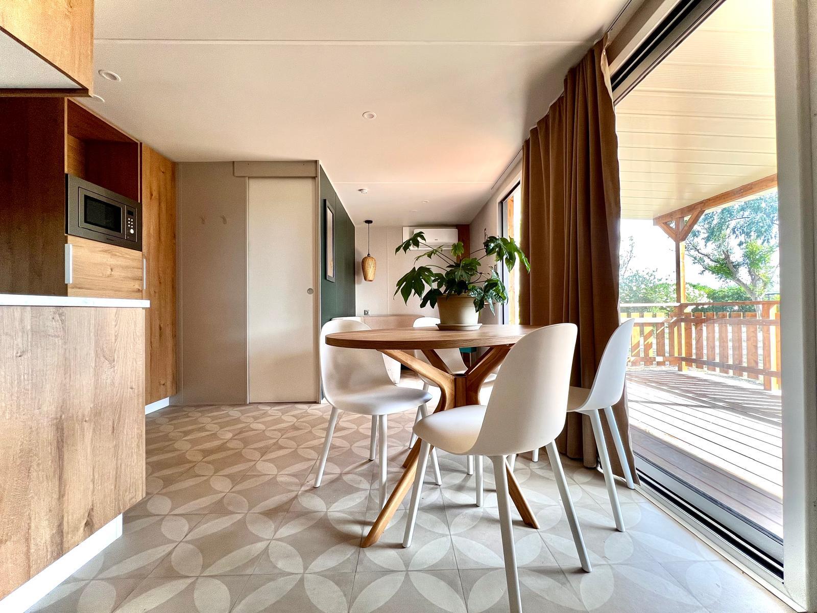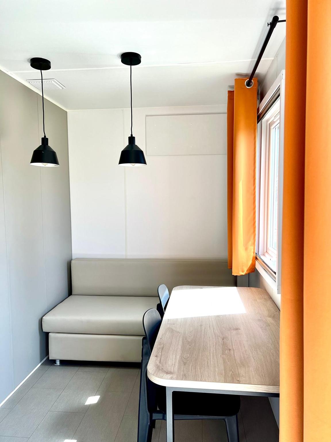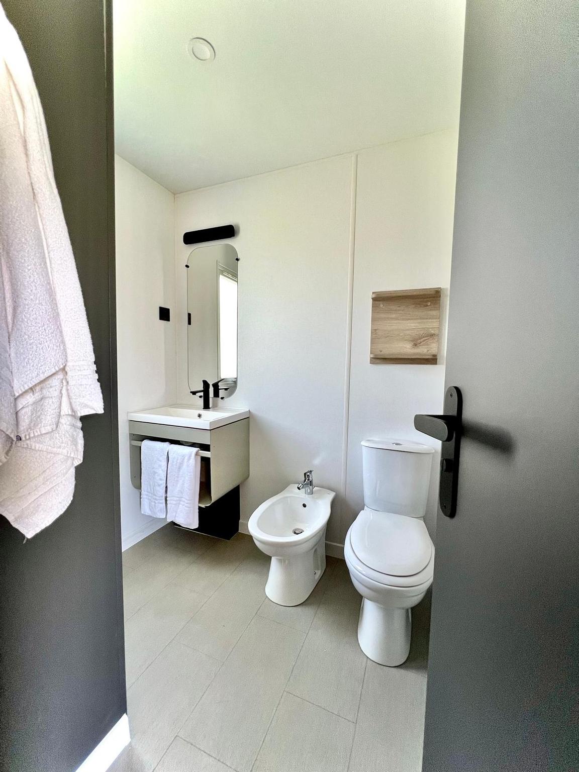 Alojamiento en casa móvil para el máximo confort. DESCRIPCIÓN: habitacion con cama francesa, habitacion con 2 camas individuales, baño con cabina de ducha y bidé. Amplia sala de estar con un diseño refinado que cuenta con un rincón de TV con sofá, comedor, cocina con microondas, nevera y congelador.