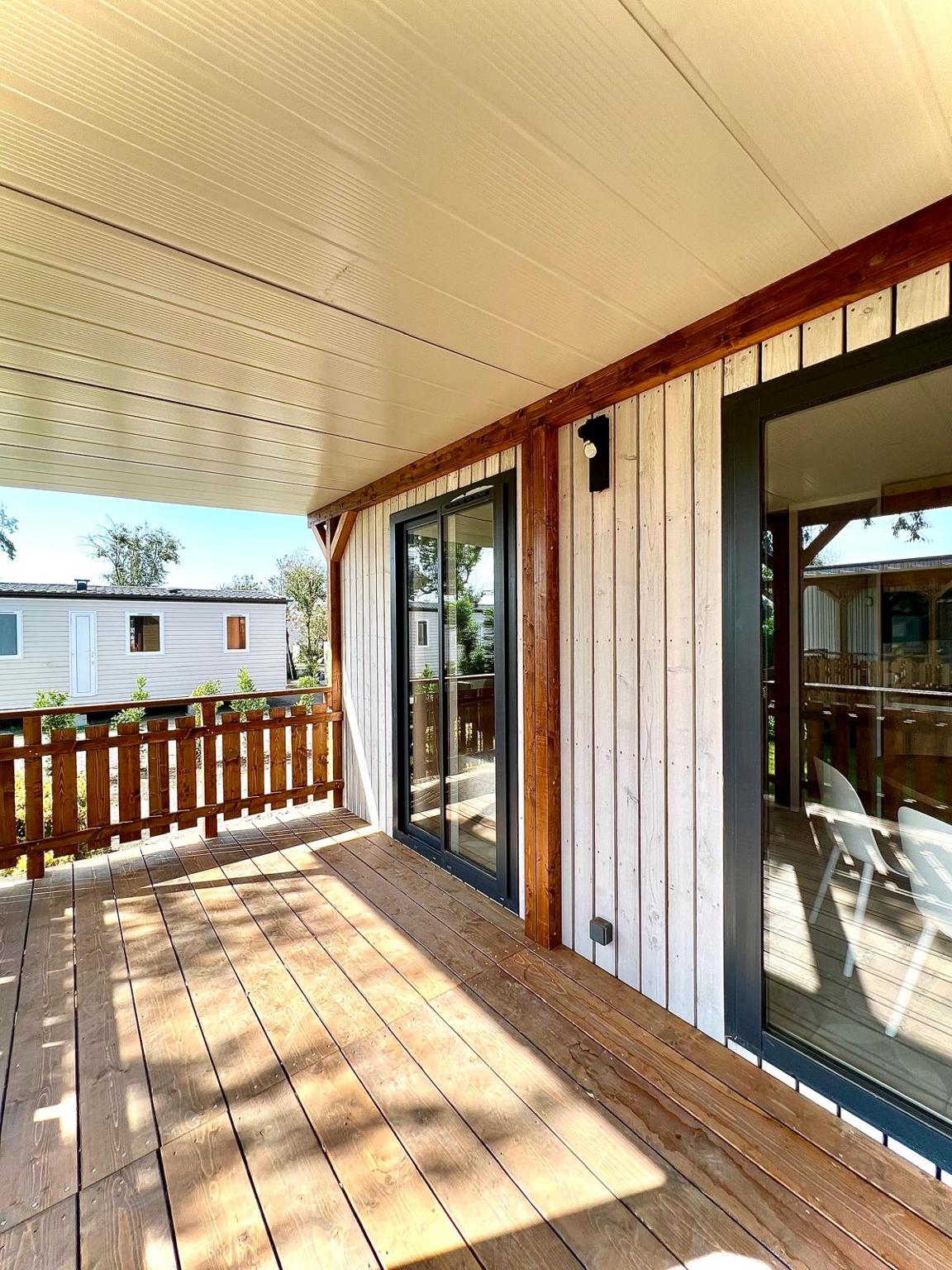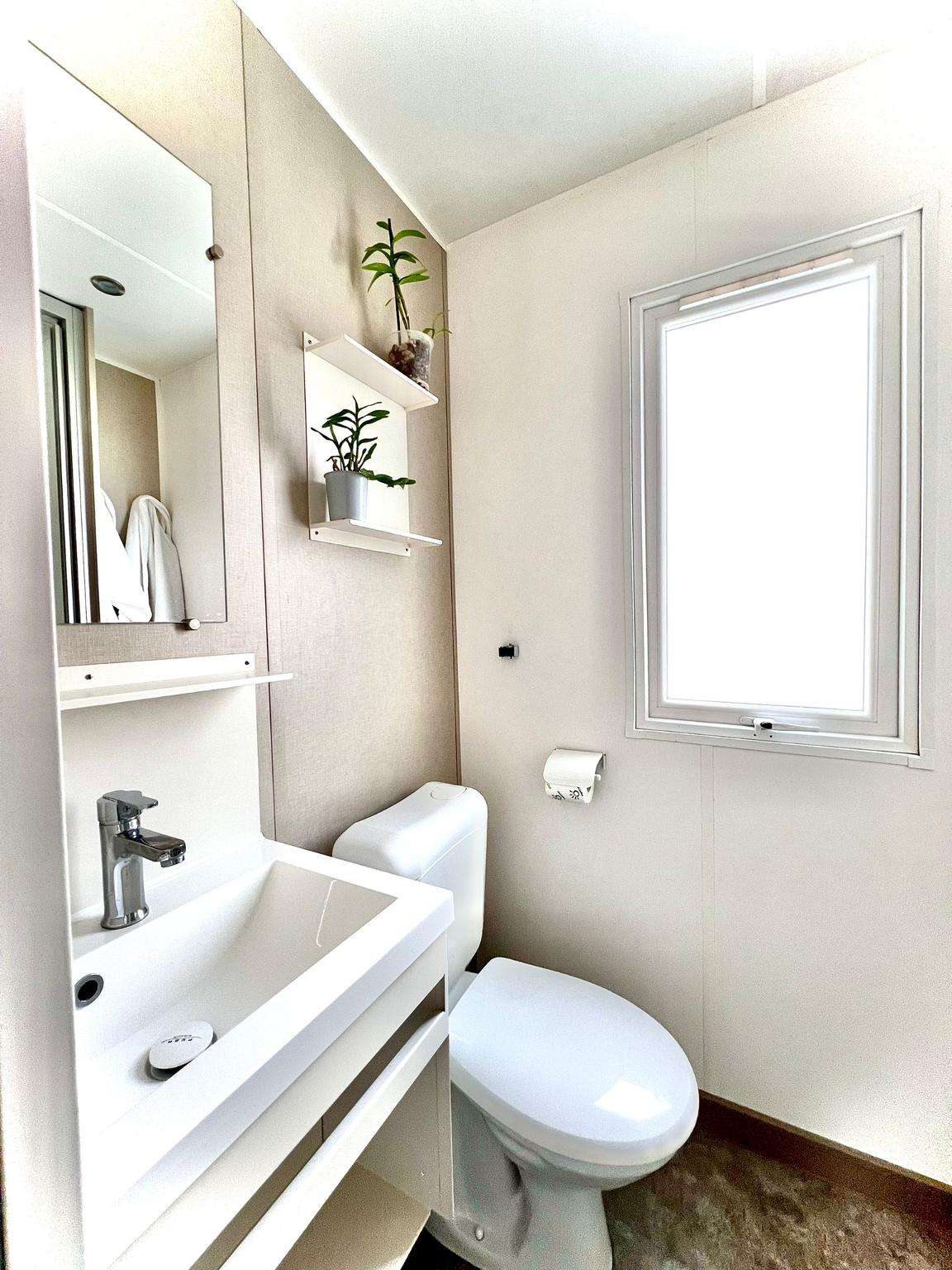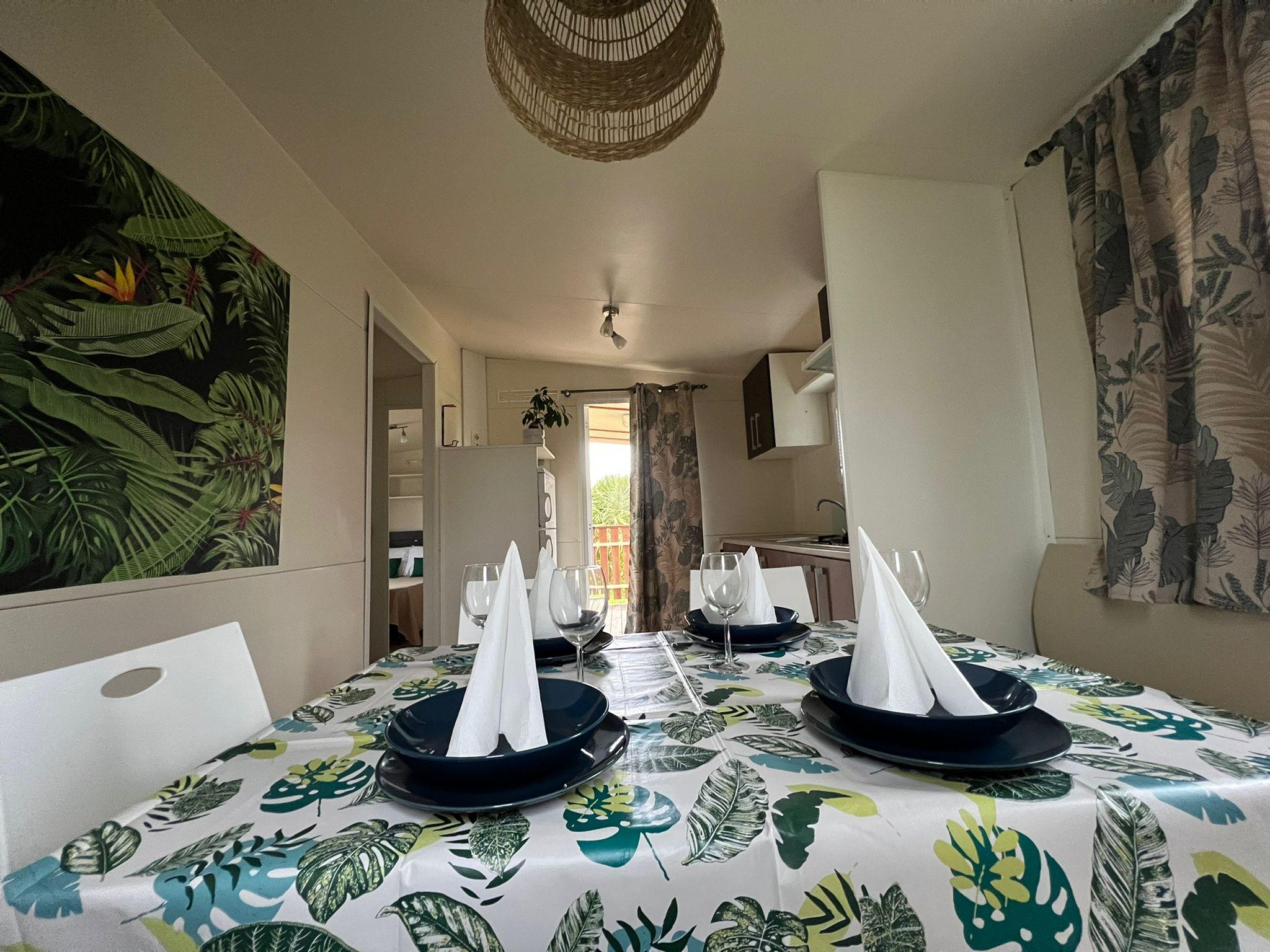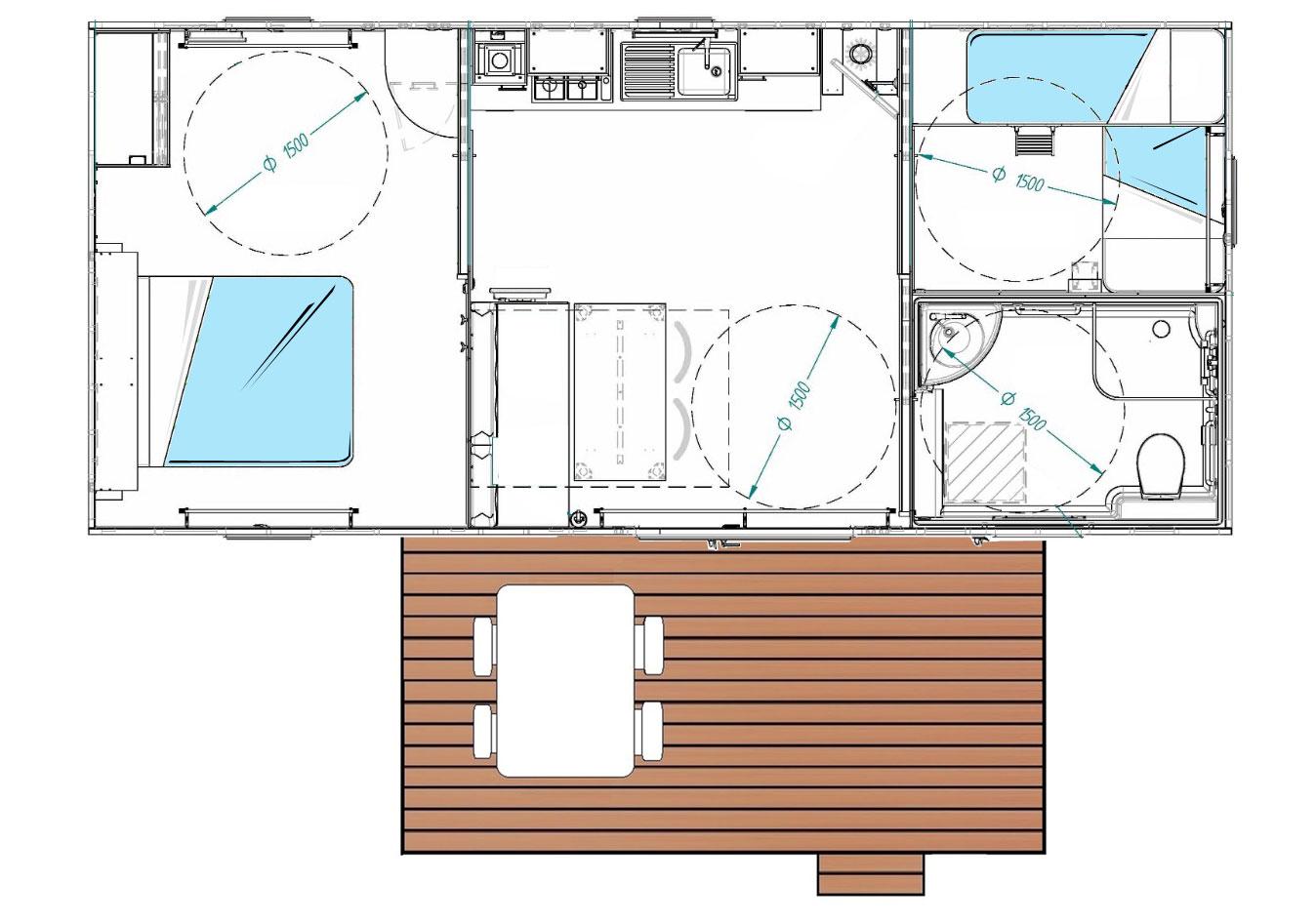 Alojamiento en casa móvil para el máximo confort. DESCRIPCIÓN: habitacion con cama francesa, habitacion con 2 camas individuales, baño con cabina de ducha y bidé. Amplia sala de estar con un diseño refinado que cuenta con un rincón de TV con sofá, comedor, cocina con microondas, nevera y congelador.