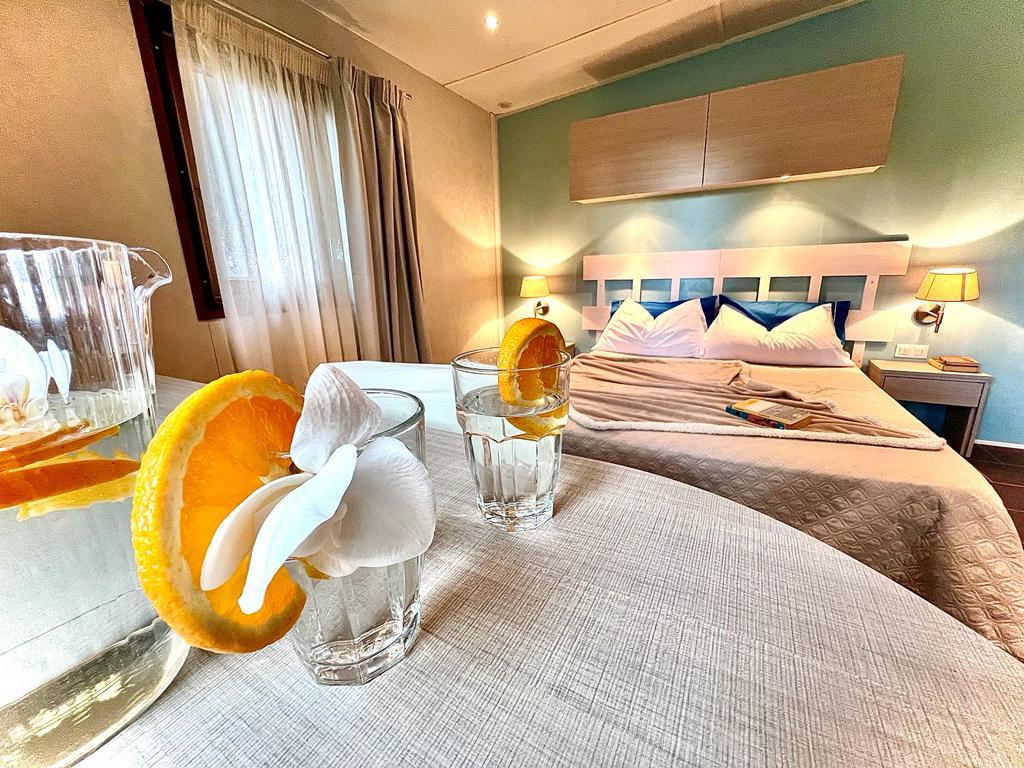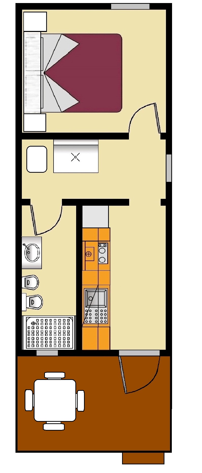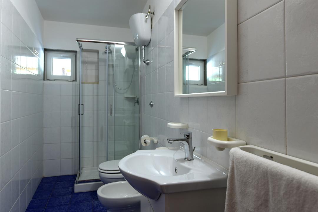 Habitación doble con baño grande con ducha y bidet. Una veranda, equipada con mesa y sillas, ofrece un agradable rincón de relajación. Servicios: aire acondicionado frio / calor, TV, frigorífico.