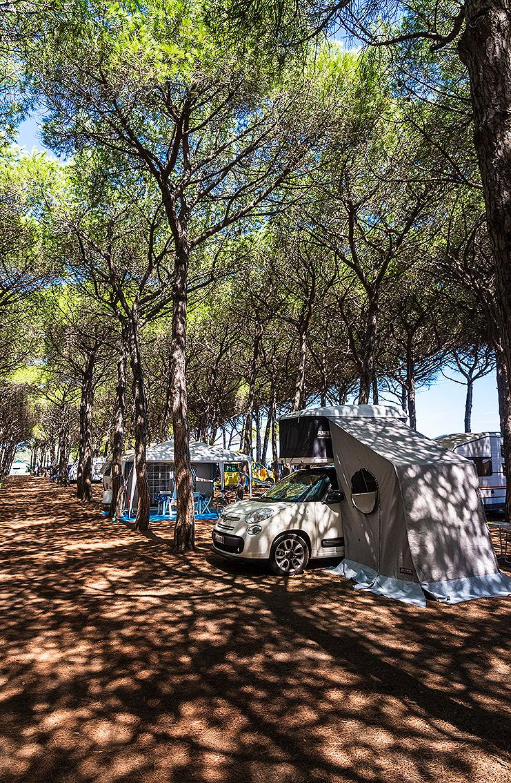 Amplias y sombreadas, cubiertas de pinos marítimos y ocupan una superficie de 90 metros cuadrados. El suministro de energía está previsto para 3 Ampère, con tomas eléctricas situadas a una distancia máxima de 20 metros.También está previsto para el aparcamiento de un coche.El número lo asigna la oficina de reservas.