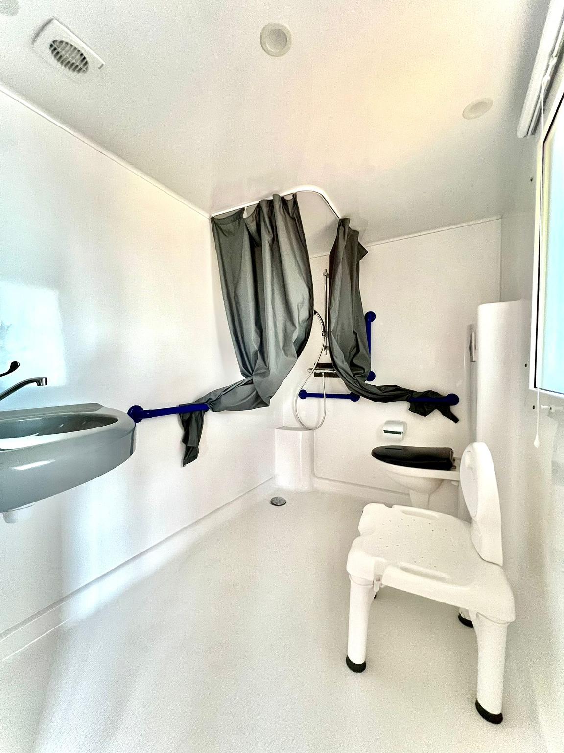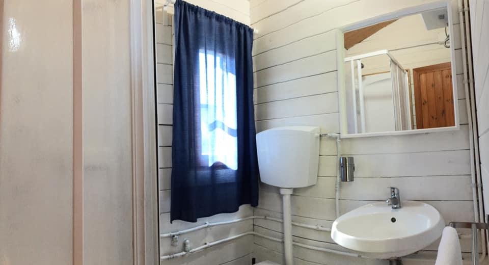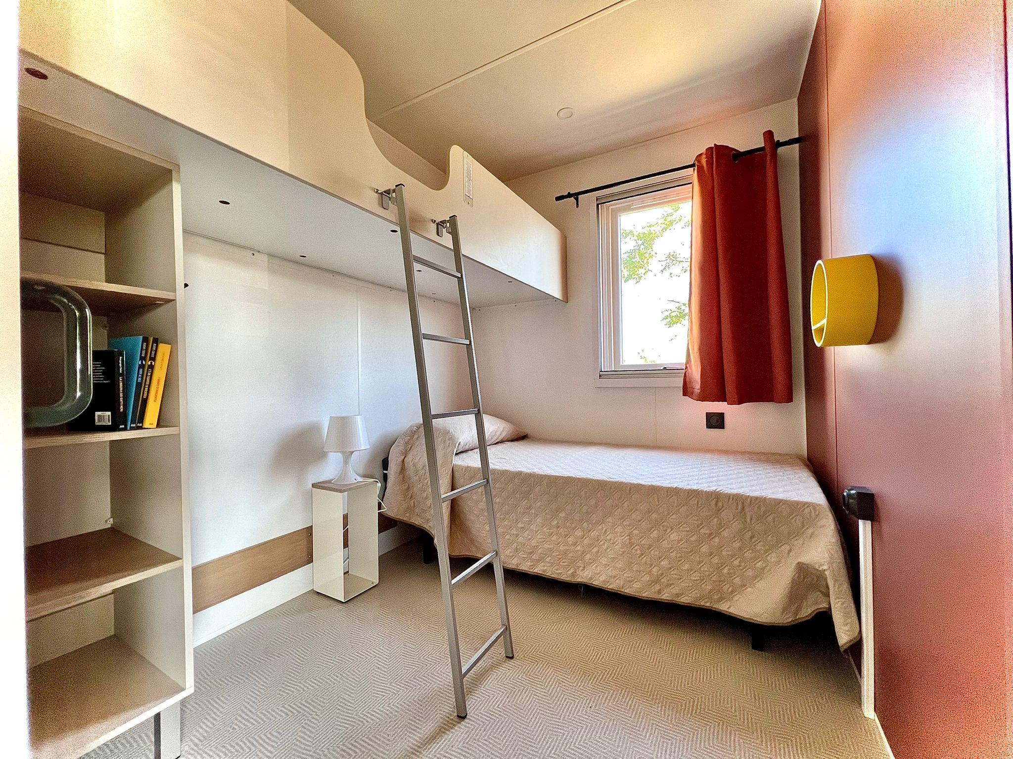 DESCRIPCIÓN: habitación doble, habitación con cama en entrepiso: una cama individual baja y una cama alta accesible con escalera (para niños hasta 7 años), baño con ducha con 2 barras de apoyo y asiento regulable en altura, WC suspendido a 490 mm del suelo y 2 barras de apoyo. Cocina con nevera/congelador, TV y aire acondicionado/calefacción.