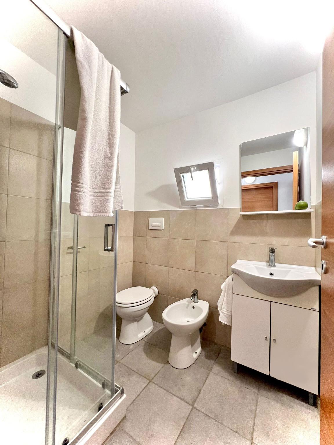 Cuarto de baño con ducha, lavabo, inodoro y bidet.