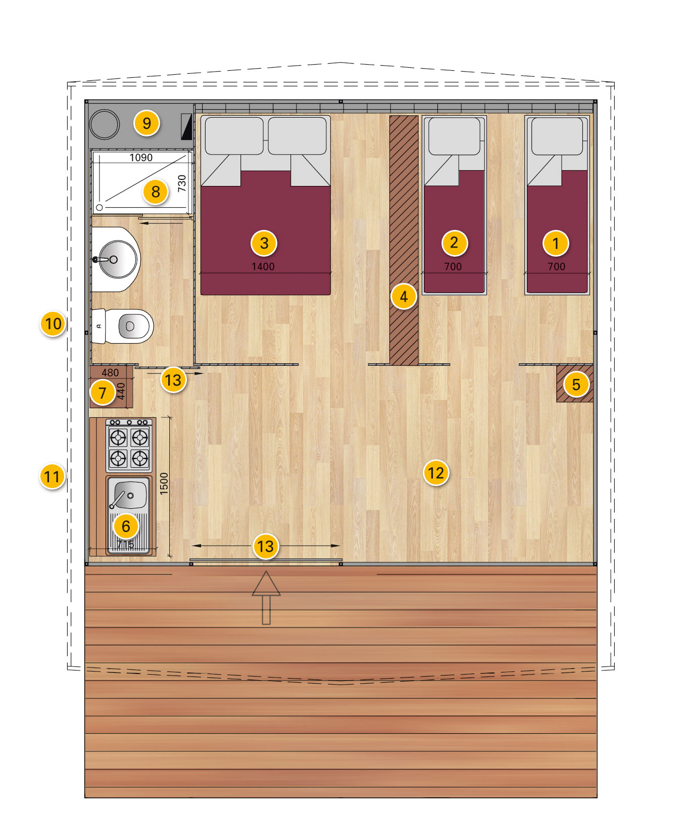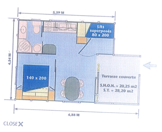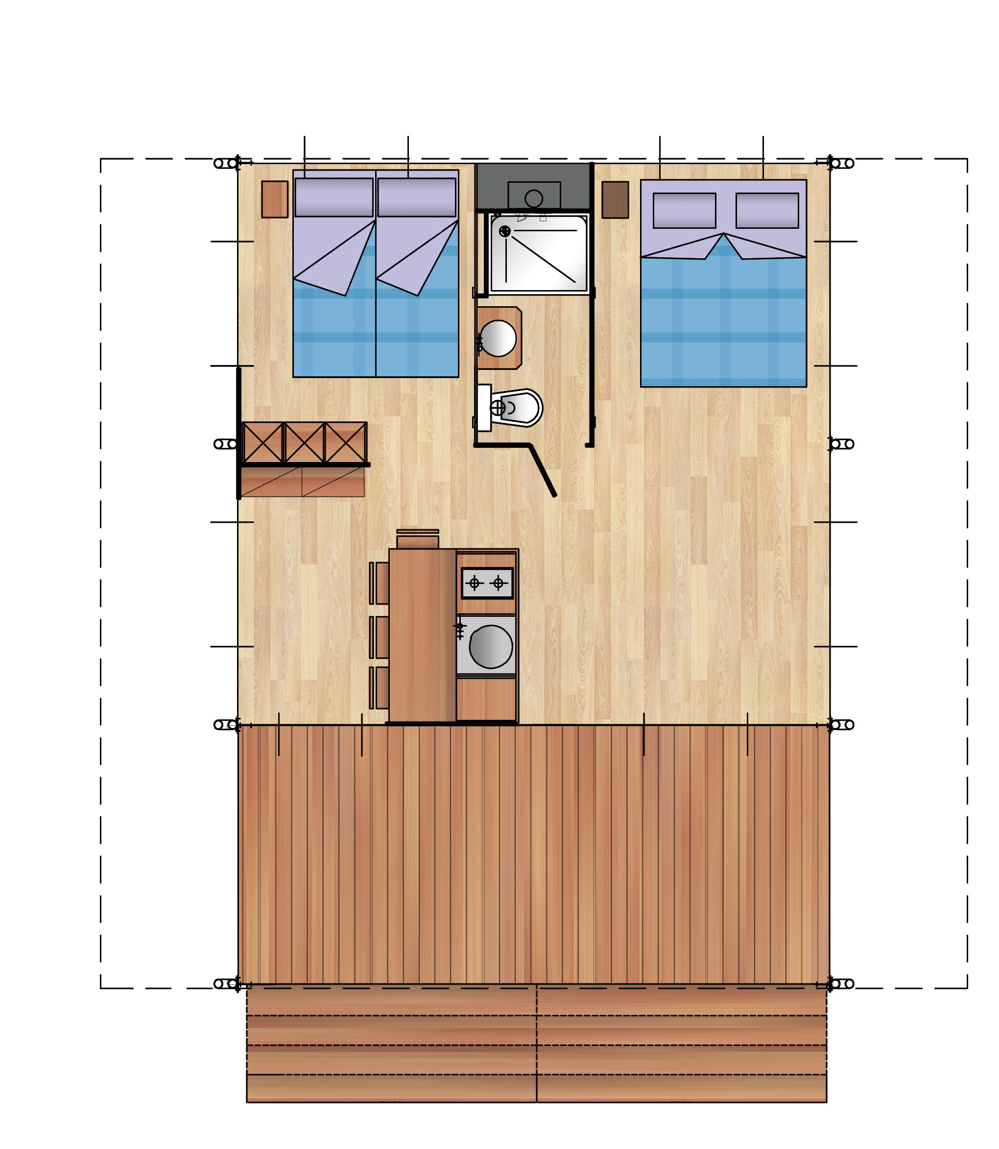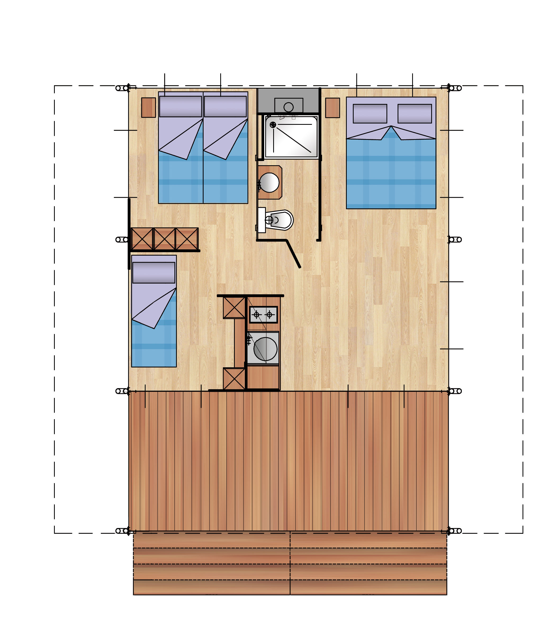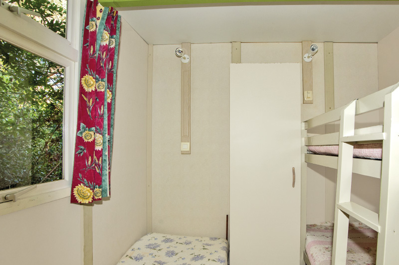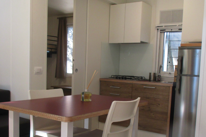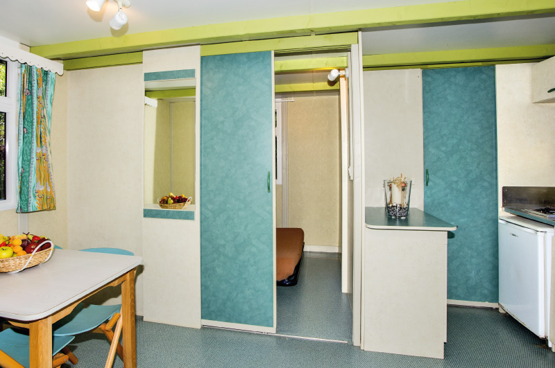 Salle de séjour avec kitchenette équipée, 1 chambre double, 1 chambre enfants avec lits superposés, salle de bains avec WC, lavabo et douche, terrasse couverte équipée.