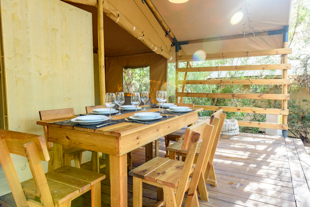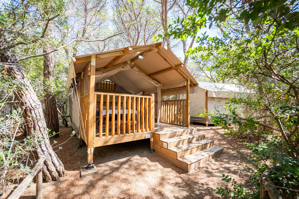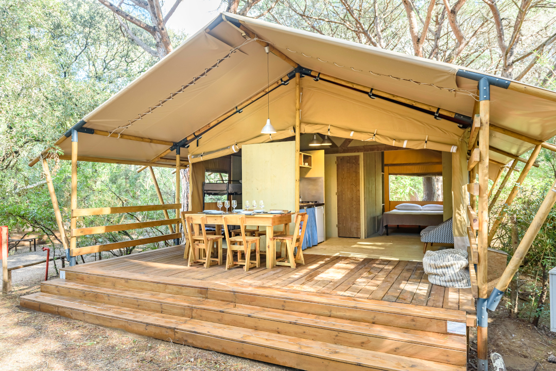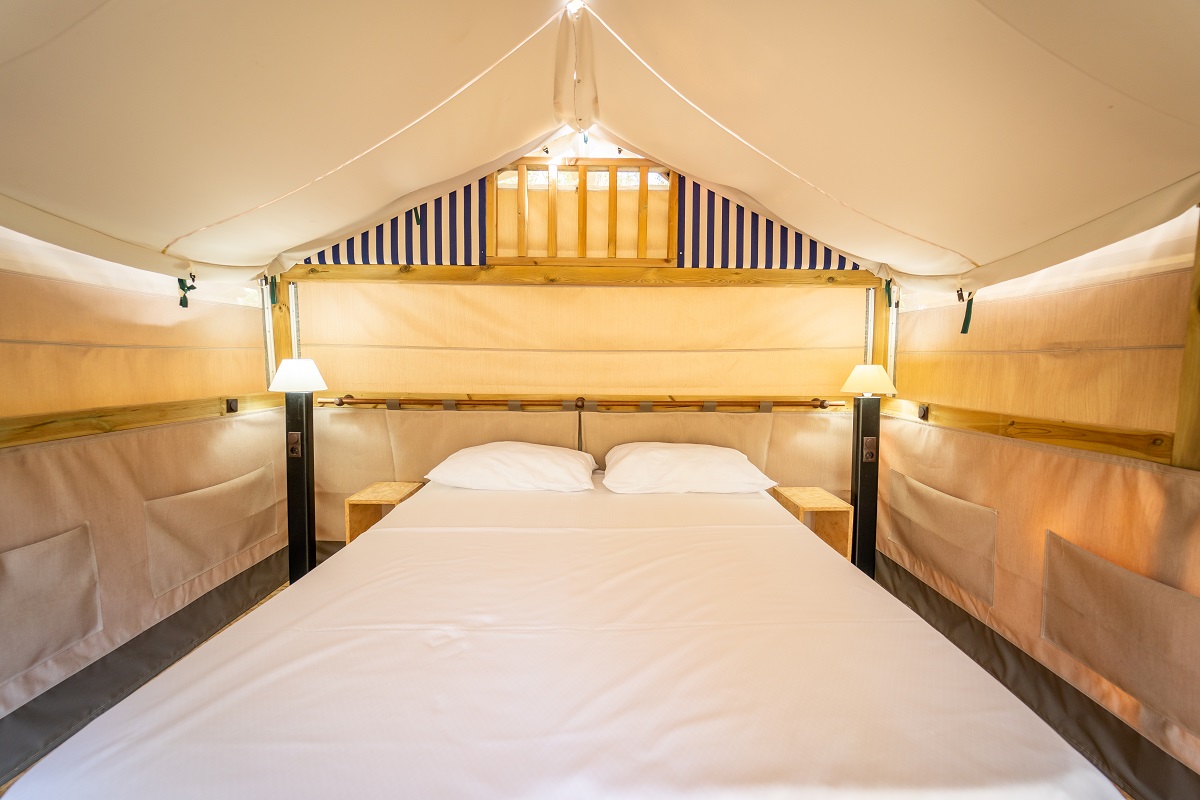 La tente a un seul étage, lit double, véranda, pratique mini-frigo et lumière de courtoisie.