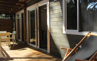 La grande terrasse extérieure où vous pourrez vous détendre, devient une seule pièce avec le salon lorsque les rideaux antérieurs sont ouverts.