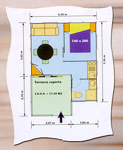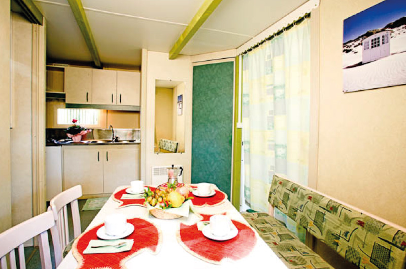 Salle de séjour, kitchenette équipée, 1 chambre double, 1 chambre avec lits superposés + 1 lit individuel, salle de bains avec WC, lavabo et douche, climatisation, terrasse couverte équipée.