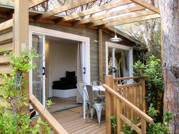 salle de séjour avec canapé-lit et kitchenette équipée, 1 chambre double, salle de bains avec WC, lavabo et douche, terrasse couverte équipée.