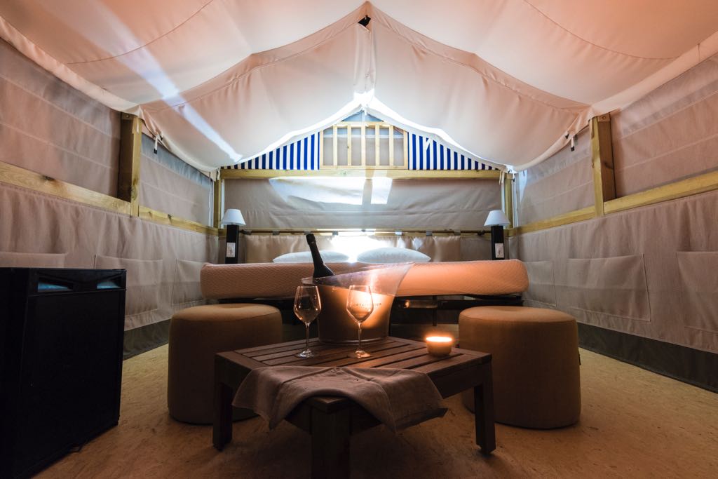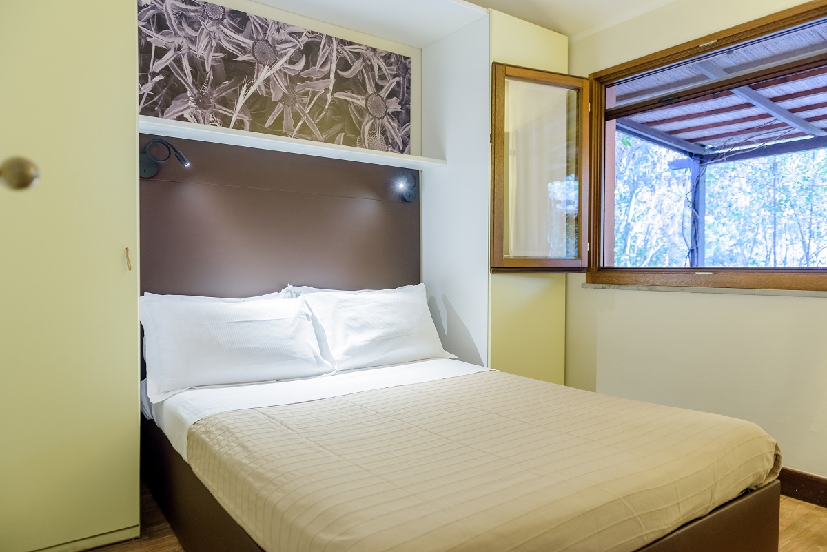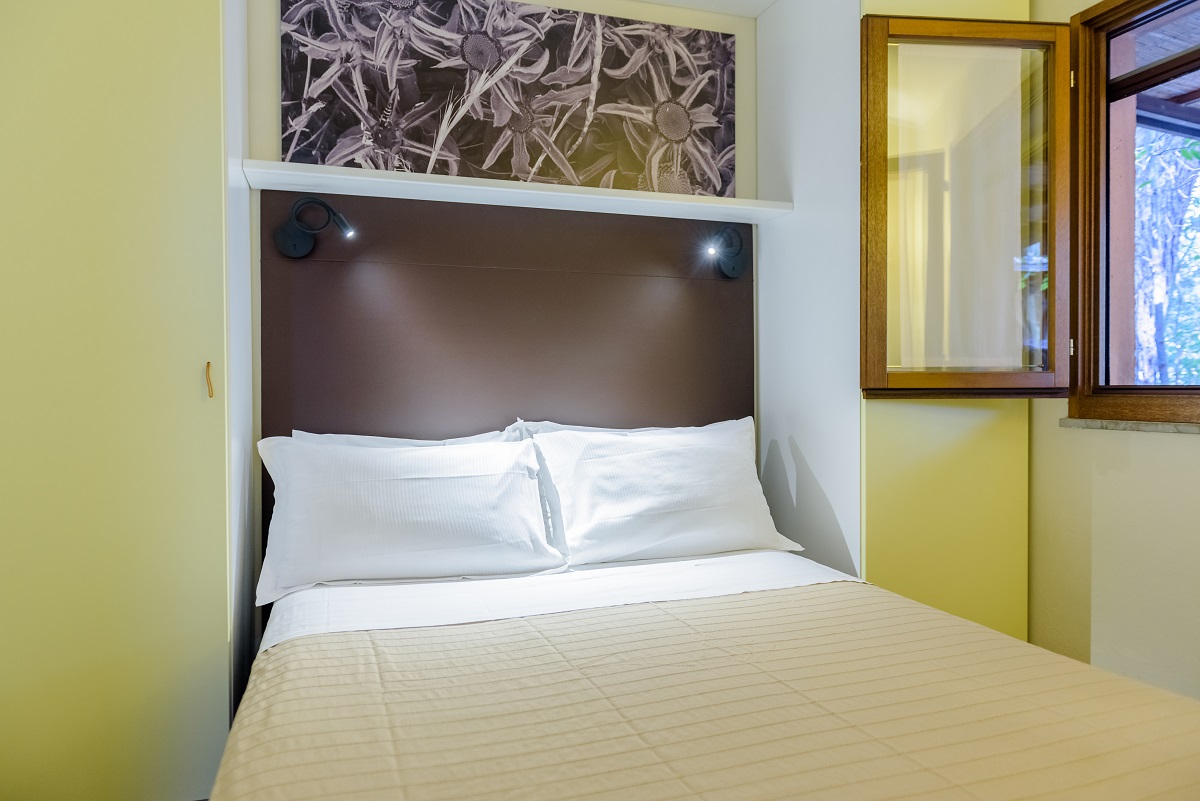 La Mini Lodge est une tente exclusivement composé d’une moderne et fonctionnelle chambre double, équipées de mini- réfrigérateur, de la quelle on peut jouir d’une belle vue du ciel, grâce aux deux fenêtres qui s’ouvrent sur le toit et qui donnent luminosité. Les couleurs douces et délicates l’introduisent parfaitement dans n’importe quel environnement naturel, pour une expérience qui unit la commodité et la liberté d’un séjour au camping, en contact étroit avec la nature. Occupation max. 2 Personnes. Mètre carré: Mini Lodge Tent Dimensions : env. 14 m² – 450×330.