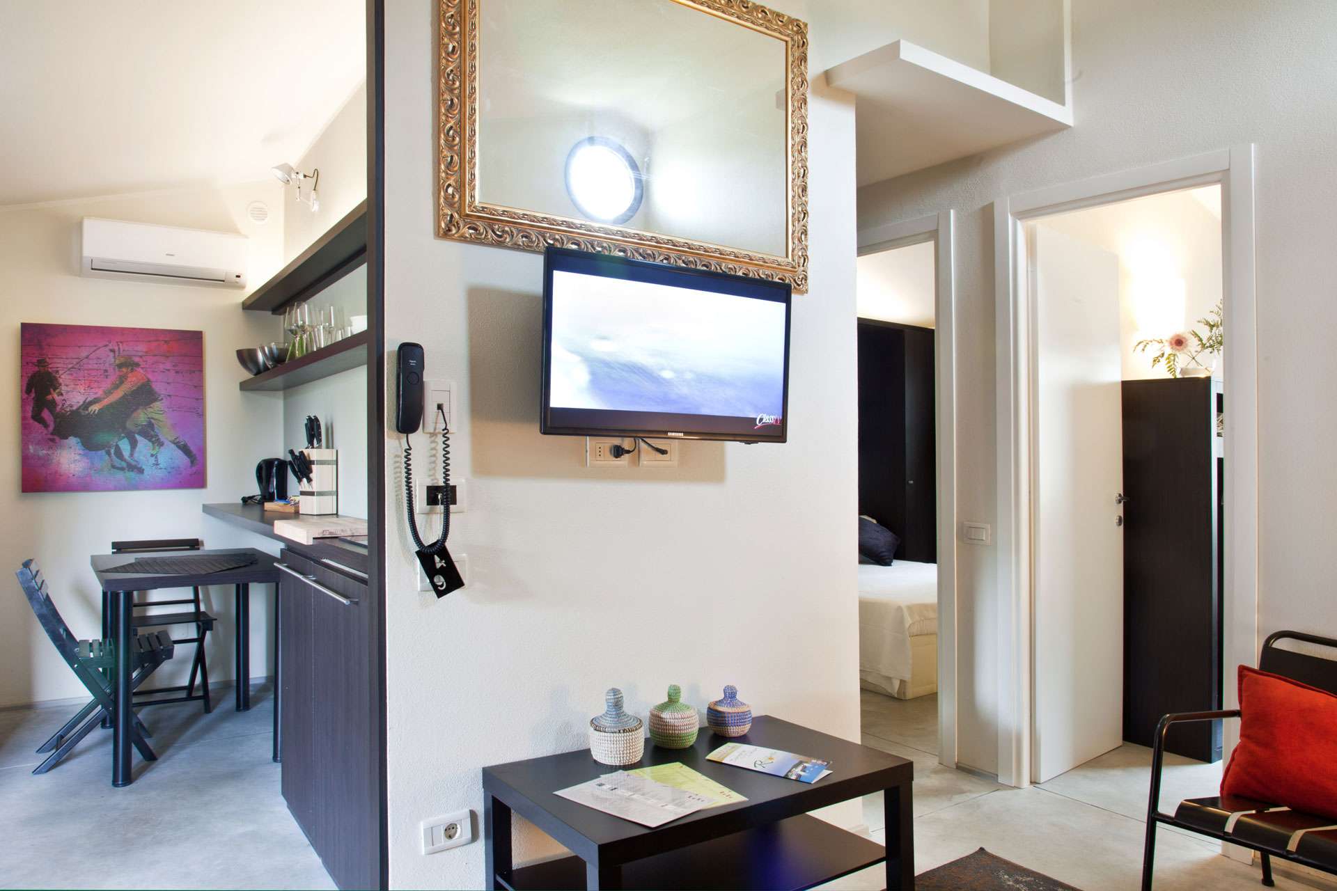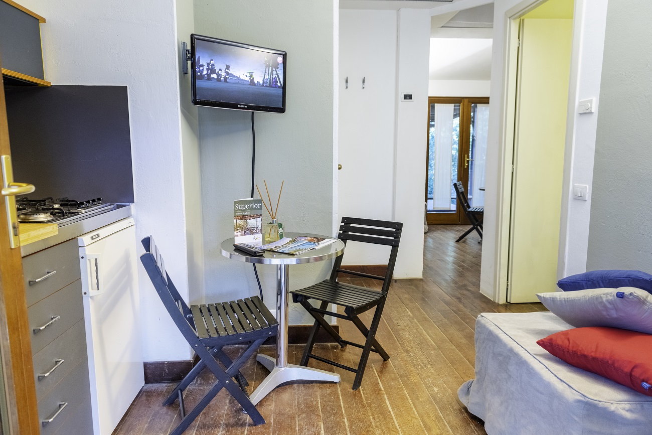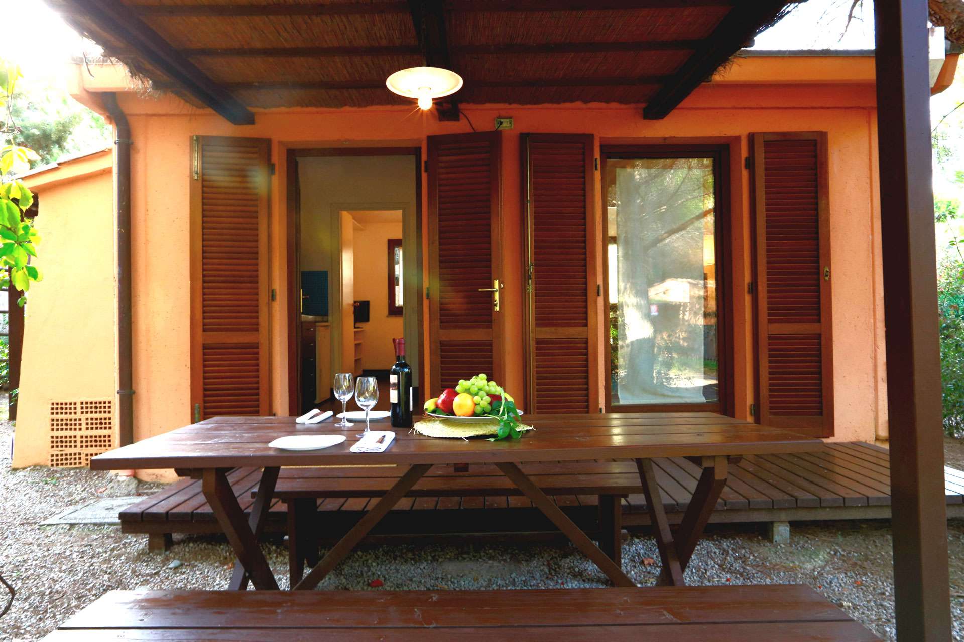 Séjour avec canapé-lit double, kitchenette équipée avec réfrigérateur et vaisselle , chambre double, salle de bains avec WC, bidet, lavabo, douche, tv, climatisation (chaud/ froid) , véranda équipée avec des bancs en bois et une table. Wi-Fi gratuit.