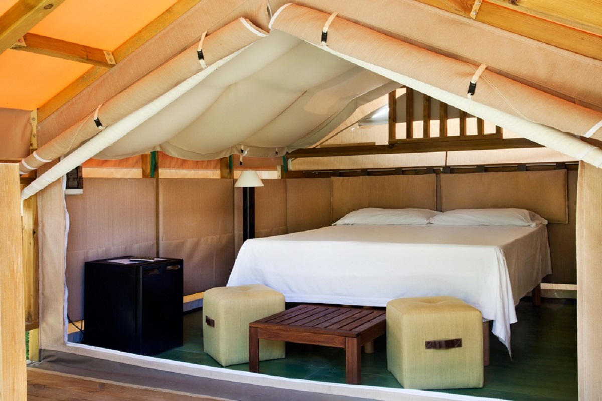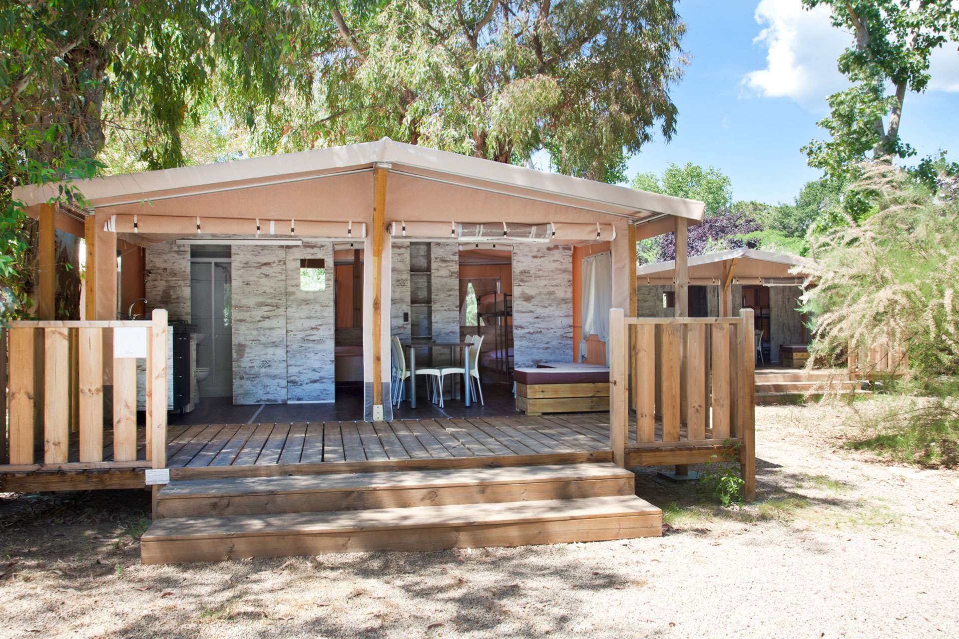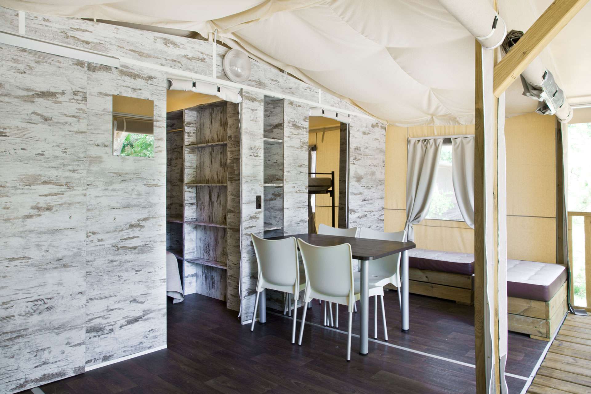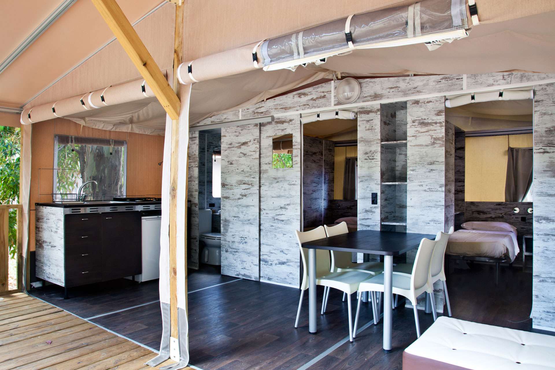 Les Lodge Tentes sont équipées de tous les conforts. Elles ont une chambre avec un confortable lit double, une deuxième chambre avec un lit simple et un lit superposé, un grand séjour avec coin cuisine et salle de bains avec douche et lavabo. La grande terrasse extérieure où vous pourrez vous détendre, devient une seule pièce avec le salon lorsque les rideaux antérieurs sont ouverts. Les murs en bois internes, aux couleurs naturelles, se marient bien avec le milieu environnant, entouré par la nature. Occupation max. 5 . carré: Intérieur – env. 25 m²; Véranda – env. 10 m² . Occupation maximale: 5 Personnes.