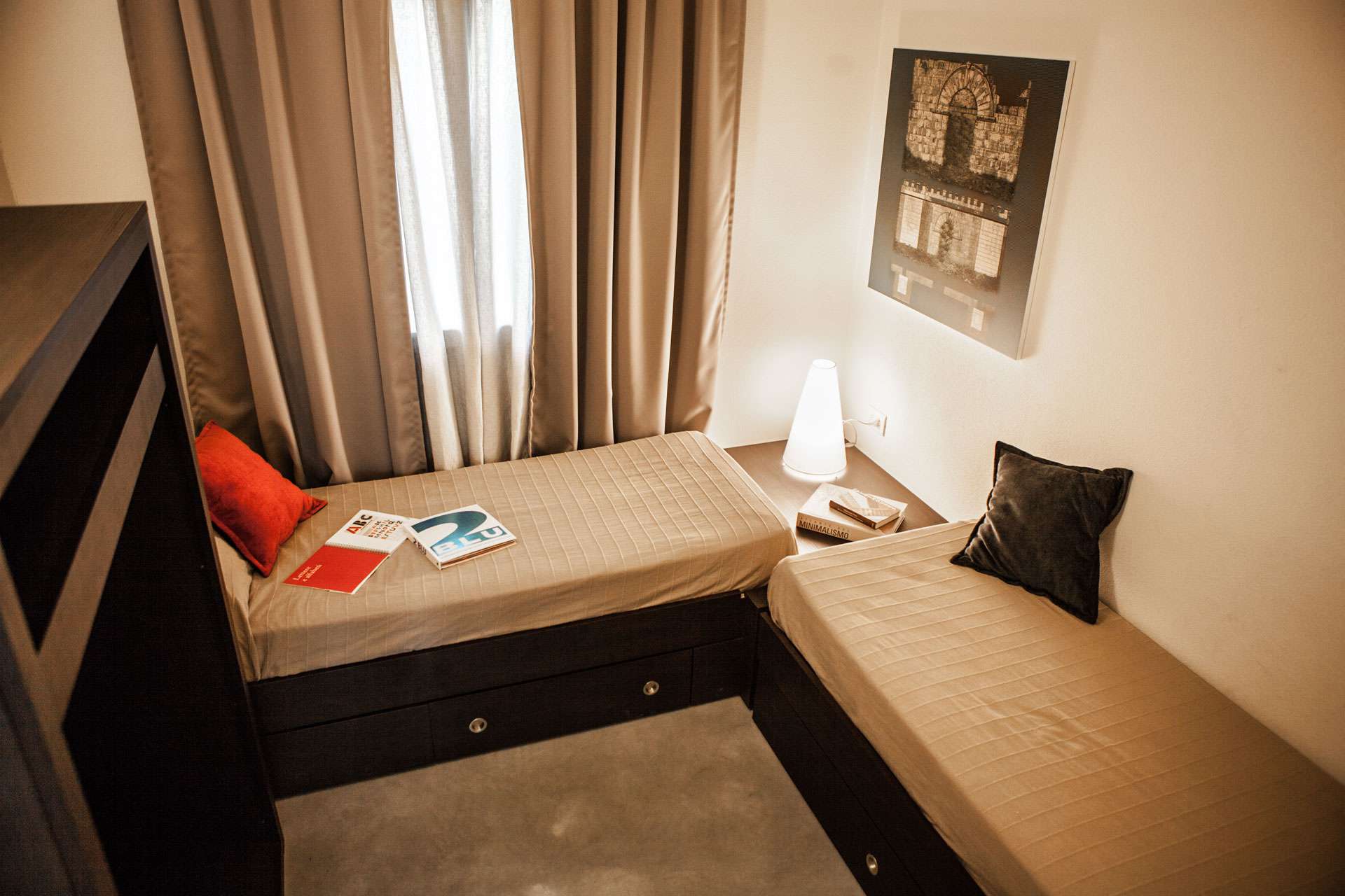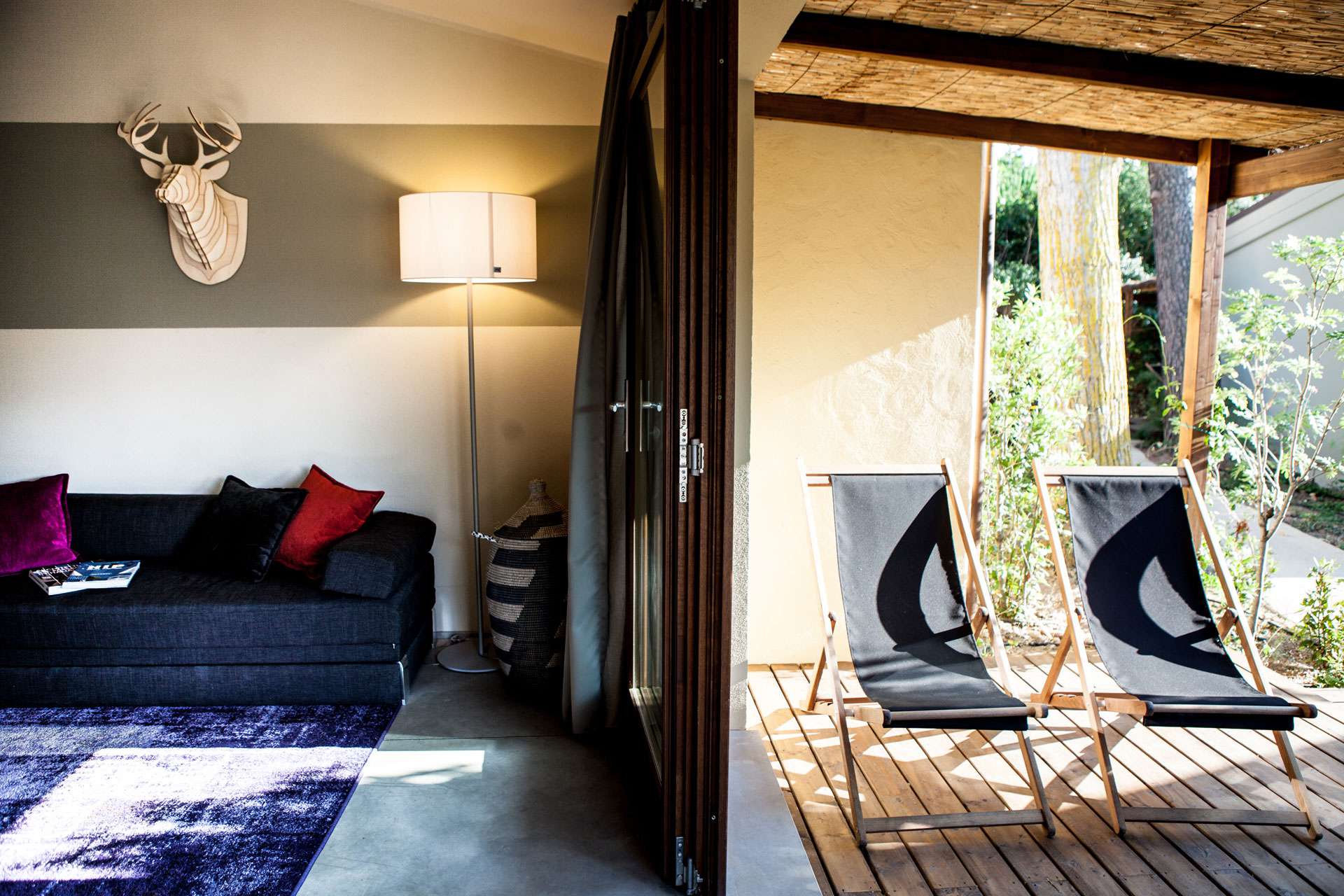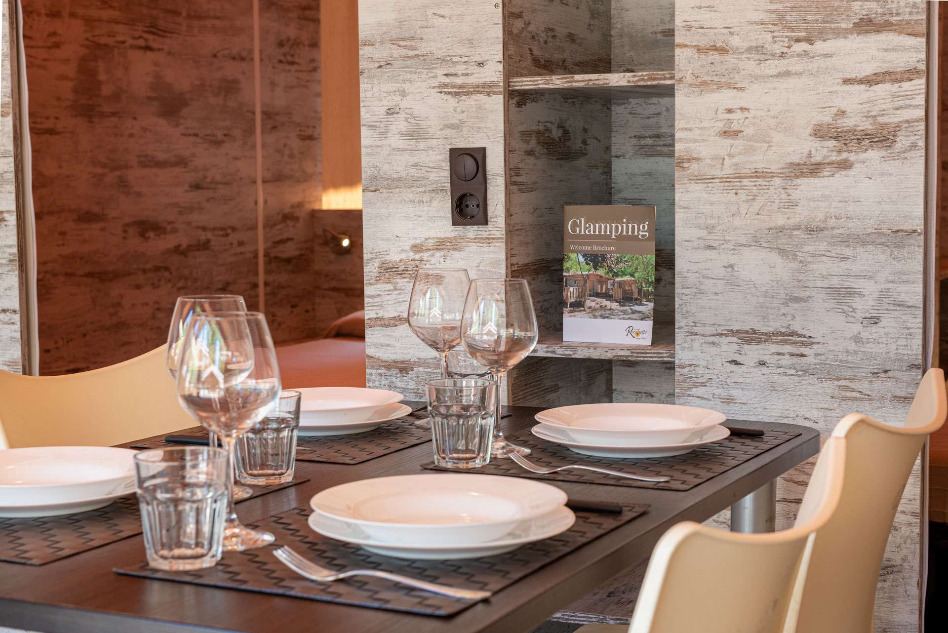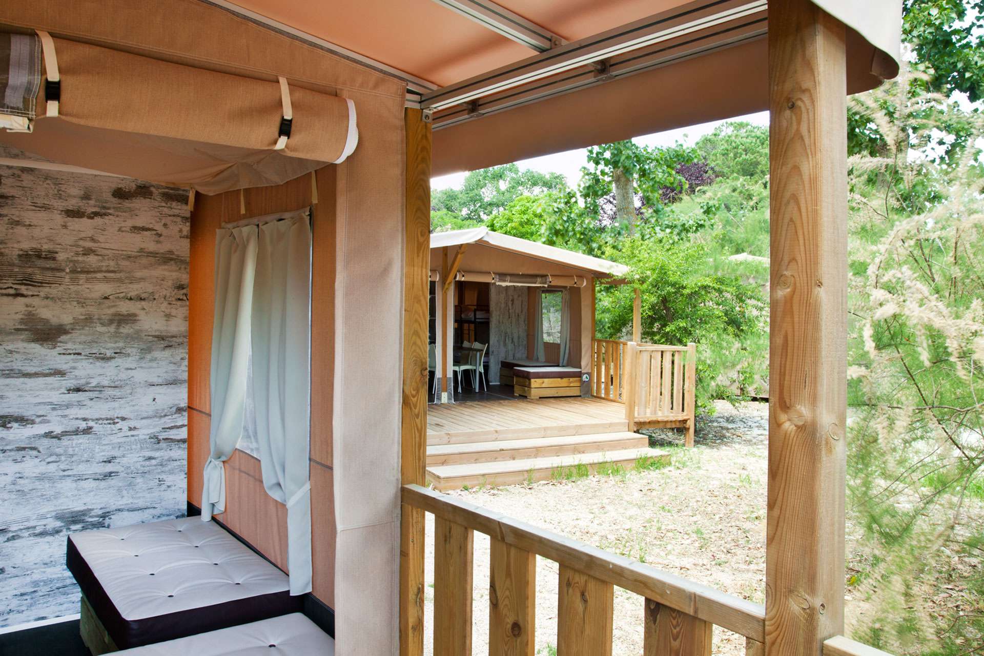 Les Lodge Tentes sont équipées de tous les conforts. Elles ont une chambre avec un confortable lit double, une deuxième chambre avec un lit simple et un lit superposé, un grand séjour avec coin cuisine et salle de bains avec douche et lavabo. La grande terrasse extérieure où vous pourrez vous détendre, devient une seule pièce avec le salon lorsque les rideaux antérieurs sont ouverts. Les murs en bois internes, aux couleurs naturelles, se marient bien avec le milieu environnant, entouré par la nature. Occupation max. 5 . carré: Intérieur – env. 25 m²; Véranda – env. 10 m² . Occupation maximale: 5 Personnes.