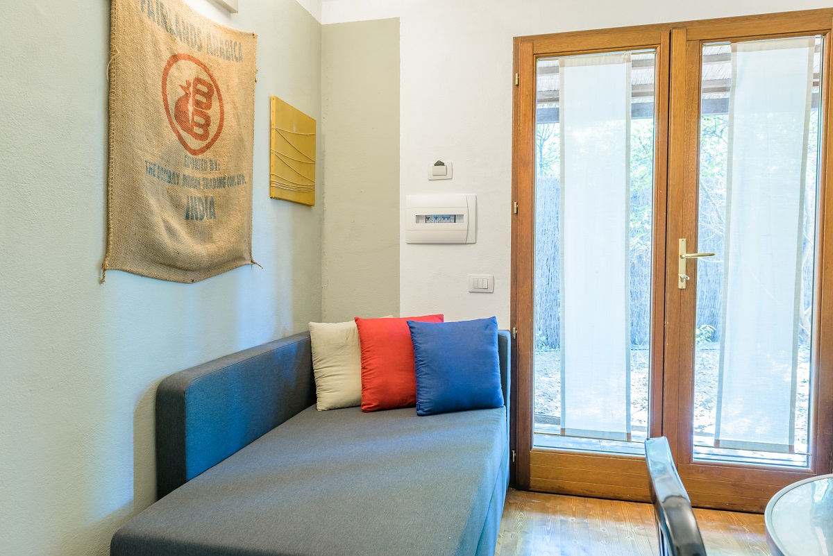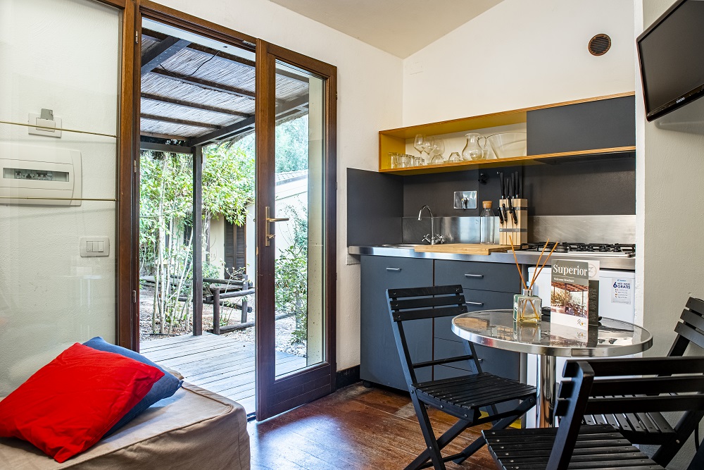 Salle de séjour avec canapé-lit (futon), kitchenette équipée avec réfrigérateur et vaisselle, chambre double, salle de bains avec WC, bidet, lavabo, douche, tv, climatisation (chaud/ froid), véranda couverte équipée avec des bancs en bois et une table. Wi-Fi gratuit.