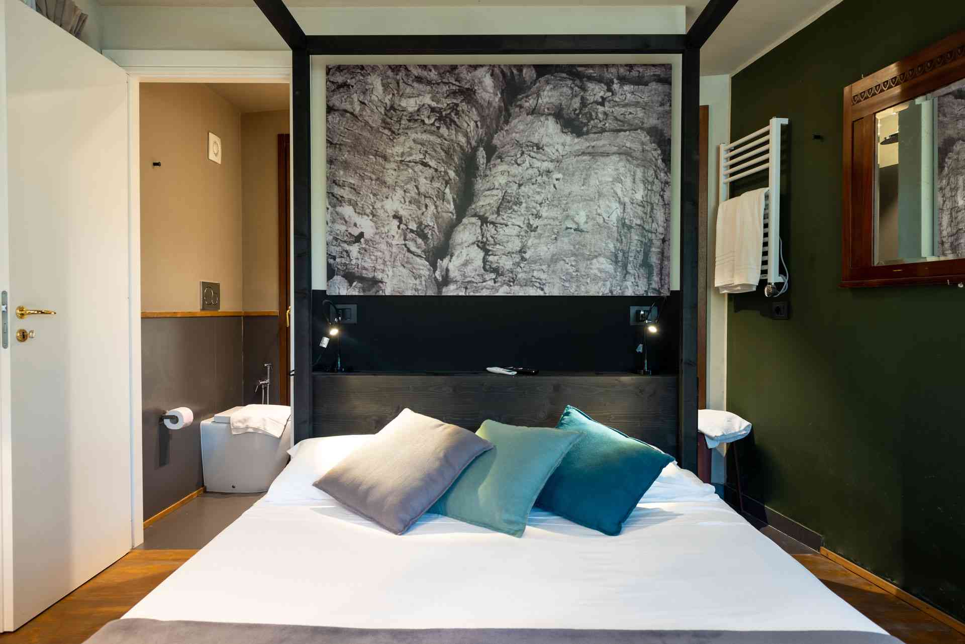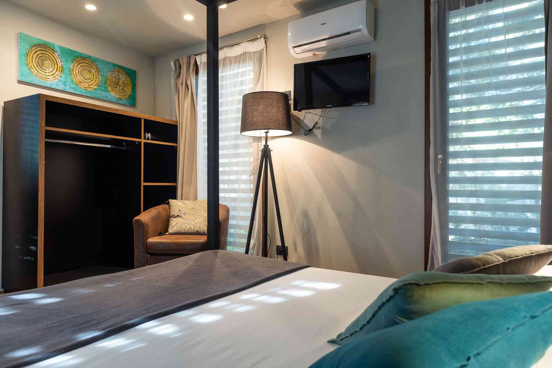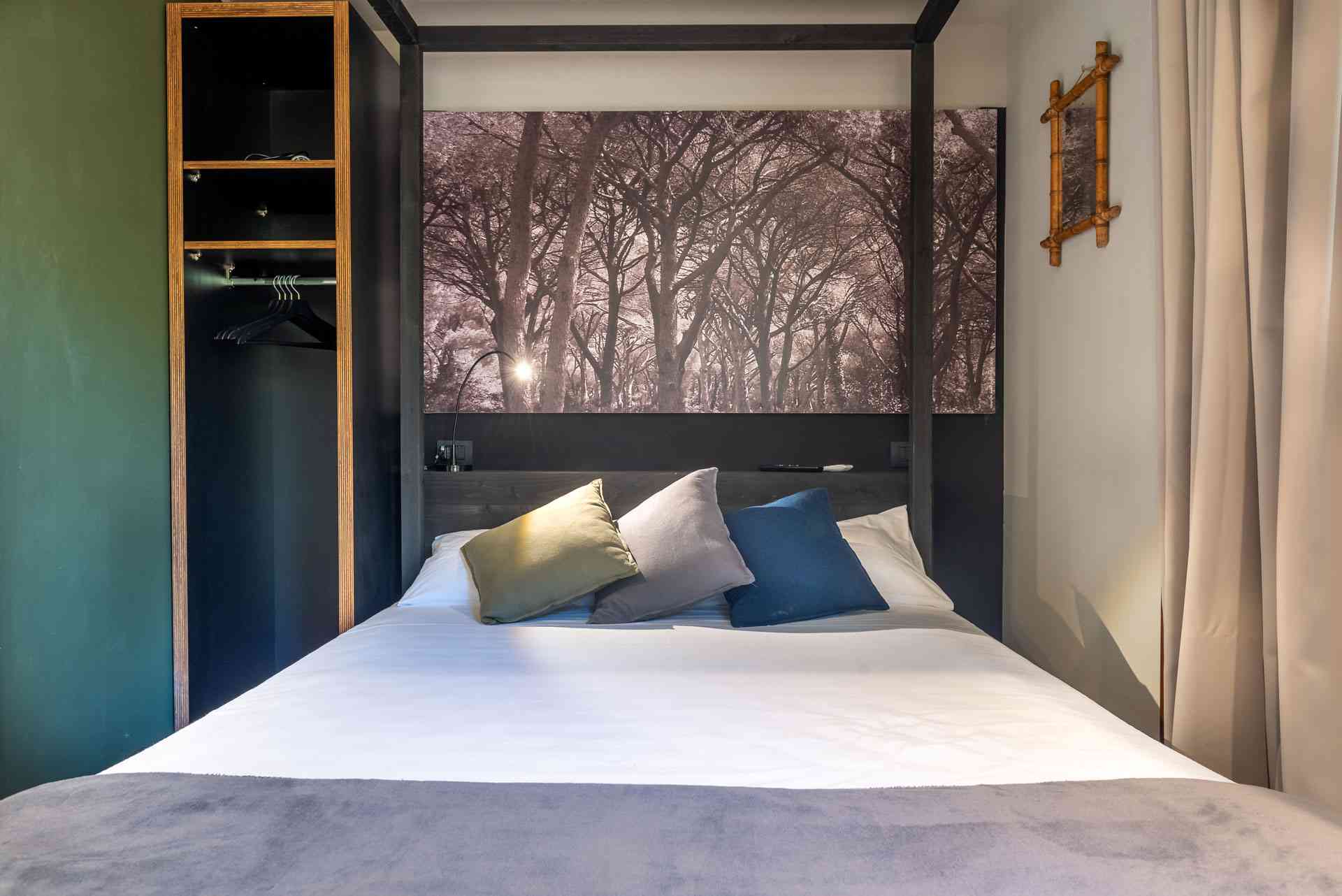 Bungalow Glam Roof pour 2 personnes, unique en son genre, est composé d'une chambre lumineuse avec un lit double à baldaquin, très moderne et élégant avec un mobilier glamour, une kitchenette équipée à l'intérieur, avec mini réfrigérateur, wc, lavabo, douche, TV et climatisation. A l'extérieur, sur le toit, vous pourrez profiter d'une spacieuse terrasse à aire ouverte caractérisée par des éléments innovants et du mobilier de jardin, pour apprécier une nouvelle expérience à deux pas de la mer.